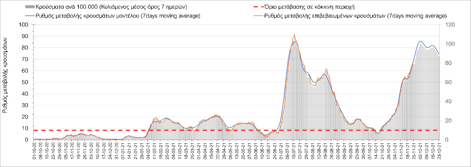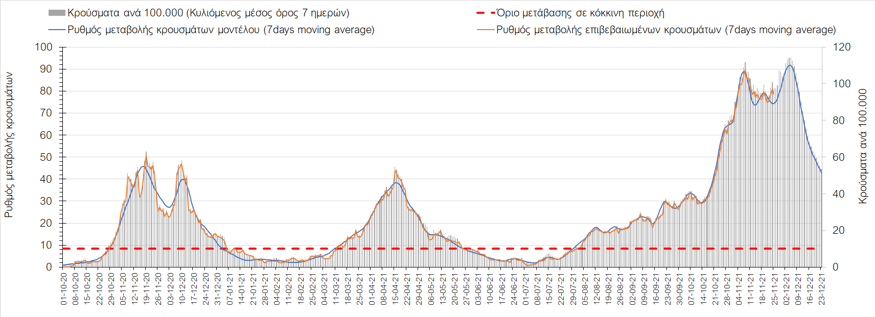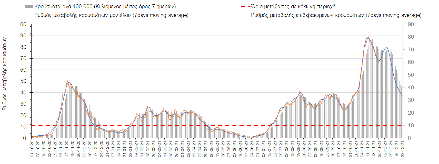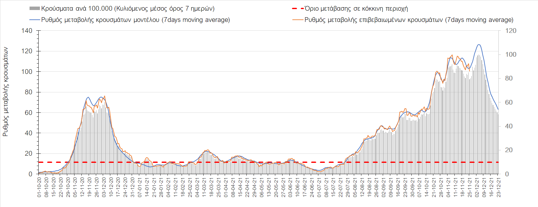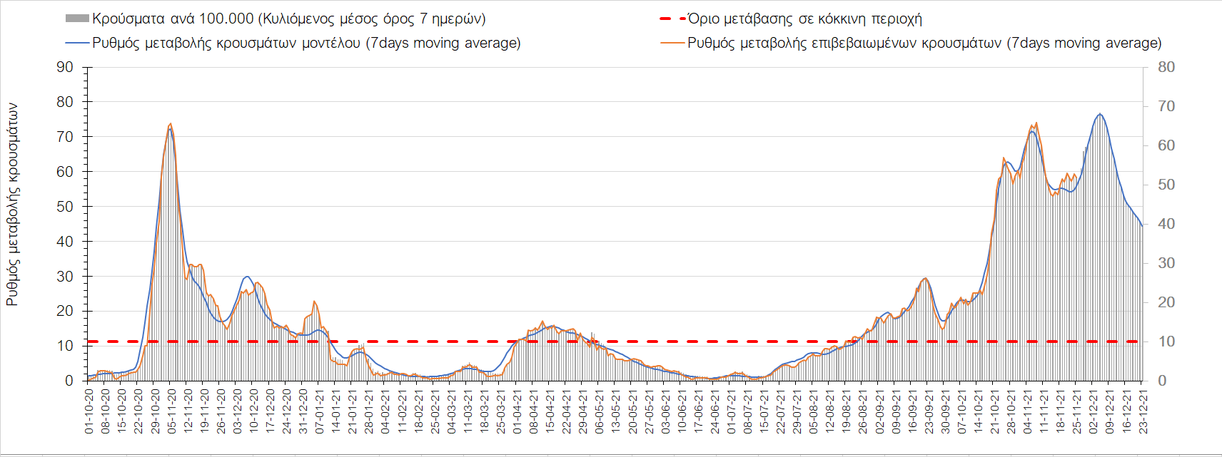 Η αποτύπωση των τάσεων στις επιμέρους περιοχές, παρουσιάζεται στο Σχήμα 61, όπου παρουσιάζεται ο ρυθμός μεταβολής των νέων κρουσμάτων ανά 100.000 κατοίκους (κυλιόμενος μέσος όρος 7 ημερών) των επιμέρους περιοχών. Θετικές τιμές του ρυθμού μεταβολής υποδηλώνουν άνοδο, ενώ αρνητικές τιμές υποδηλώνουν πτωτική πορεία. Το σχήμα αυτό είναι ιδιαίτερα κατατοπιστικό, γιατί οι τιμές που παρουσιάζονται είναι κανονικοποιημένες ως προς τον πληθυσμό, και η σύγκριση των τάσεων ανάμεσα στις επιμέρους περιοχές είναι άμεση.
