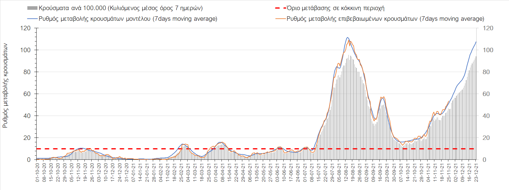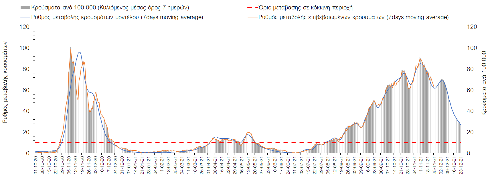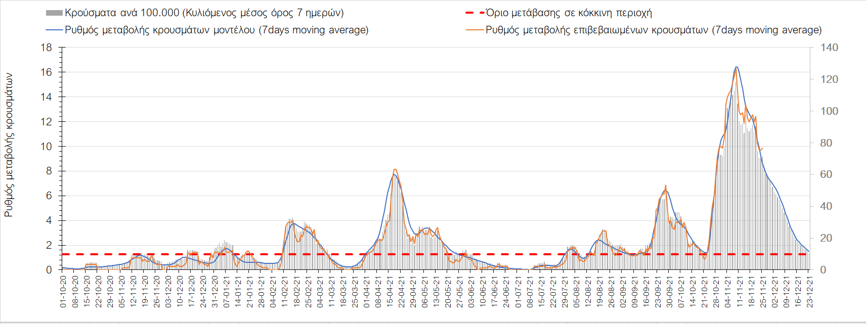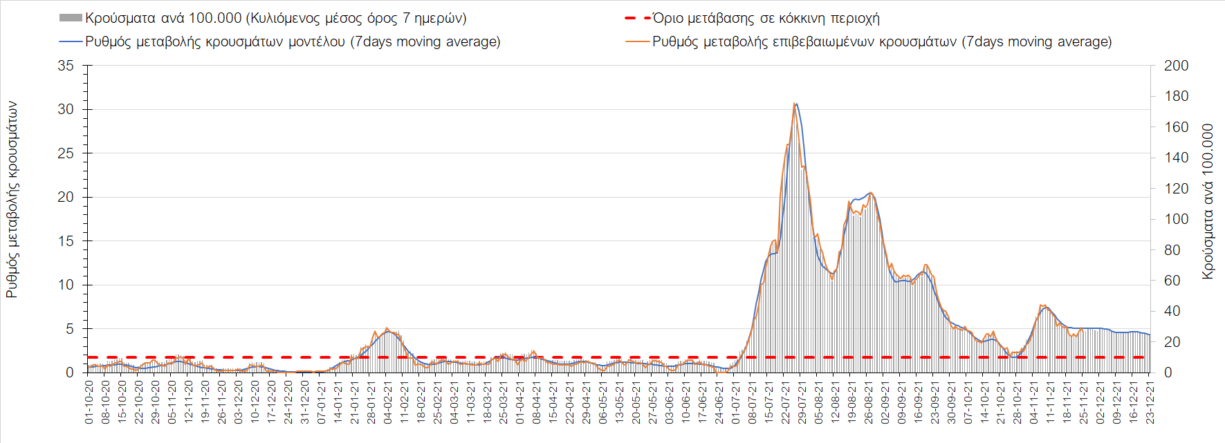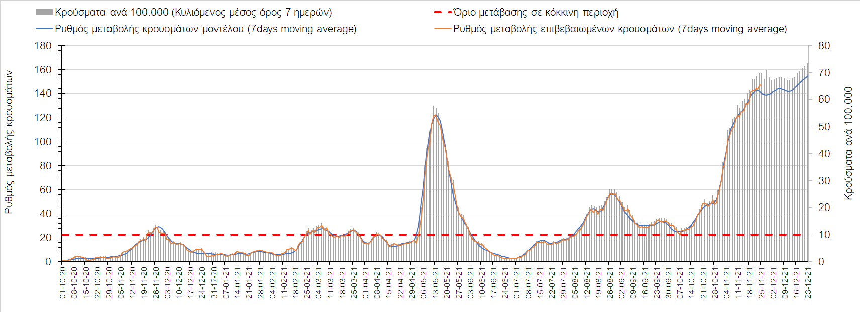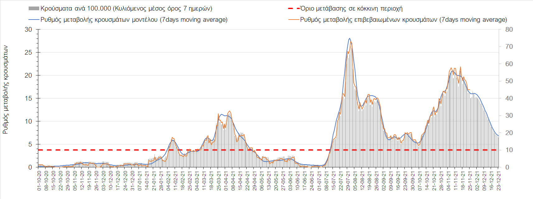 Η αποτύπωση των τάσεων στις επιμέρους περιοχές, παρουσιάζεται στο Σχήμα 61, όπου παρουσιάζεται ο ρυθμός μεταβολής των νέων κρουσμάτων ανά 100.000 κατοίκους (κυλιόμενος μέσος όρος 7 ημερών) των επιμέρους περιοχών. Θετικές τιμές του ρυθμού μεταβολής υποδηλώνουν άνοδο, ενώ αρνητικές τιμές υποδηλώνουν πτωτική πορεία. Το σχήμα αυτό είναι ιδιαίτερα κατατοπιστικό, γιατί οι τιμές που παρουσιάζονται είναι κανονικοποιημένες ως προς τον πληθυσμό, και η σύγκριση των τάσεων ανάμεσα στις επιμέρους περιοχές είναι άμεση.