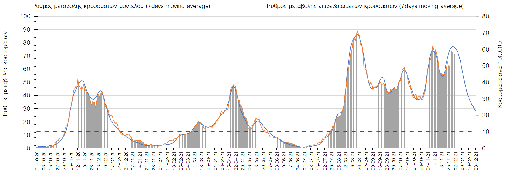 - πιθανώς αρχίζει να γίνεται πιο έντονη η επίδραση της απώλειας της ανοσίας από ήδη εμβολιασμένους στους οποίους έχει παρέλθει το εξάμηνο από το δεύτερο εμβολιασμό. Αυτή η παράμετρος, θα αποδειχθεί καθοριστική για την αποκλιμάκωση που προβλέπουμε μετά τις αρχές Δεκεμβρίου, και πιθανότατα να δημιουργηθεί επόμενο κύμα ή παράταση του ιδίου, στην περίπτωση που δεν προχωρήσουν οι αναμνηστικές δόσεις κι αρχίσει να υποχωρεί ξανά το τείχος ανοσίας που έχει ήδη δημιουργηθεί.