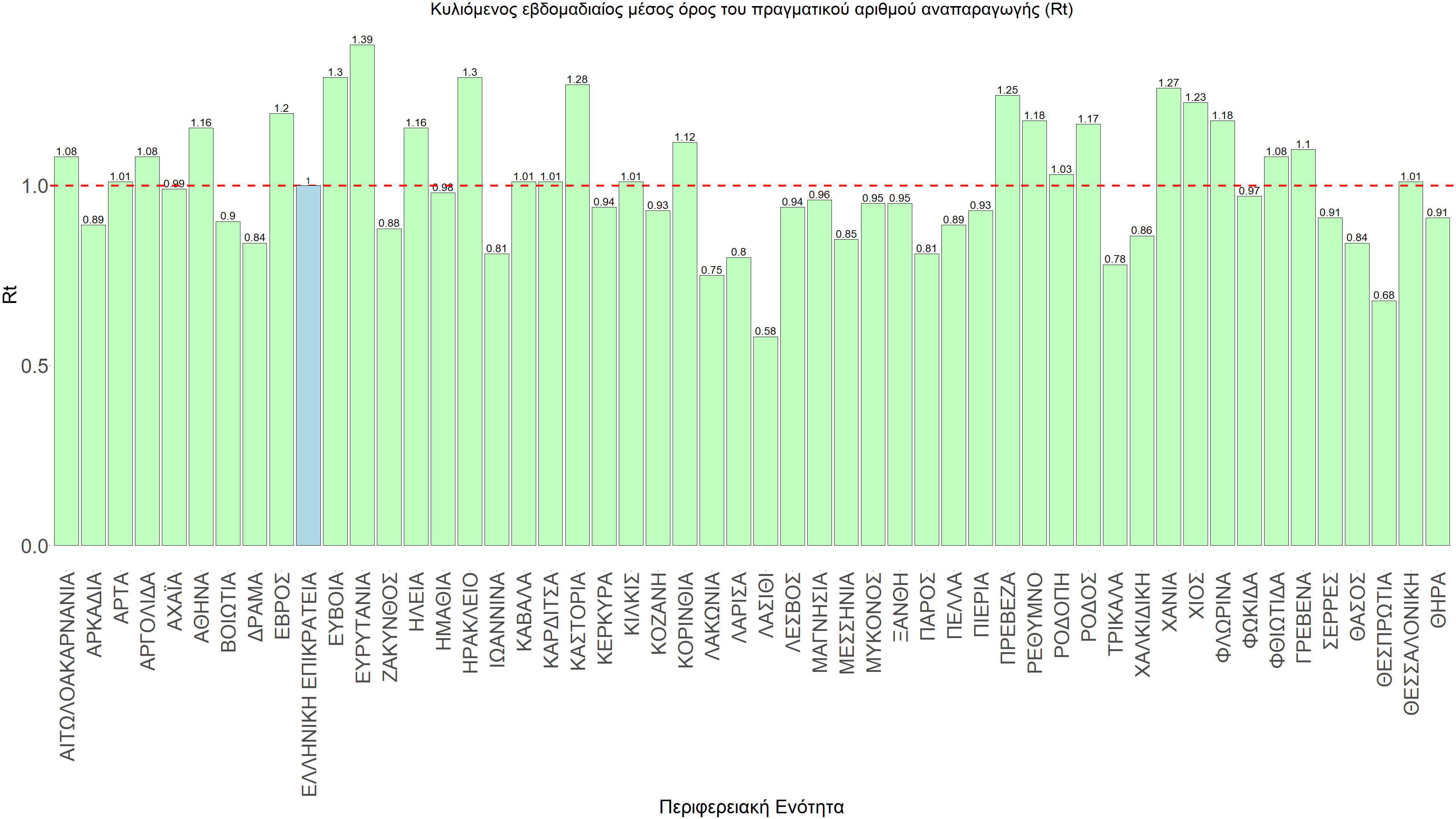 O πραγματικός αριθμός αναπαραγωγής Rt ανά περιφερειακή ενότητα της χώρας παρουσιάζεται στο Σχήμα 58.