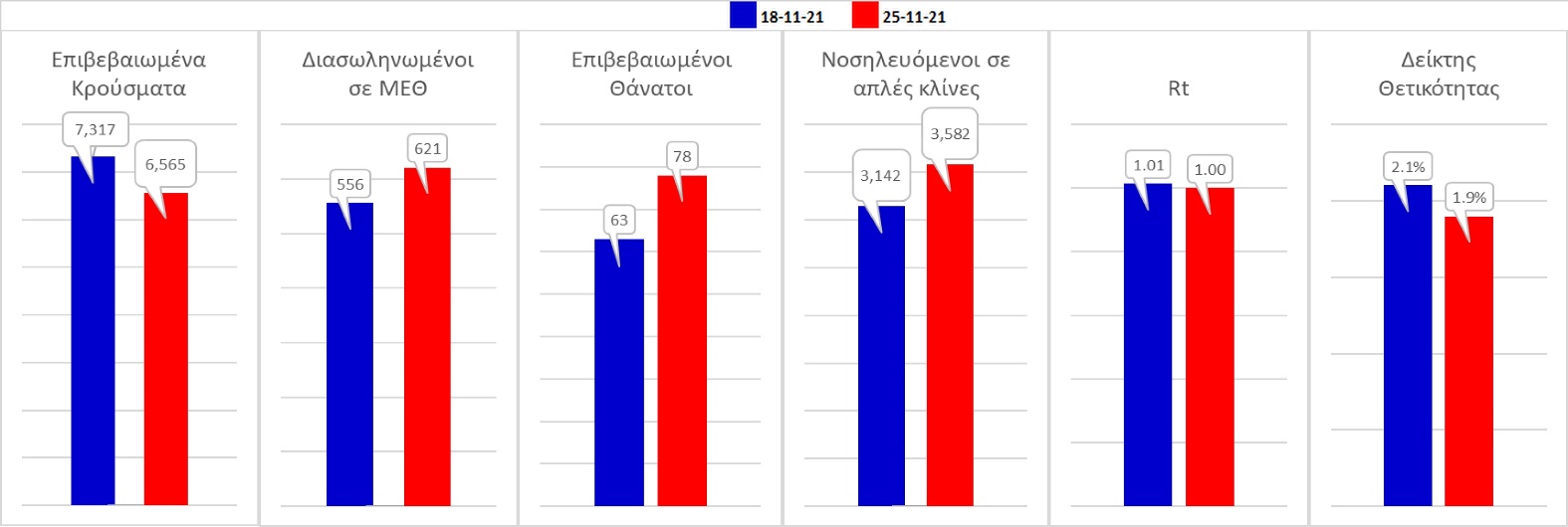 Σχήμα 59. Συγκριτικά αποτελέσματα της επιδημιολογικής εικόνας της σημερινής Πέμπτης (25/11/2021) σε σχέση με το προηγούμενο (18/11/2021)