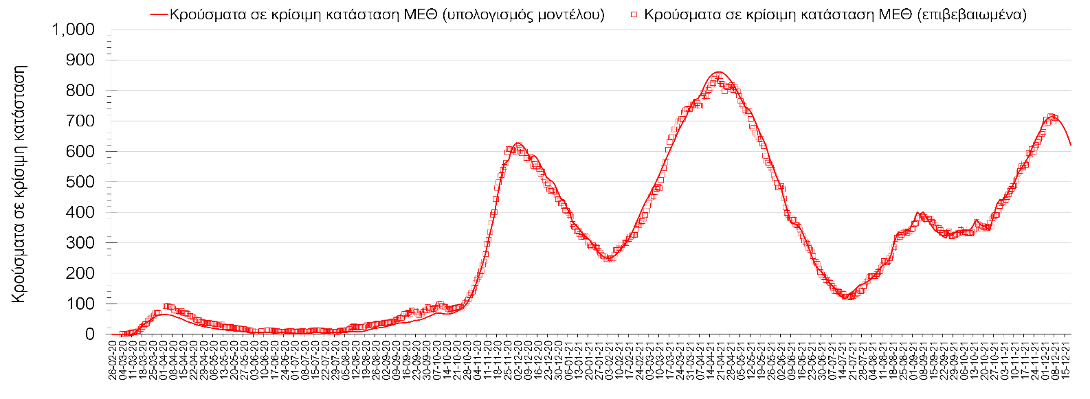 Η πορεία της μέσης εβδομαδιαίας τιμής των κρουσμάτων, καθώς και του κυλιόμενου μέσου όρου 7 ημερών του αριθμού των κρουσμάτων ανά 100.000 πληθυσμού, όπως έχουν καταγραφεί από τον ΕΟΔΥ και η αναμενόμενη πορεία τους όπως προδιαγράφεται από την υπολογιστική πλατφόρμα CORE για την Ελληνική επικράτεια μέχρι τις 15 Δεκεμβρίου, αποτυπώνονται στο Σχήμα 4. Αυτή η προβλεπόμενη πορεία, που αφορά τα κρούσματα, τους νοσηλευόμενους σε απλές κλίνες, όσο και σε ΜΕΘ, καθώς επίσης και τους θανάτους, βασίζεται στις ακόλουθες παραδοχές: