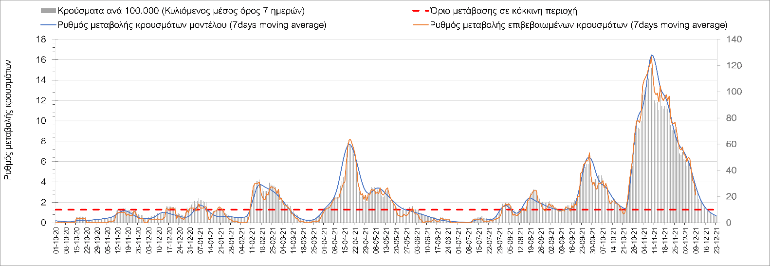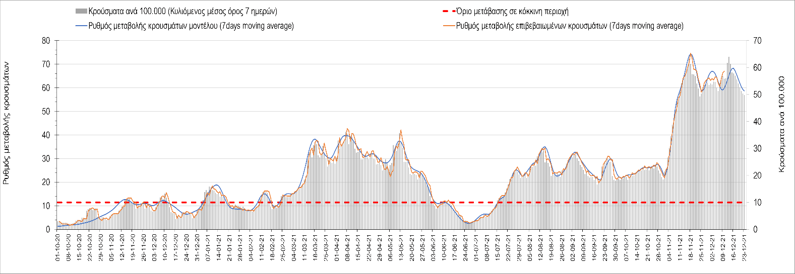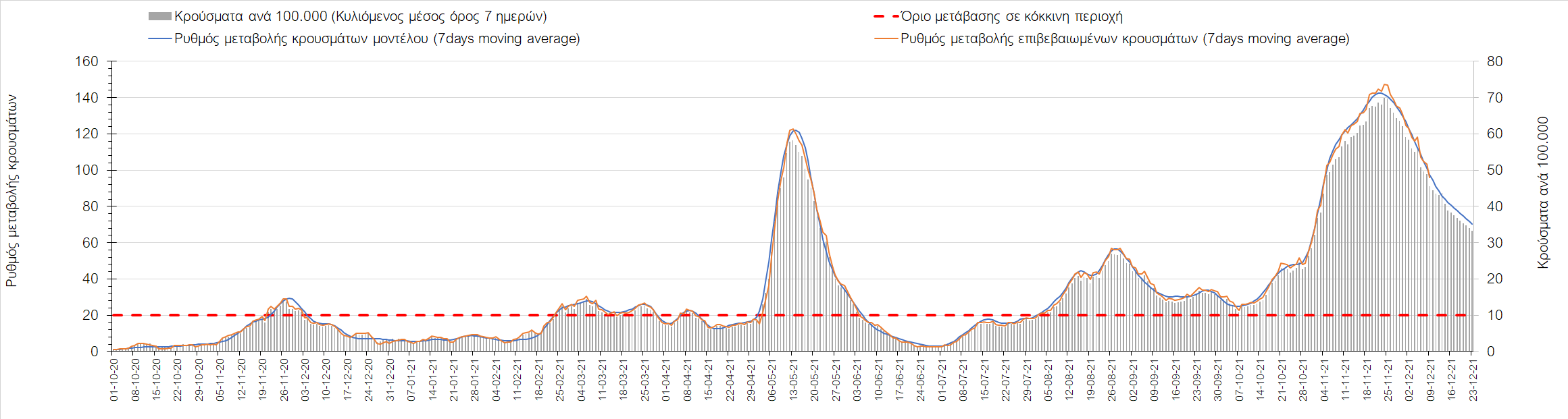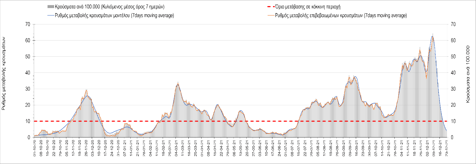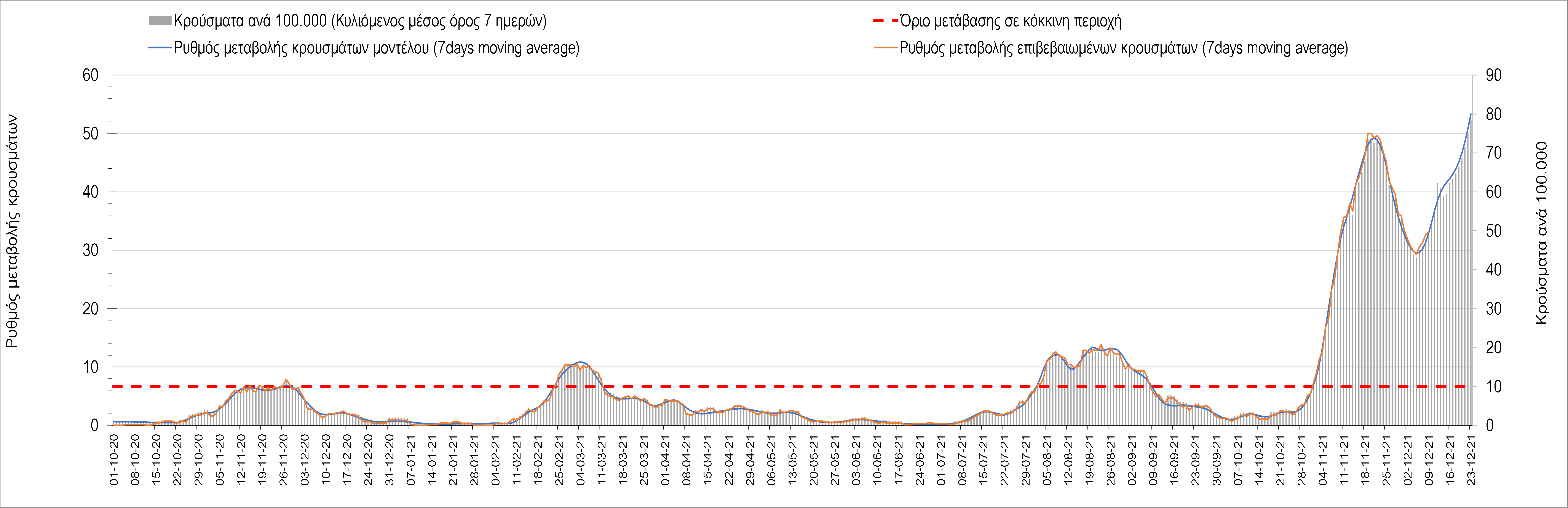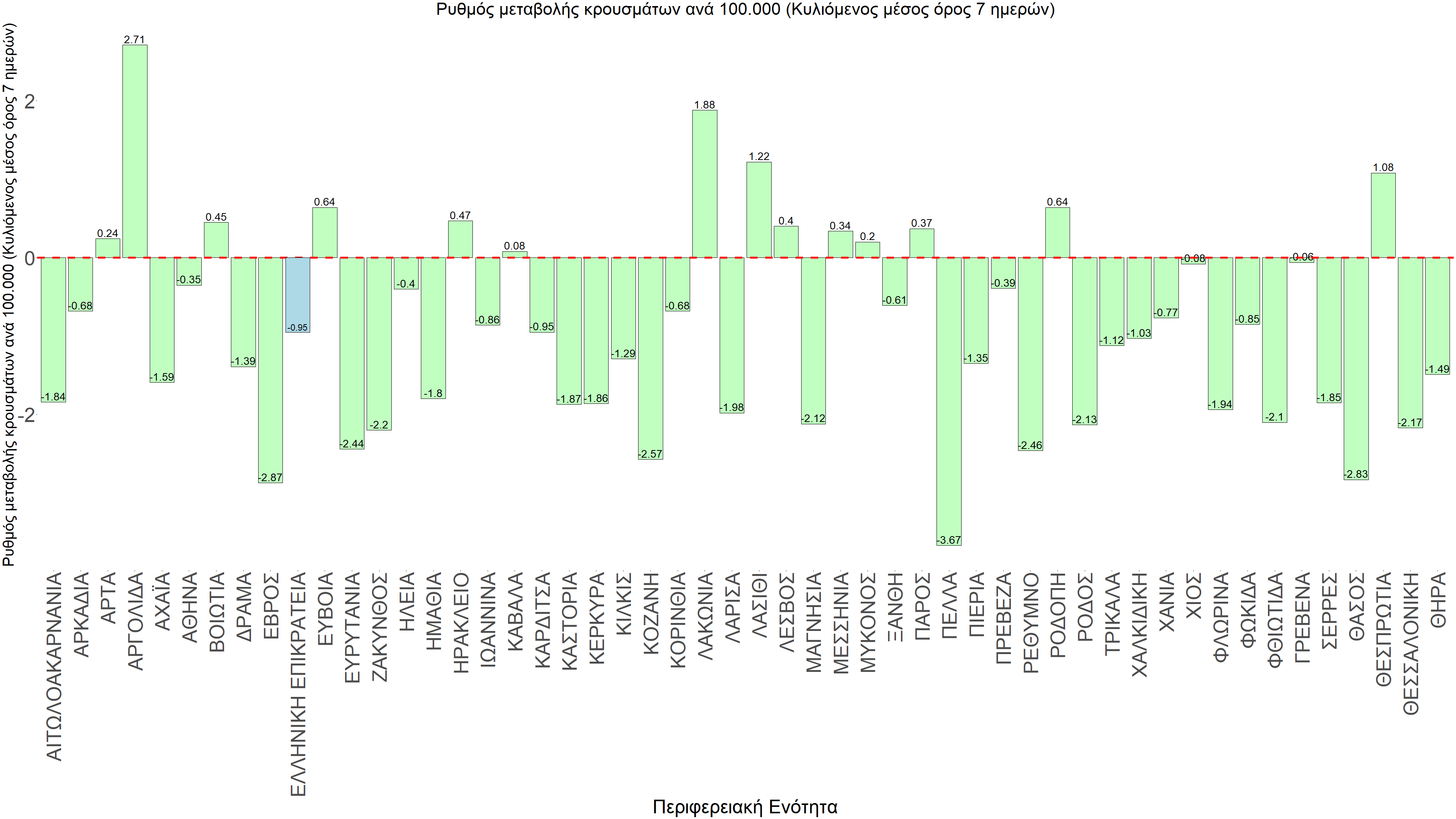 Η αποτύπωση των τάσεων στις επιμέρους περιοχές, παρουσιάζεται στο Σχήμα 61, όπου παρουσιάζεται ο ρυθμός μεταβολής των νέων κρουσμάτων ανά 100.000 κατοίκους (κυλιόμενος μέσος όρος 7 ημερών) των επιμέρους περιοχών. Θετικές τιμές του ρυθμού μεταβολής υποδηλώνουν άνοδο, ενώ αρνητικές τιμές υποδηλώνουν πτωτική πορεία. Το σχήμα αυτό είναι ιδιαίτερα κατατοπιστικό, γιατί οι τιμές που παρουσιάζονται είναι κανονικοποιημένες ως προς τον πληθυσμό, και η σύγκριση των τάσεων ανάμεσα στις επιμέρους περιοχές είναι άμεση.
