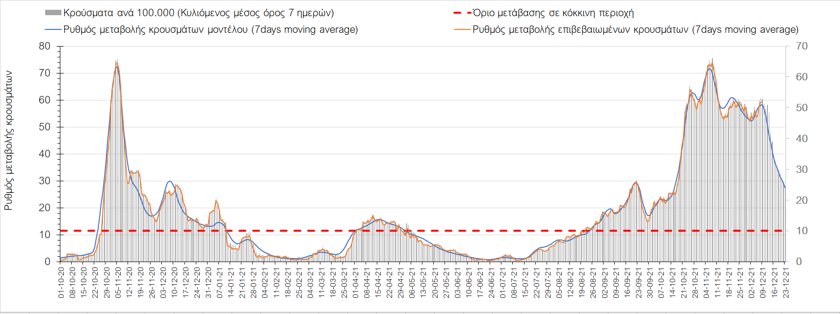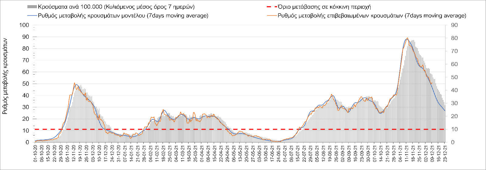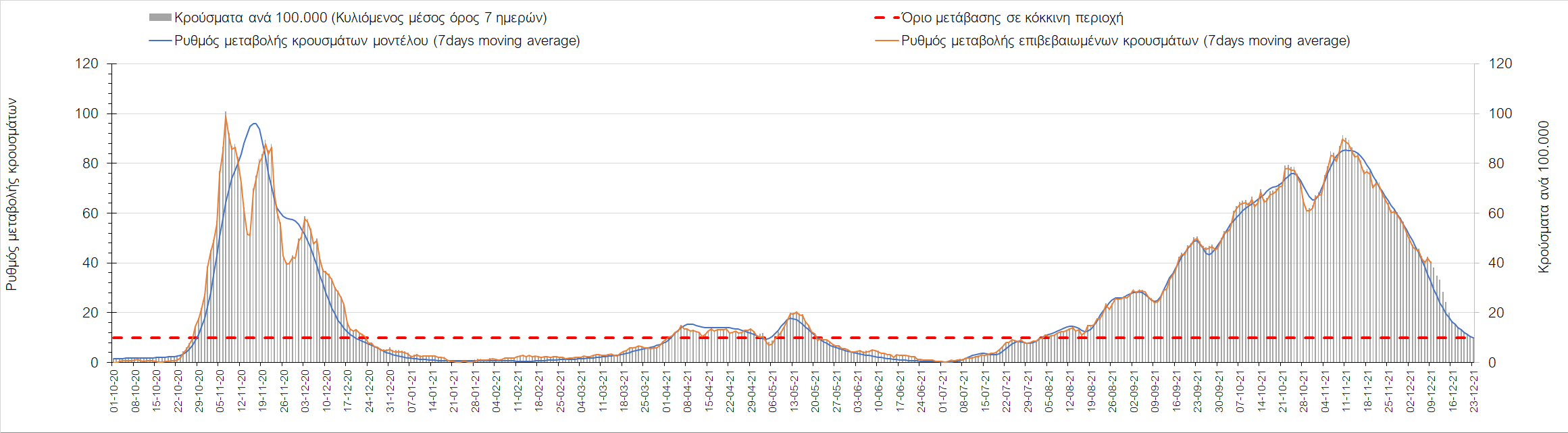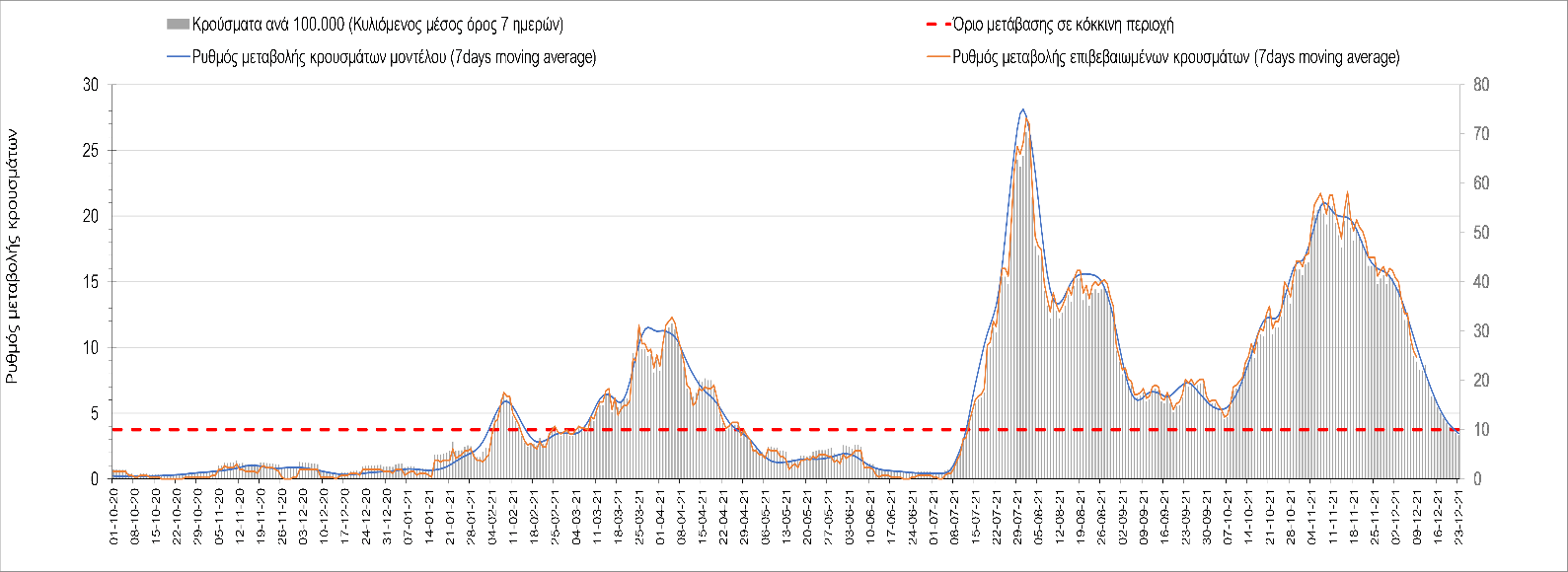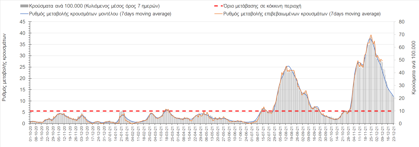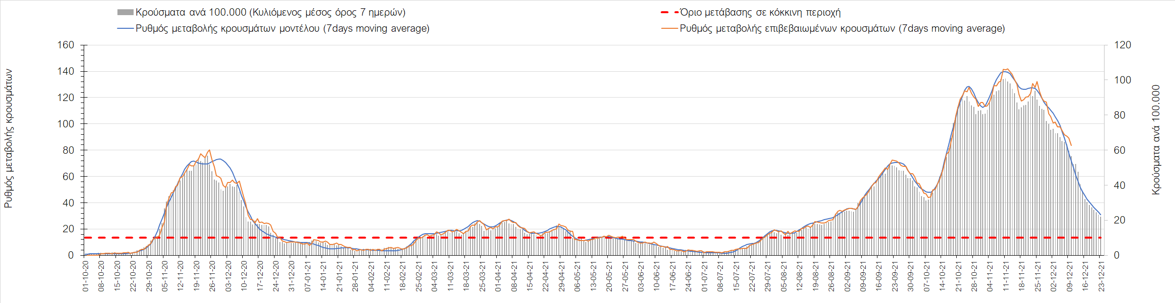 Η αποτύπωση των τάσεων στις επιμέρους περιοχές, παρουσιάζεται στο Σχήμα 61, όπου παρουσιάζεται ο ρυθμός μεταβολής των νέων κρουσμάτων ανά 100.000 κατοίκους (κυλιόμενος μέσος όρος 7 ημερών) των επιμέρους περιοχών. Θετικές τιμές του ρυθμού μεταβολής υποδηλώνουν άνοδο, ενώ αρνητικές τιμές υποδηλώνουν πτωτική πορεία. Το σχήμα αυτό είναι ιδιαίτερα κατατοπιστικό, γιατί οι τιμές που παρουσιάζονται είναι κανονικοποιημένες ως προς τον πληθυσμό, και η σύγκριση των τάσεων ανάμεσα στις επιμέρους περιοχές είναι άμεση.