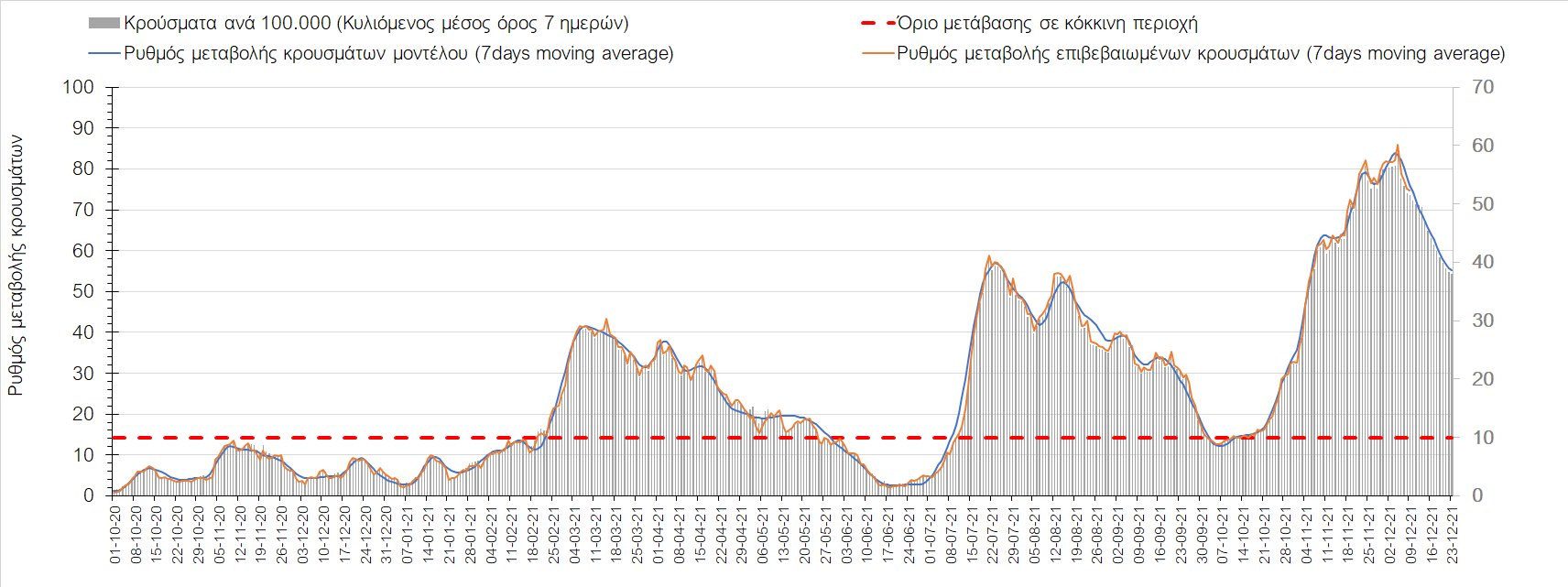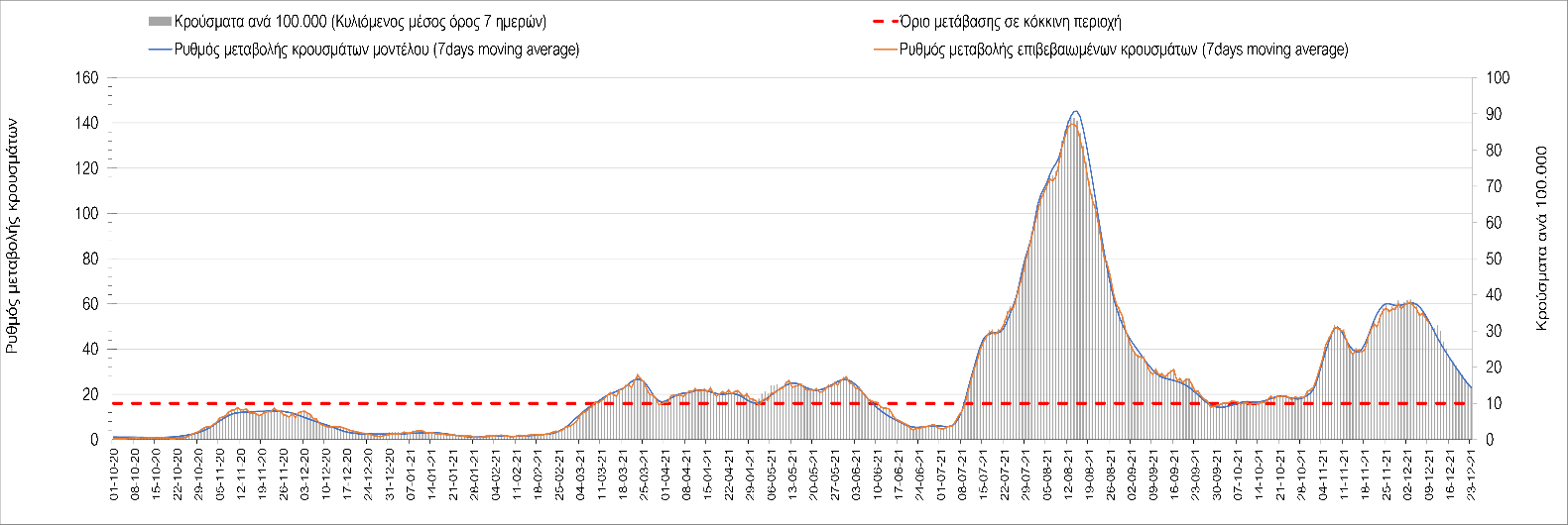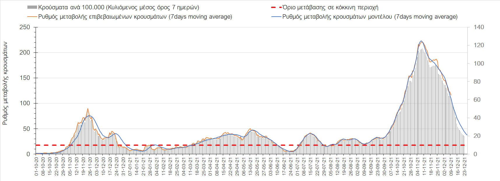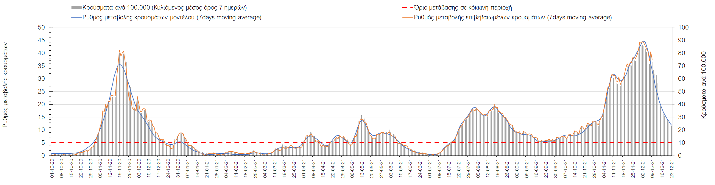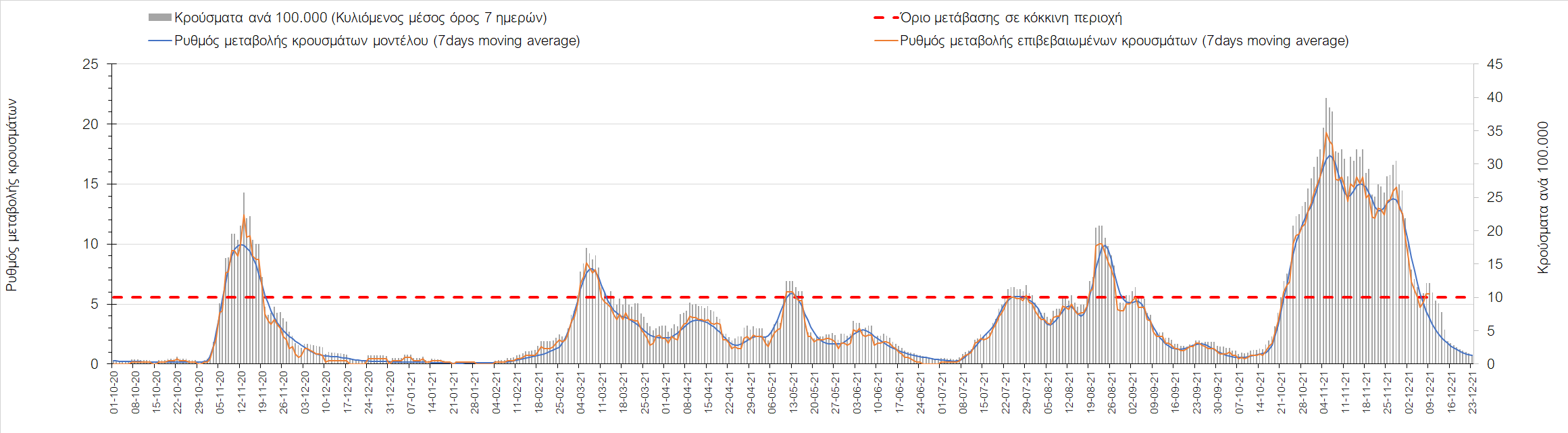 Η αποτύπωση των τάσεων στις επιμέρους περιοχές, παρουσιάζεται στο Σχήμα 61, όπου παρουσιάζεται ο ρυθμός μεταβολής των νέων κρουσμάτων ανά 100.000 κατοίκους (κυλιόμενος μέσος όρος 7 ημερών) των επιμέρους περιοχών. Θετικές τιμές του ρυθμού μεταβολής υποδηλώνουν άνοδο, ενώ αρνητικές τιμές υποδηλώνουν πτωτική πορεία. Το σχήμα αυτό είναι ιδιαίτερα κατατοπιστικό, γιατί οι τιμές που παρουσιάζονται είναι κανονικοποιημένες ως προς τον πληθυσμό, και η σύγκριση των τάσεων ανάμεσα στις επιμέρους περιοχές είναι άμεση.