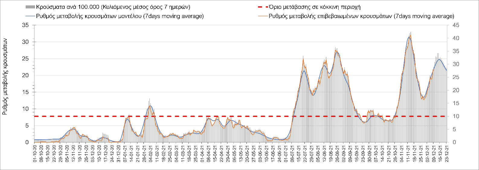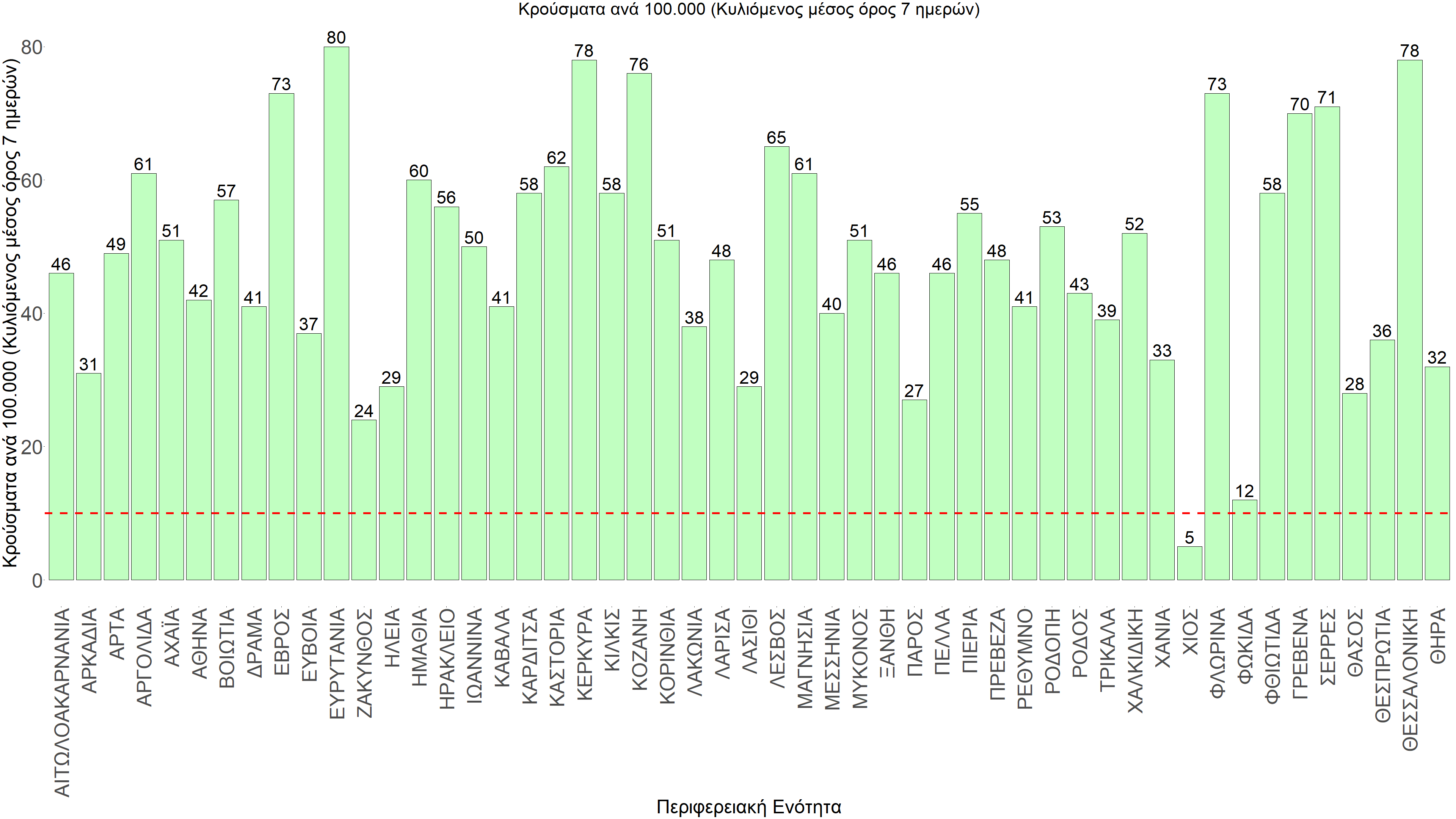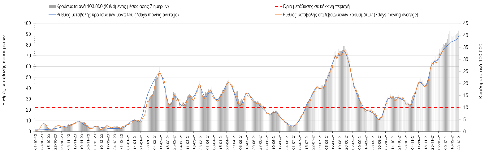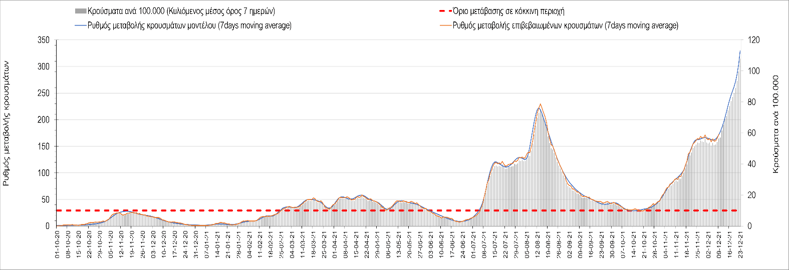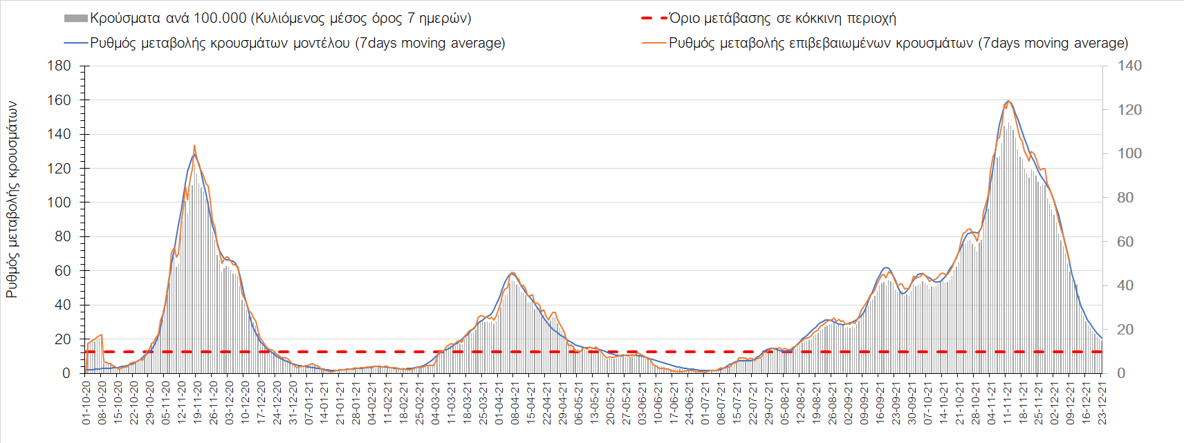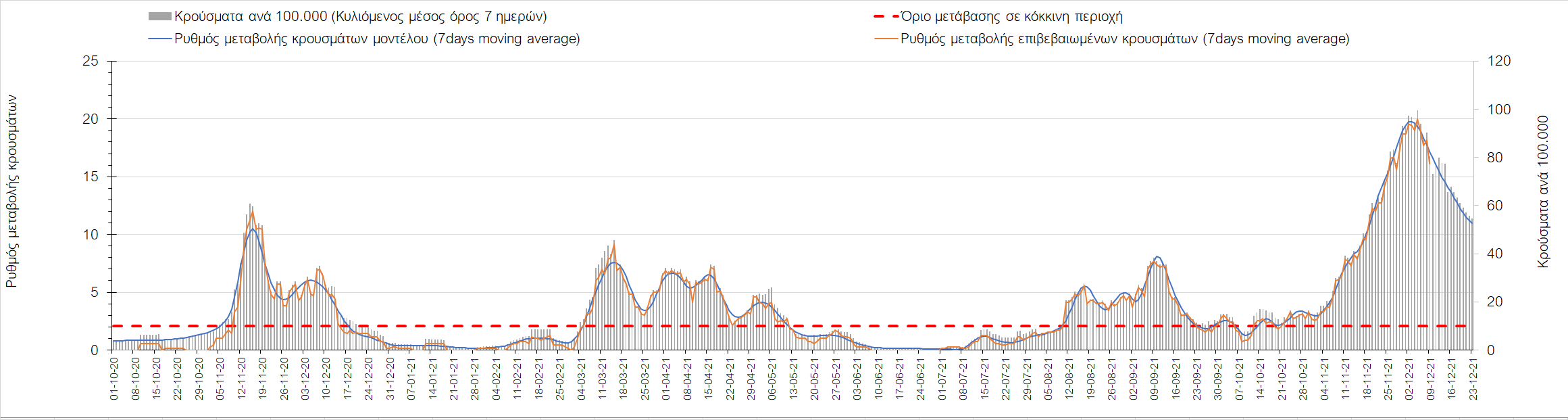 Η αποτύπωση των τάσεων στις επιμέρους περιοχές, παρουσιάζεται στο Σχήμα 61, όπου παρουσιάζεται ο ρυθμός μεταβολής των νέων κρουσμάτων ανά 100.000 κατοίκους (κυλιόμενος μέσος όρος 7 ημερών) των επιμέρους περιοχών. Θετικές τιμές του ρυθμού μεταβολής υποδηλώνουν άνοδο, ενώ αρνητικές τιμές υποδηλώνουν πτωτική πορεία. Το σχήμα αυτό είναι ιδιαίτερα κατατοπιστικό, γιατί οι τιμές που παρουσιάζονται είναι κανονικοποιημένες ως προς τον πληθυσμό, και η σύγκριση των τάσεων ανάμεσα στις επιμέρους περιοχές είναι άμεση.