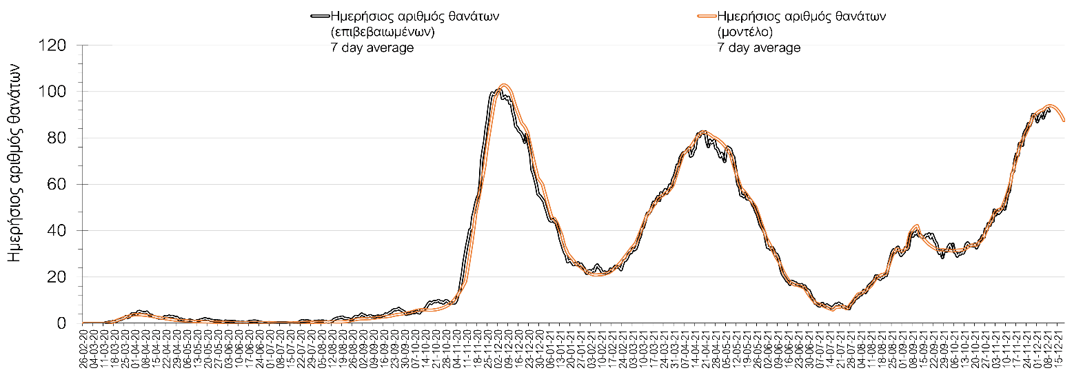 Σχήμα 3. Αριθμός θανάτων (κυλιόμενος μέσος όρος 7 ημερών) σύμφωνα με τα στοιχεία του ΕΟΔΥ και τις προβλέψεις της υπολογιστικής πλατφόρμας CORE.