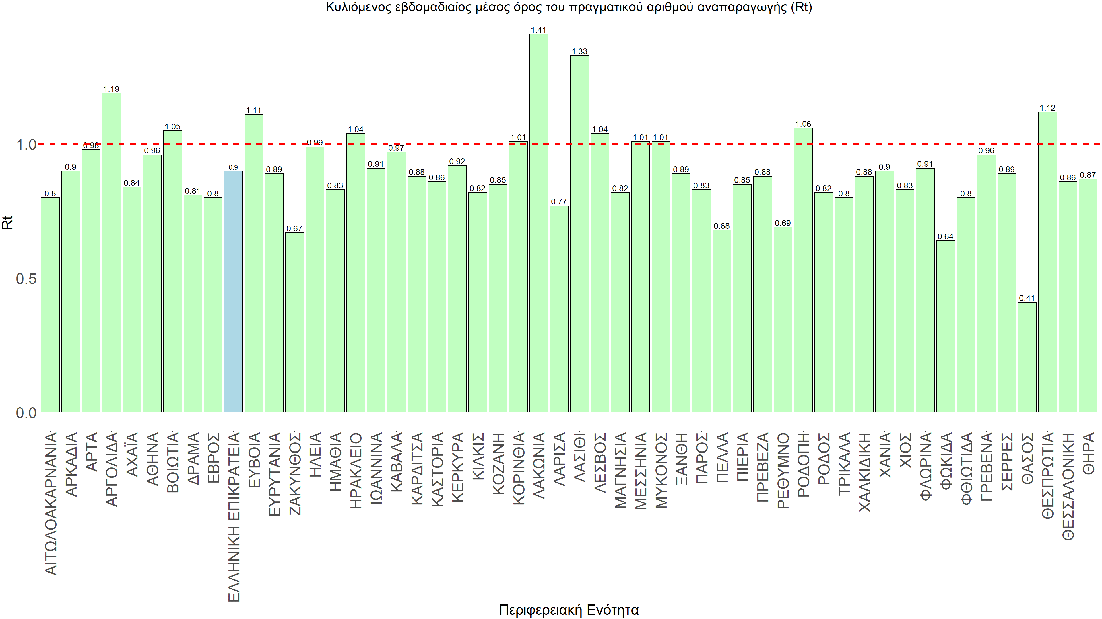 O πραγματικός αριθμός αναπαραγωγής Rt ανά περιφερειακή ενότητα της χώρας παρουσιάζεται στο Σχήμα 58.
