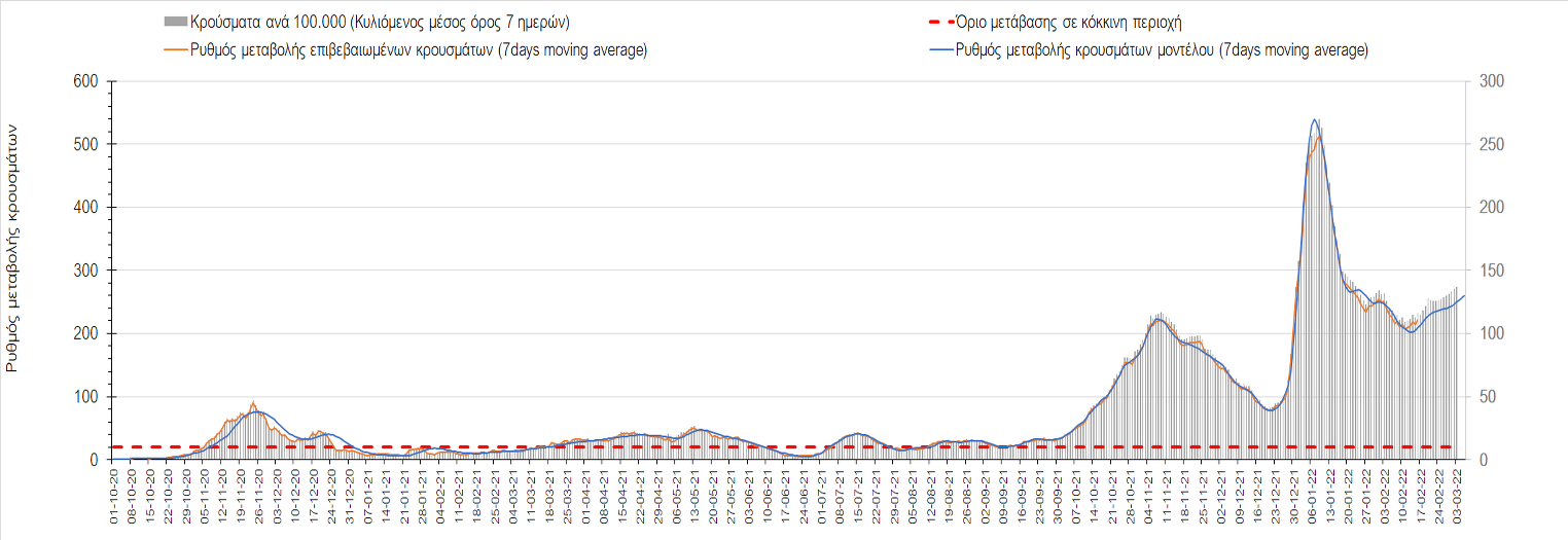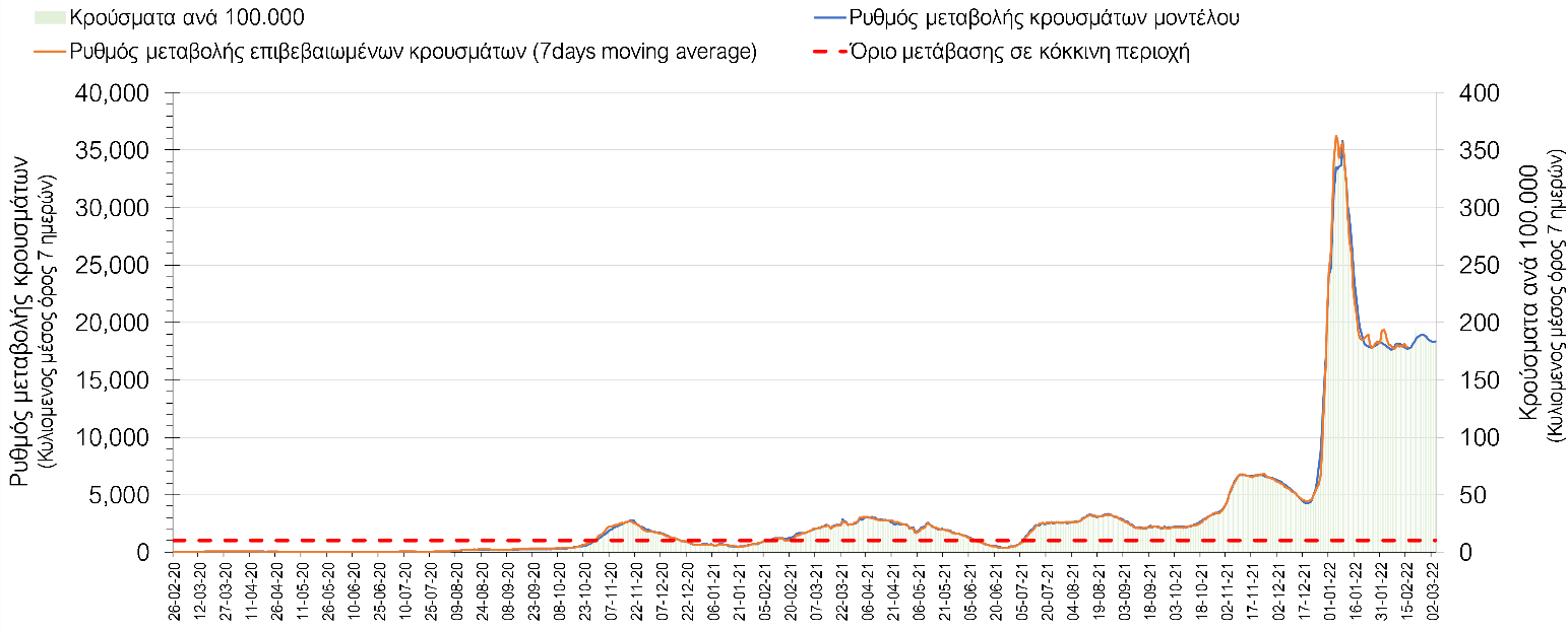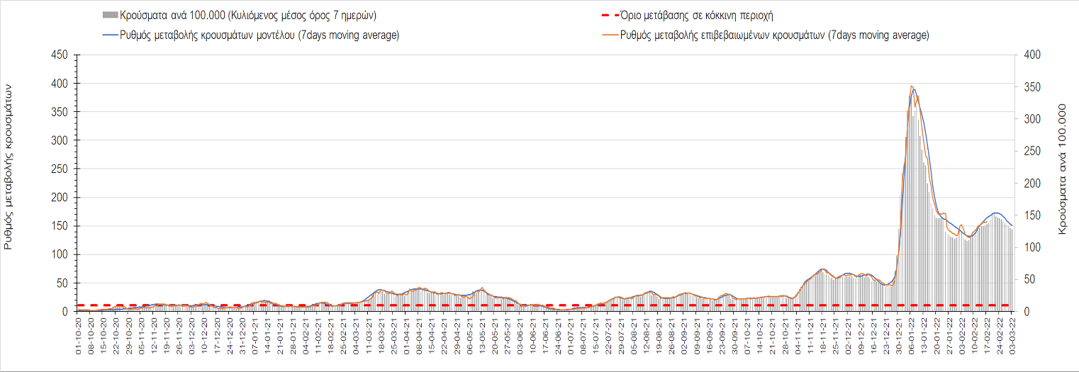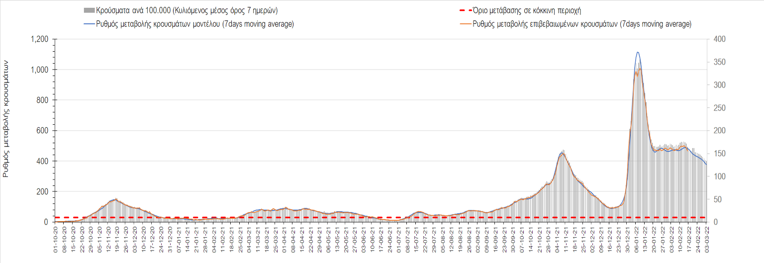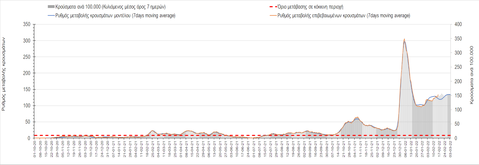 “Η κατάσταση της διασποράς παραμένει σταθερή, σε κατάσταση δυναμικής ισορροπίας. Η χαλάρωση των μέτρων και ειδικότερα η μείωση του ποσοστού τηλε-εργασίας στο 20% από το 50% στον ιδιωτικό και δημόσιο τομέα προβλέπεται να παρατείνει την κατάσταση αυτή μέχρι τις 25 Μαρτίου, απομακρύνοντας την προοπτική ουσιαστικής αποκλιμάκωσης αν δεν αυξηθεί ο ρυθμός εμβολιασμού με την αναμνηστική δόση” αναφέρει ο κ. Σαρηγιάννης.