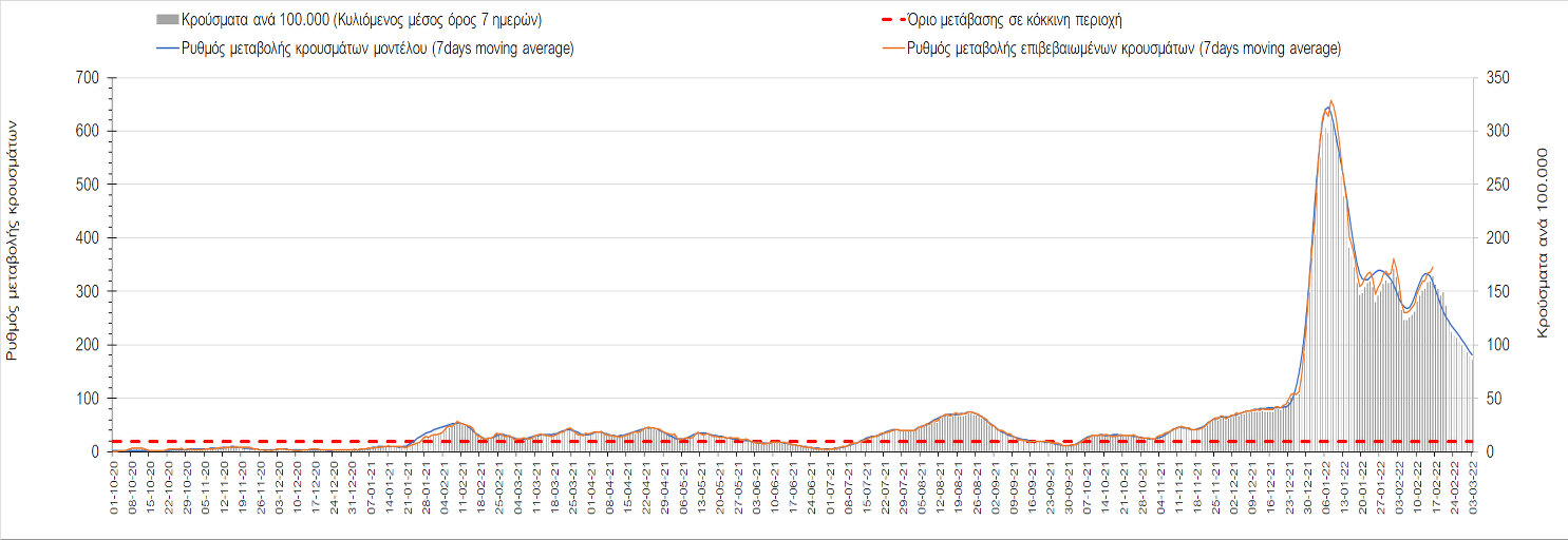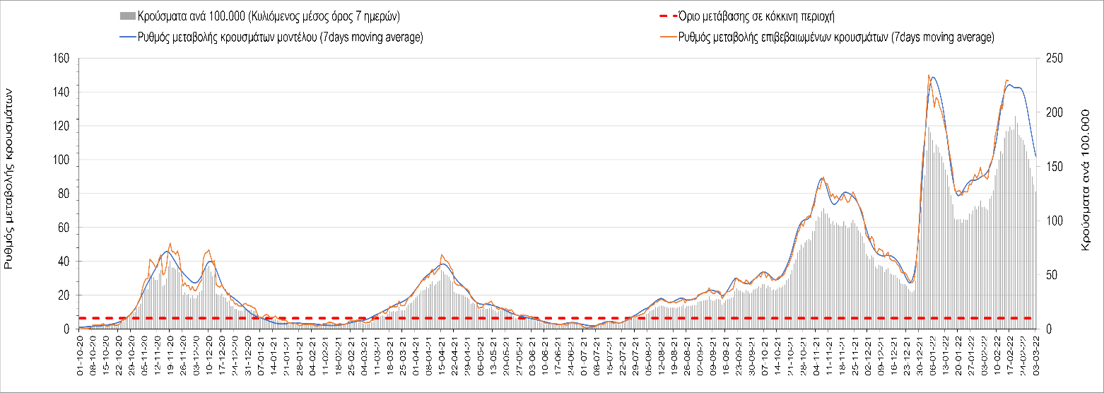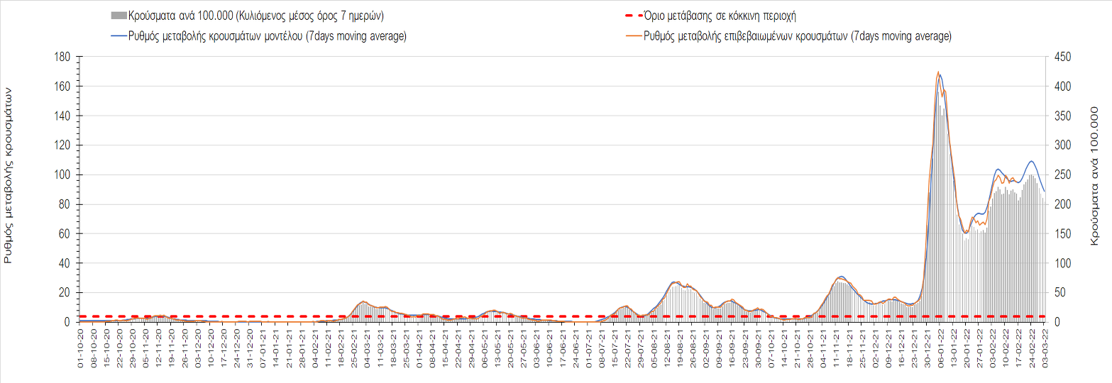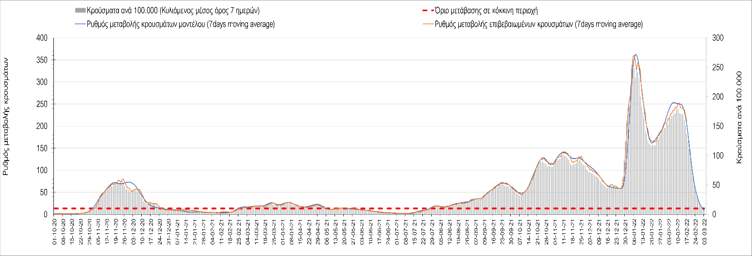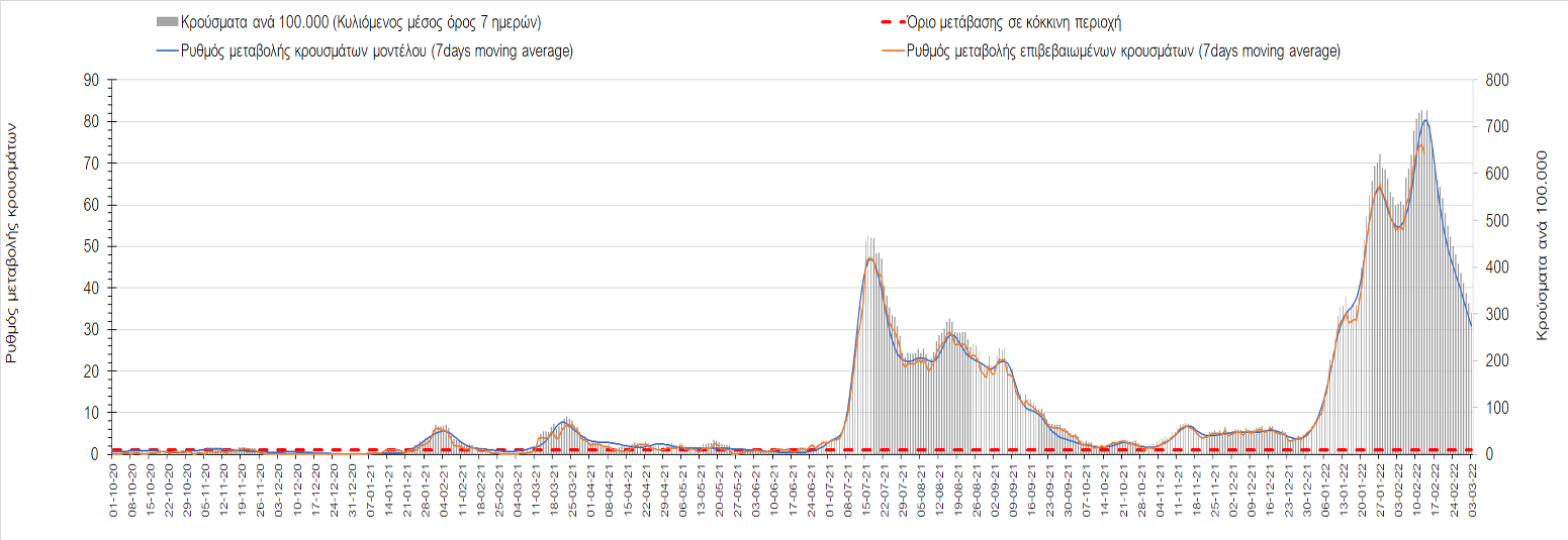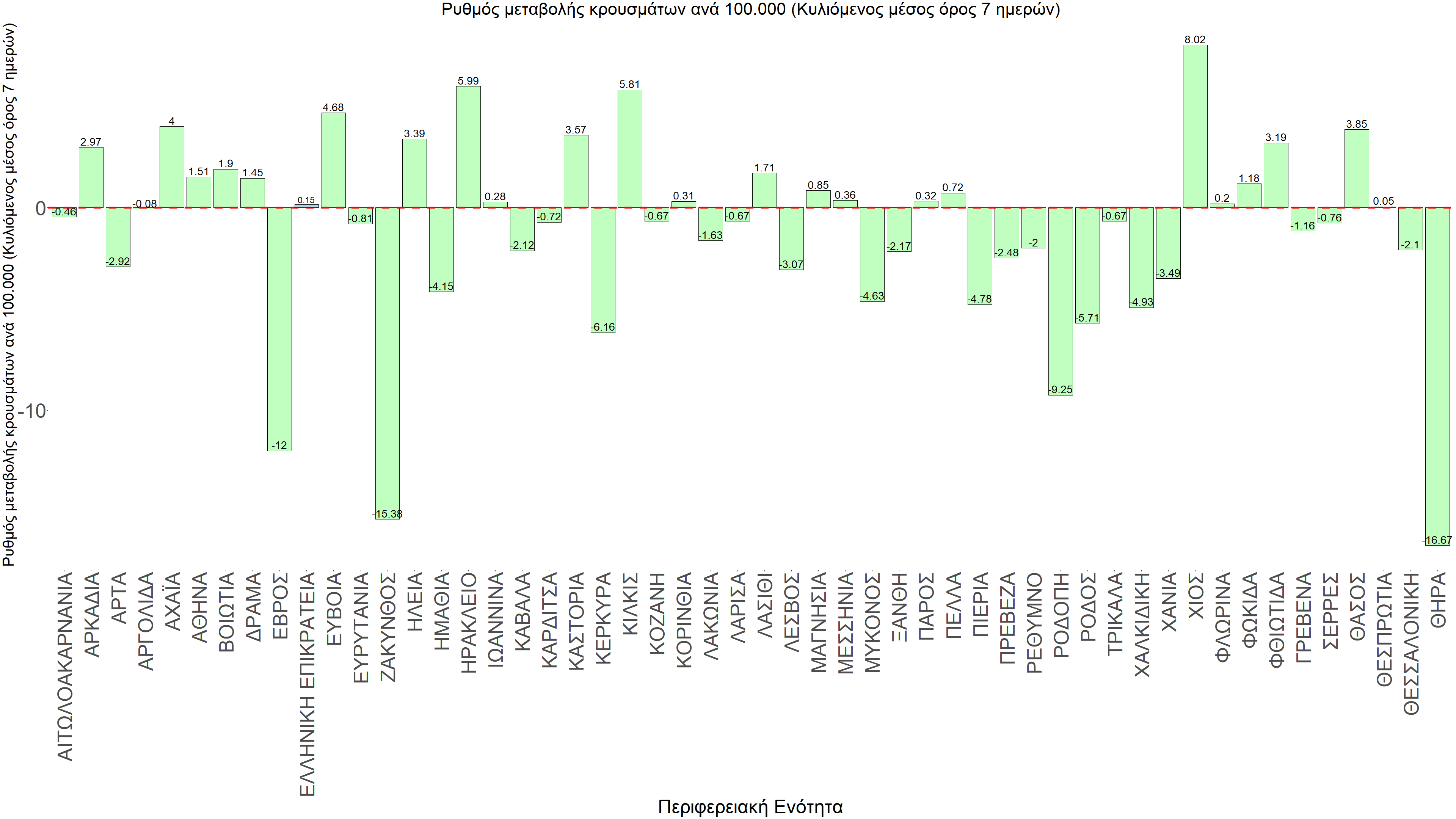 Η αποτύπωση των τάσεων στις επιμέρους περιοχές, παρουσιάζεται στο Σχήμα 61, όπου παρουσιάζεται ο ρυθμός μεταβολής των νέων κρουσμάτων ανά 100.000 κατοίκους (κυλιόμενος μέσος όρος 7 ημερών) των επιμέρους περιοχών. Θετικές τιμές του ρυθμού μεταβολής υποδηλώνουν άνοδο, ενώ αρνητικές τιμές υποδηλώνουν πτωτική πορεία.