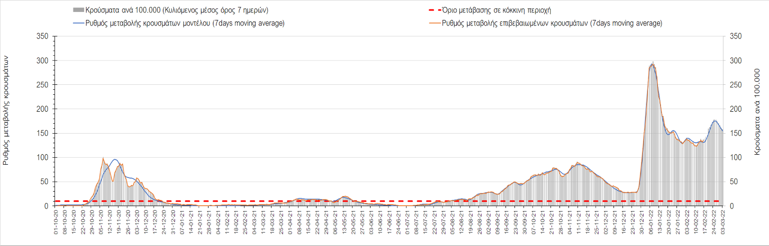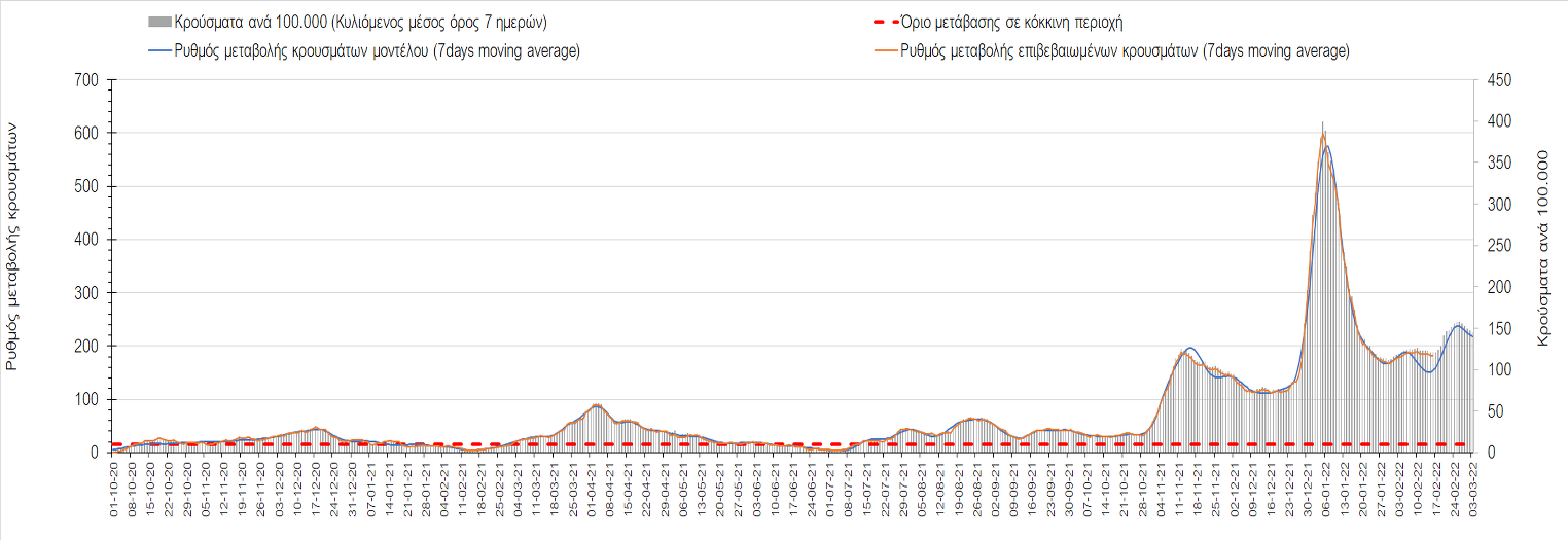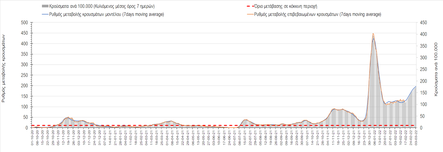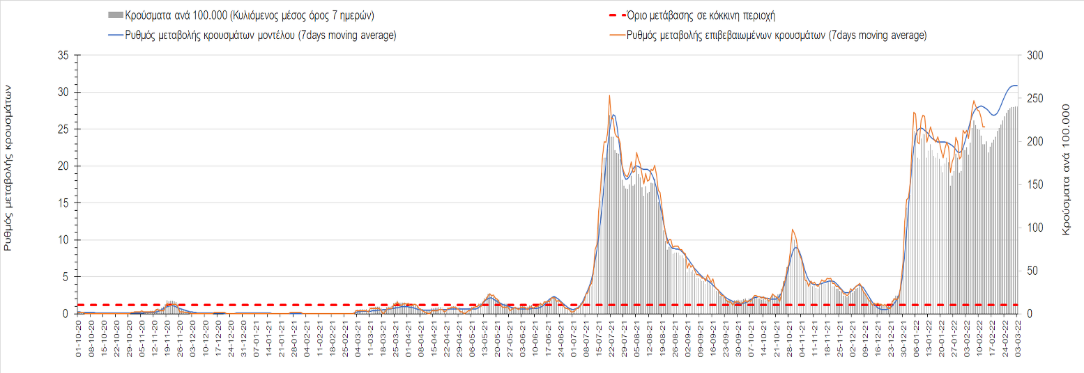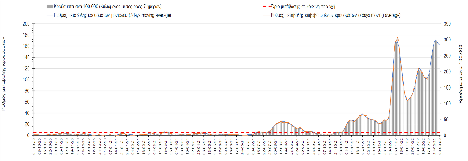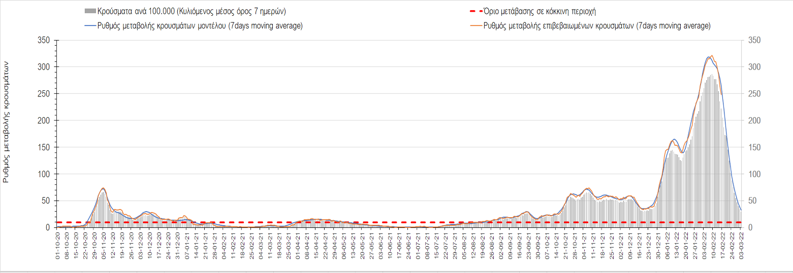 Η αποτύπωση των τάσεων στις επιμέρους περιοχές, παρουσιάζεται στο Σχήμα 61, όπου παρουσιάζεται ο ρυθμός μεταβολής των νέων κρουσμάτων ανά 100.000 κατοίκους (κυλιόμενος μέσος όρος 7 ημερών) των επιμέρους περιοχών. Θετικές τιμές του ρυθμού μεταβολής υποδηλώνουν άνοδο, ενώ αρνητικές τιμές υποδηλώνουν πτωτική πορεία.