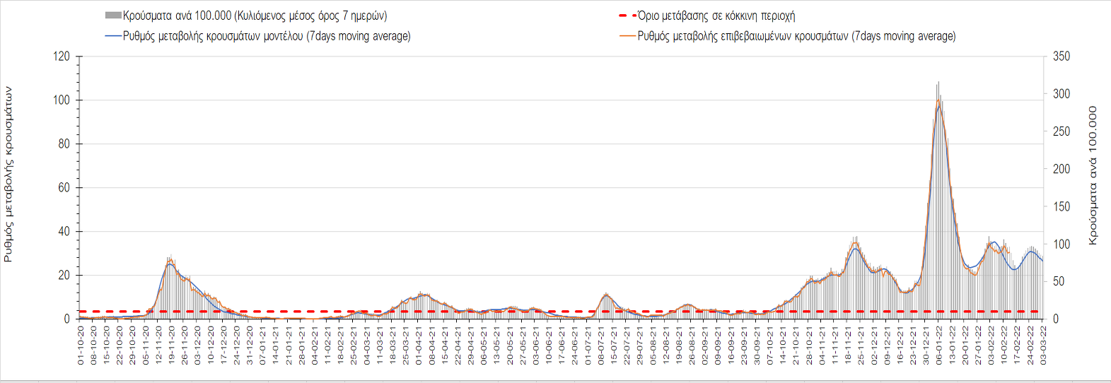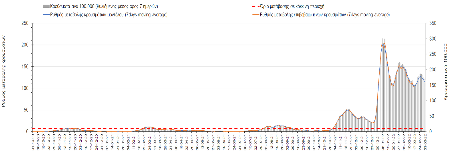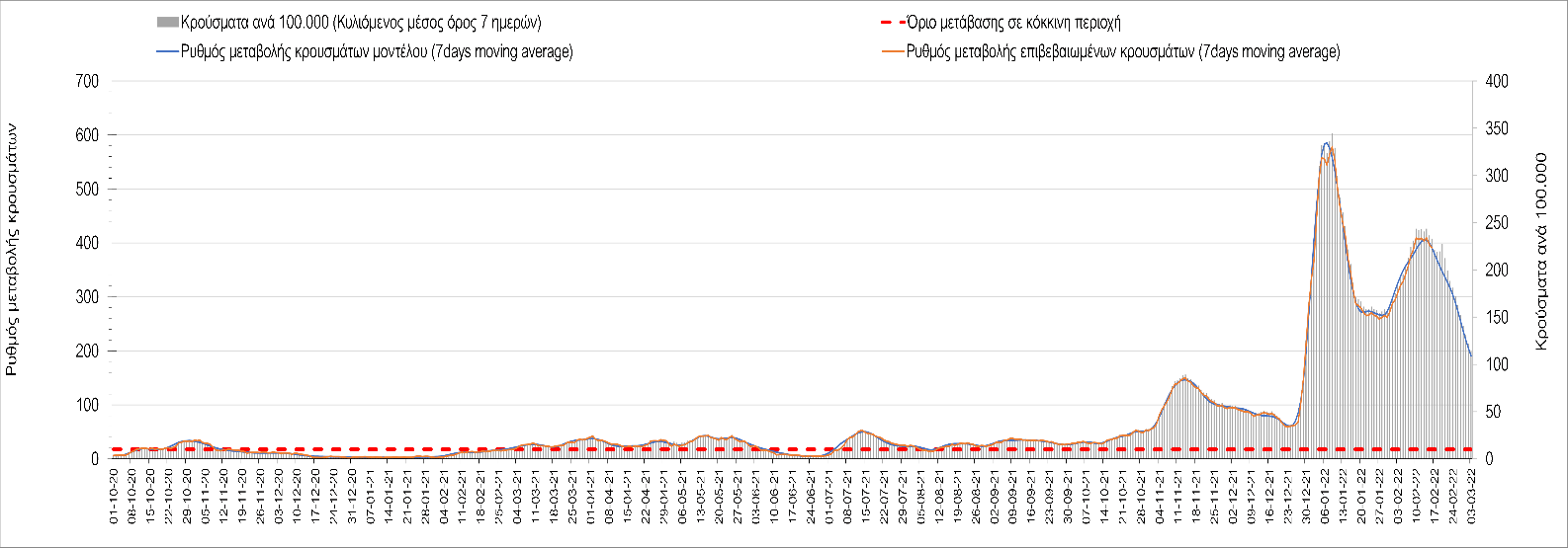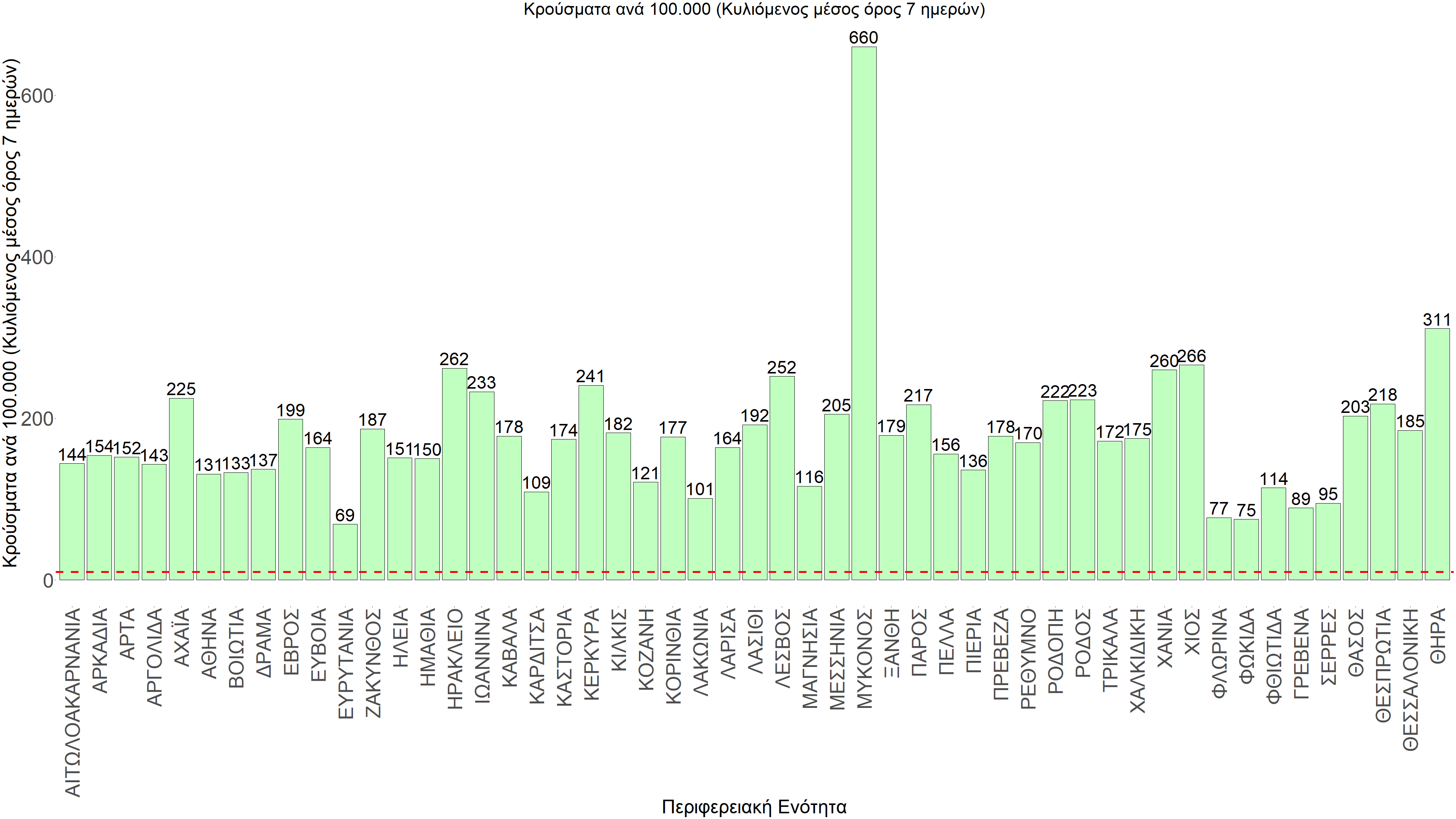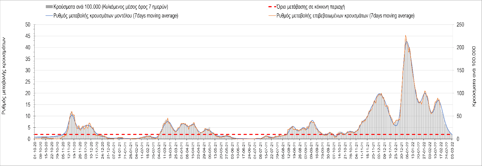 Η αποτύπωση των τάσεων στις επιμέρους περιοχές, παρουσιάζεται στο Σχήμα 61, όπου παρουσιάζεται ο ρυθμός μεταβολής των νέων κρουσμάτων ανά 100.000 κατοίκους (κυλιόμενος μέσος όρος 7 ημερών) των επιμέρους περιοχών. Θετικές τιμές του ρυθμού μεταβολής υποδηλώνουν άνοδο, ενώ αρνητικές τιμές υποδηλώνουν πτωτική πορεία.