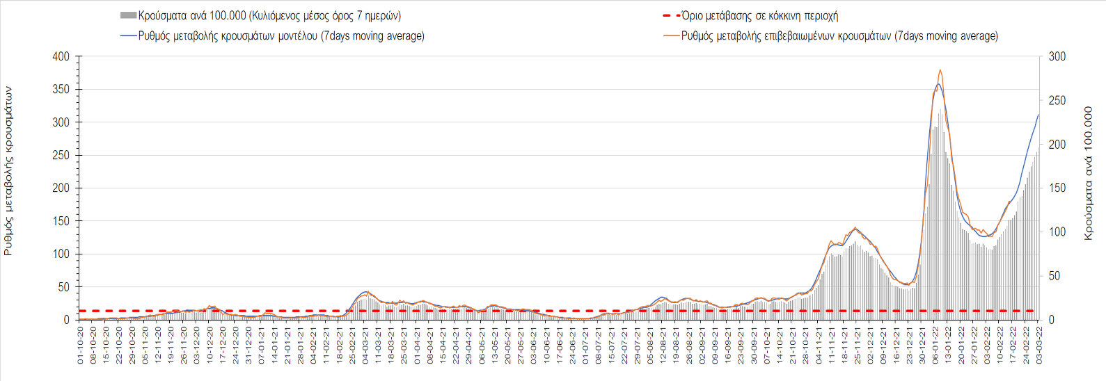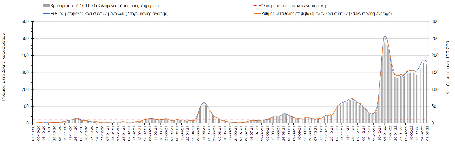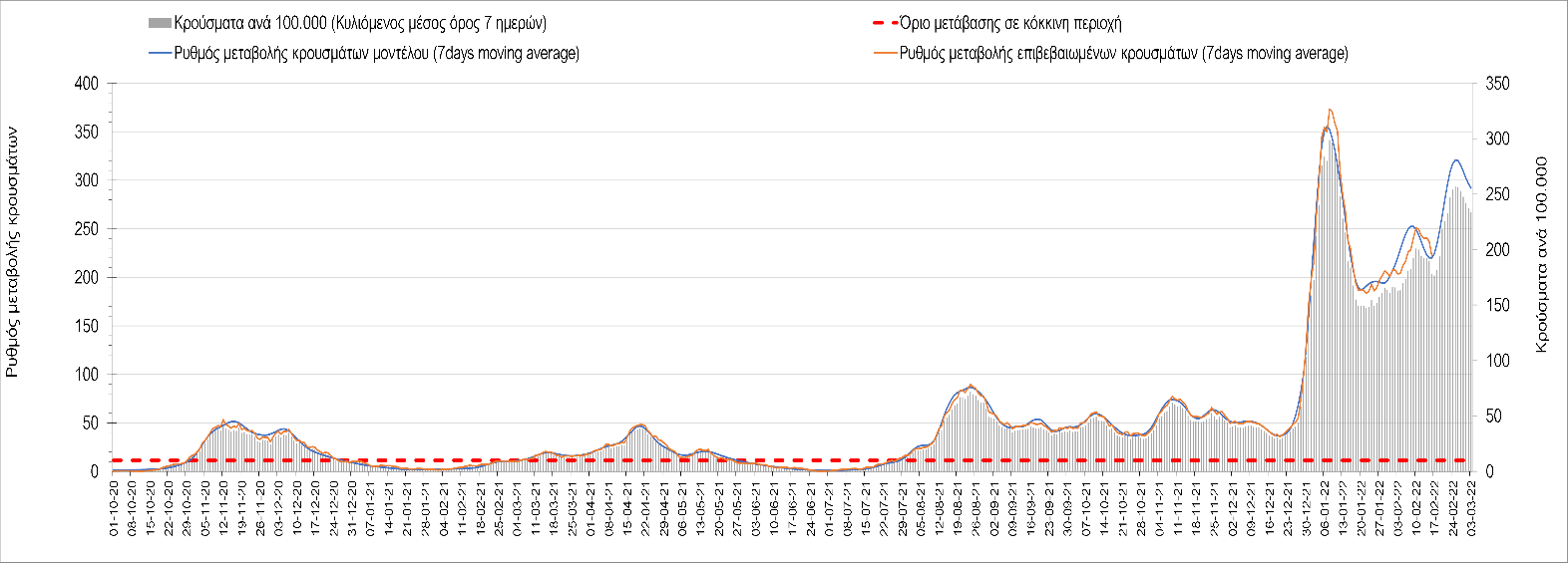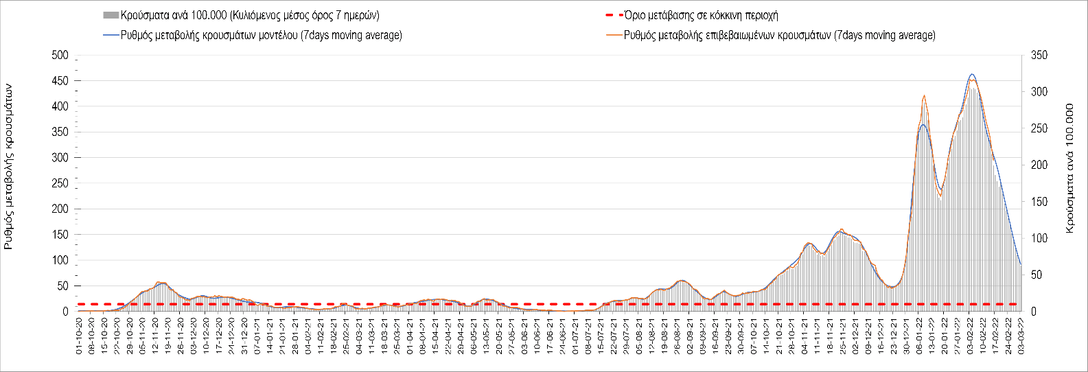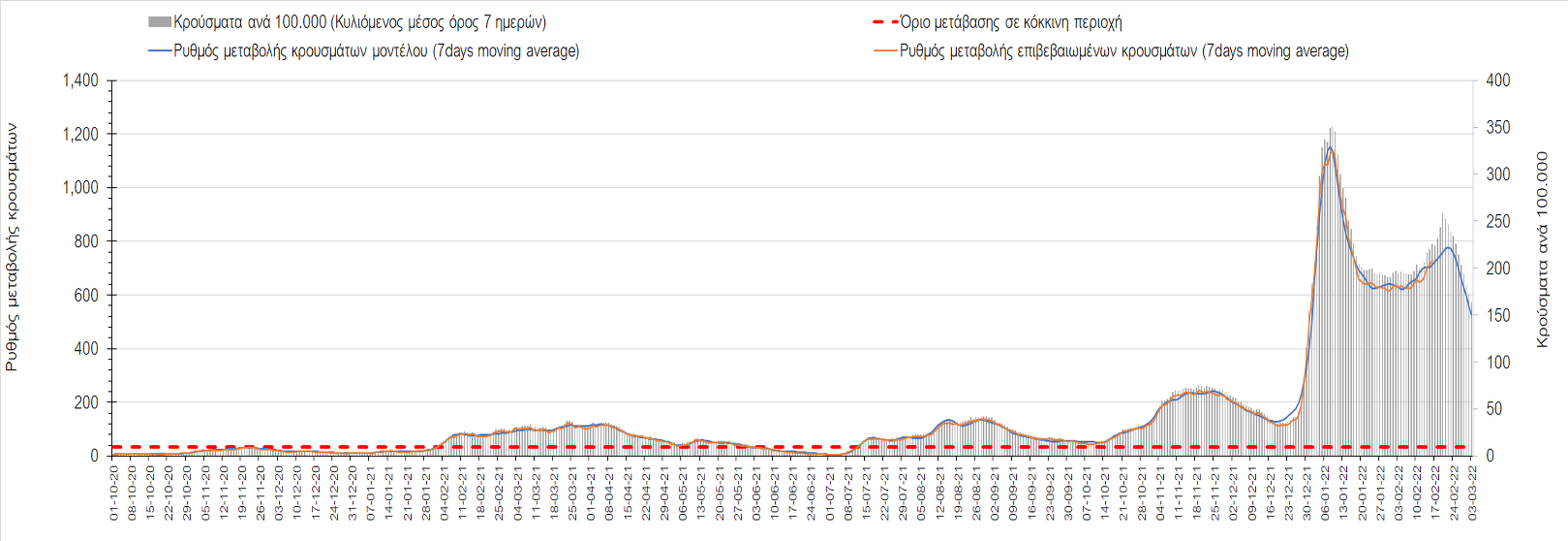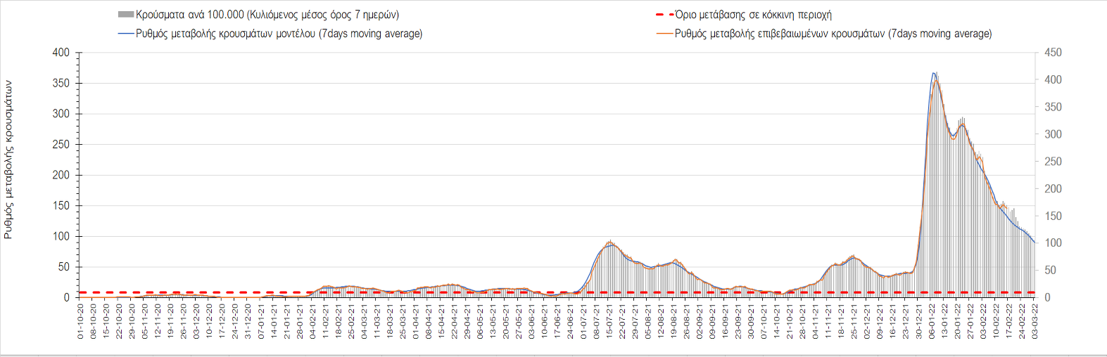 Η αποτύπωση των τάσεων στις επιμέρους περιοχές, παρουσιάζεται στο Σχήμα 61, όπου παρουσιάζεται ο ρυθμός μεταβολής των νέων κρουσμάτων ανά 100.000 κατοίκους (κυλιόμενος μέσος όρος 7 ημερών) των επιμέρους περιοχών. Θετικές τιμές του ρυθμού μεταβολής υποδηλώνουν άνοδο, ενώ αρνητικές τιμές υποδηλώνουν πτωτική πορεία.