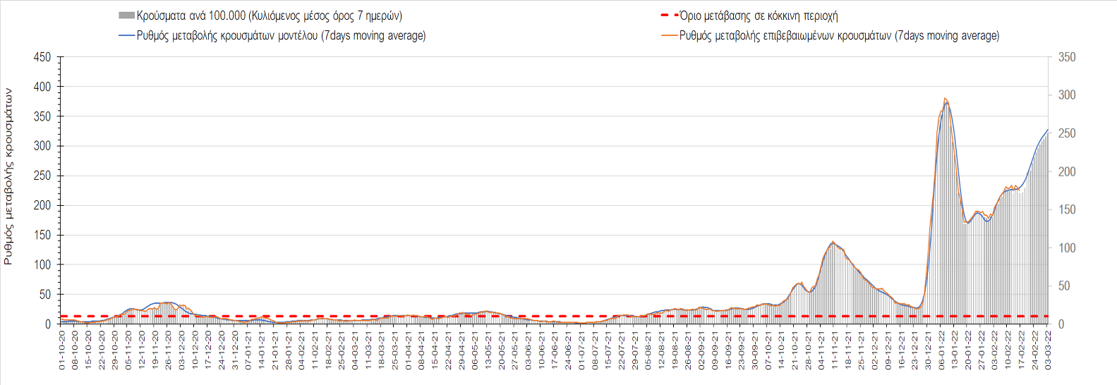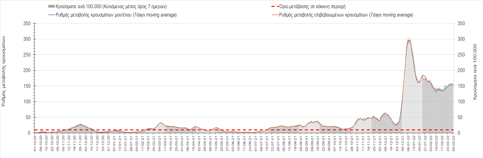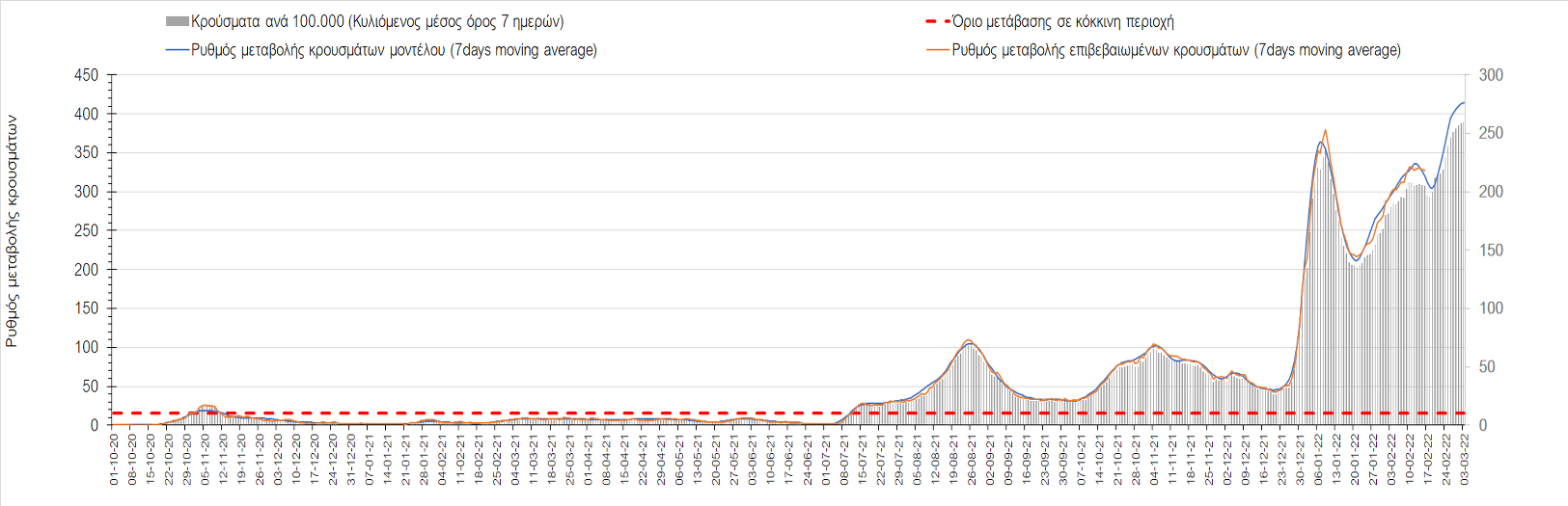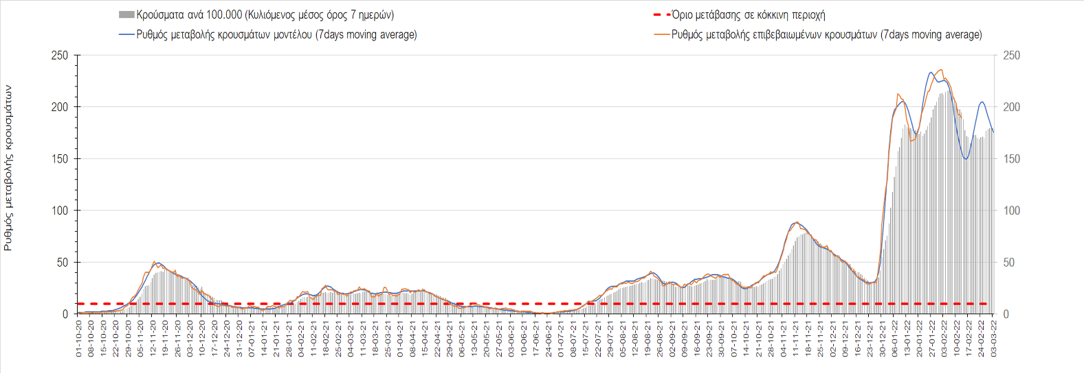 Σχήμα 4. Πορεία του ημερησίου αριθμού των κρουσμάτων (κυλιόμενος μέσος όρος 7 ημερών) στην Ελληνική επικράτεια