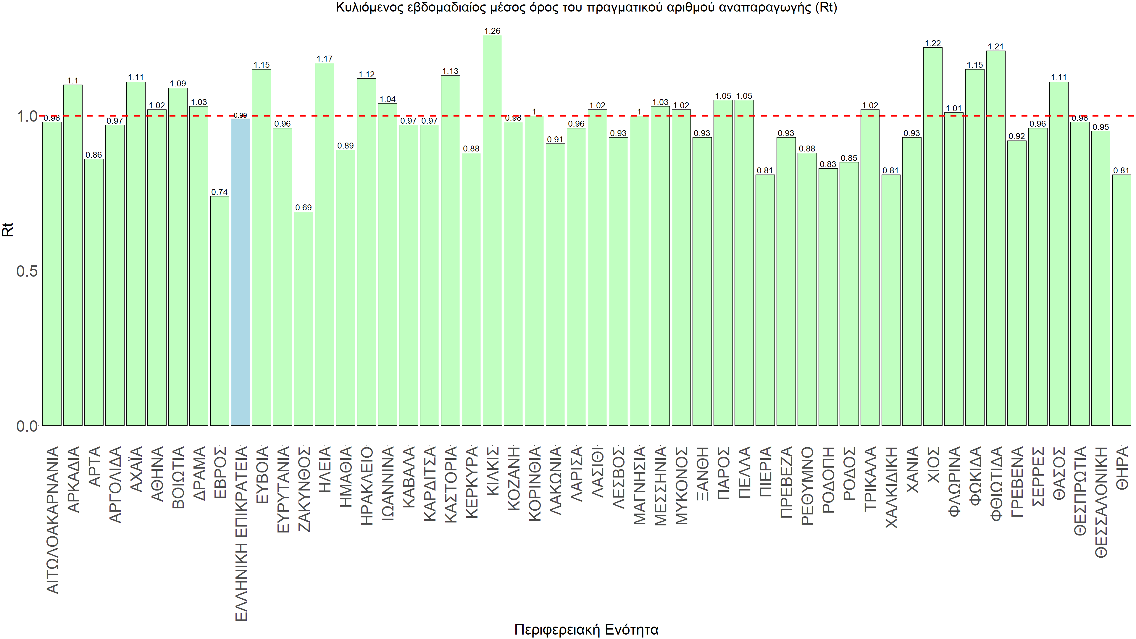 O πραγματικός αριθμός αναπαραγωγής Rt ανά περιφερειακή ενότητα της χώρας παρουσιάζεται στο Σχήμα 58.