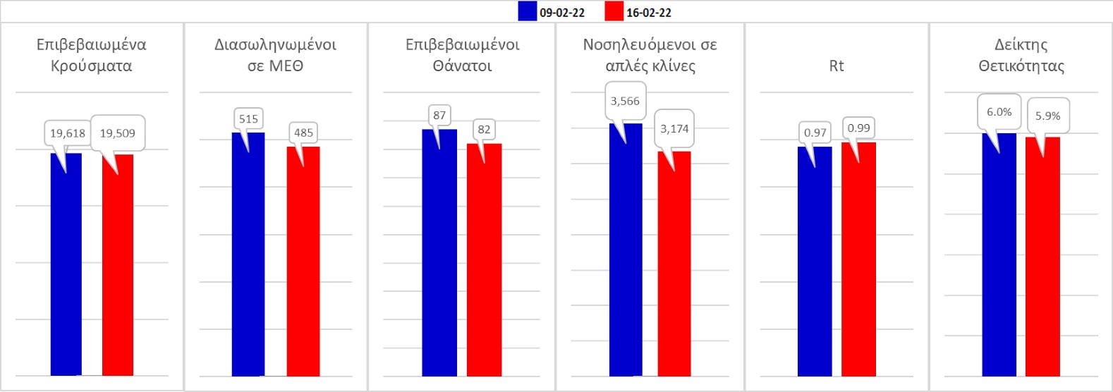 Σχήμα 59. Συγκριτικά αποτελέσματα της επιδημιολογικής εικόνας της σημερινής Τετάρτης (16/02/2022) σε σχέση με την προηγούμενη (09/02/2022)
