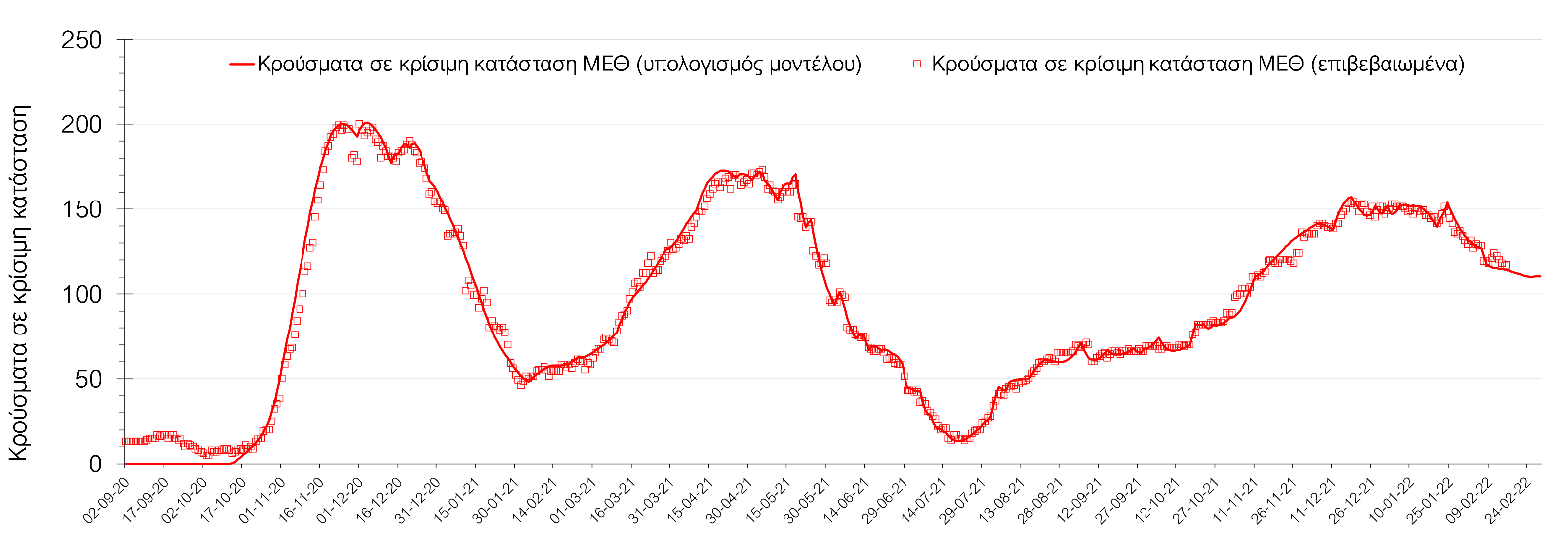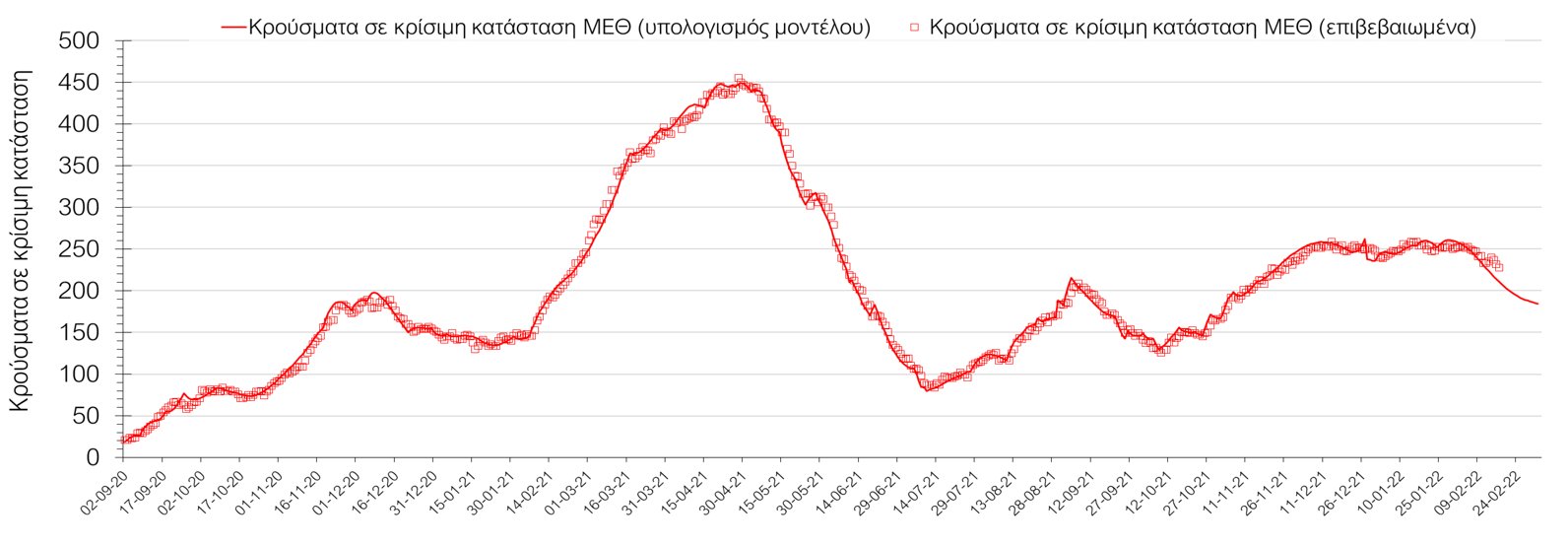 Όσον αφορά στους ασθενείς σε κρίσιμη κατάσταση (διασωληνωμένοι σε ΜΕΘ), την Τετάρτη ο αριθμός είναι μειωμένος σε σχέση με την Τρίτη (485 από 489). Η καμπύλη εξέλιξης του αριθμού των ασθενών που νοσηλεύονται σε κλίνες ΜΕΘ με βάση τις προσομοιώσεις της πλατφόρμας CORE, παρουσιάζεται στο Σχήμα 1, των ασθενών που νοσηλεύονται σε απλές κλίνες στο Σχήμα 2, ενώ η εκτίμησή μας για την πορεία των θανάτων ανά ημέρα παρουσιάζεται στο Σχήμα 3.