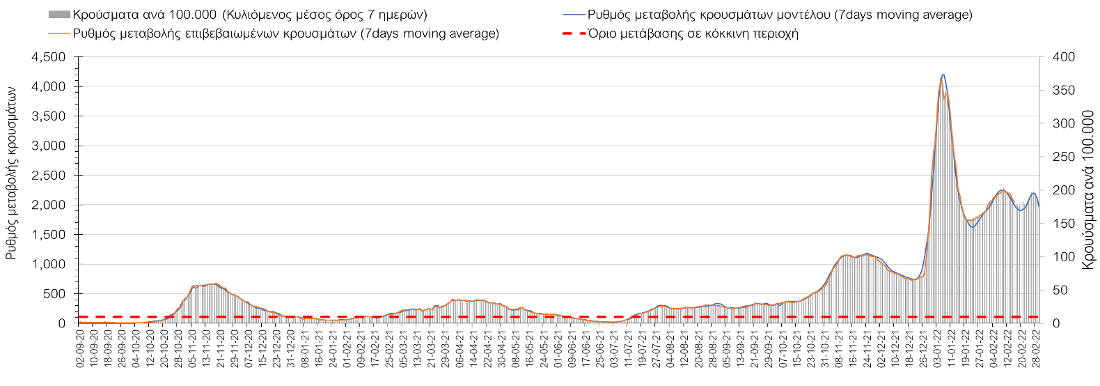 Η πορεία της μέσης εβδομαδιαίας τιμής των κρουσμάτων, καθώς και του κυλιόμενου μέσου όρου 7 ημερών του αριθμού των κρουσμάτων ανά 100.000 πληθυσμού, όπως έχουν καταγραφεί από τον ΕΟΔΥ και η αναμενόμενη πορεία τους, όπως προδιαγράφεται από την υπολογιστική πλατφόρμα CORE για την Ελληνική επικράτεια μέχρι τις 28 Φεβρουαρίου, αποτυπώνονται στο Σχήμα 4. Αυτή η προβλεπόμενη πορεία, που αφορά τα κρούσματα, τους νοσηλευόμενους σε απλές κλίνες, όσο και σε ΜΕΘ, καθώς επίσης και τους θανάτους, βασίζεται στις ακόλουθες παραδοχές: