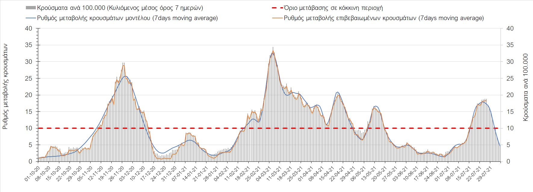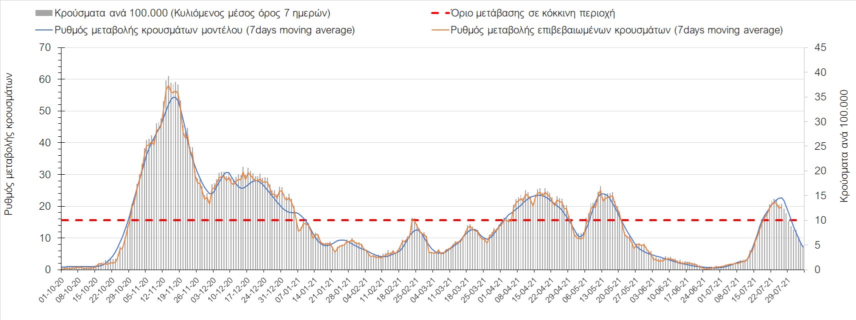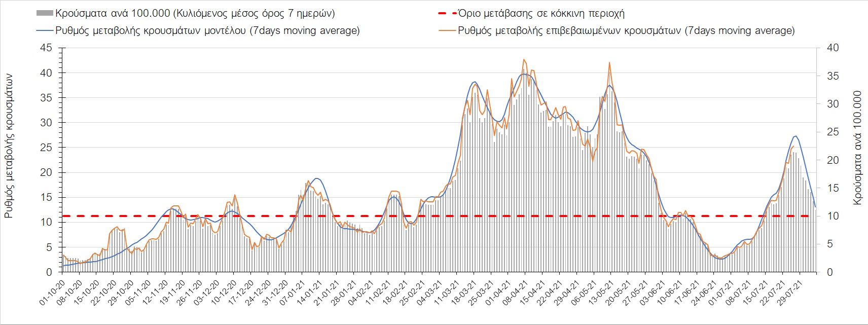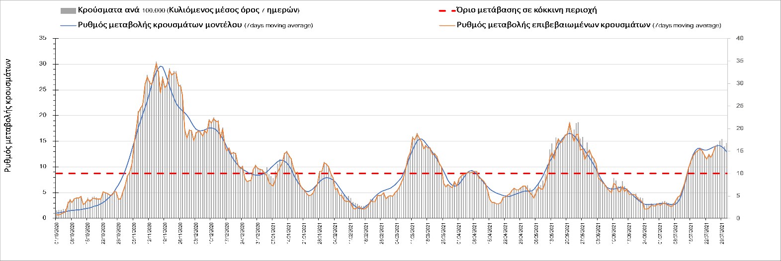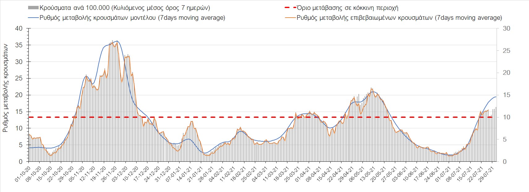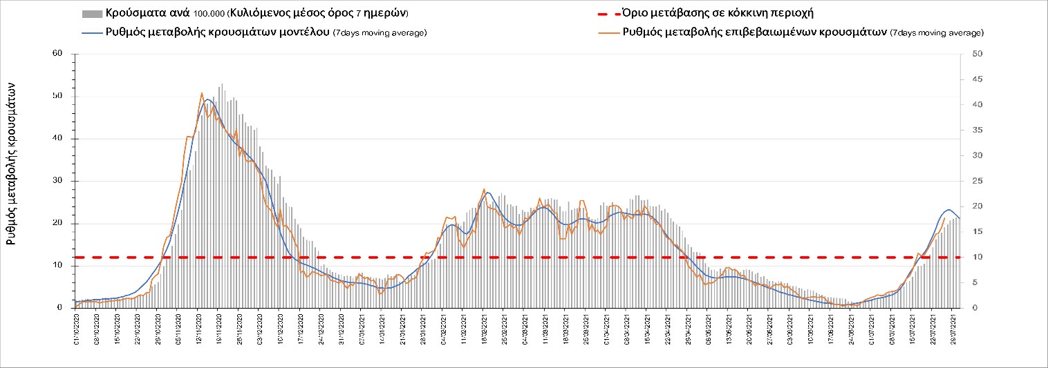 Σχήμα 58. Συγκριτικά αποτελέσματα της επιδημιολογικής εικόνας της σημερινής Δευτέρας (26/07/2021) σε σχέση με την προηγούμενη (19/07/2021) Όσον αφορά επιμέρους περιοχές, αρκετές πλέον βρίσκονται πάνω από το όριο χαρακτηρισμού ως κόκκινες, όπως η Αθήνα, η Θεσσαλονίκη η Λάρισα, η Μαγνησία, η Καρδίτσα, τα Τρίκαλα, η Αχαΐα, η Αργολίδα, η Αρκαδία, η Κορινθία, η Μεσσηνία, η Εύβοια, η Βοιωτία, τη Φωκίδα, τα Ιωάννινα, η Θεσπρωτία, η Κοζάνη, η Φλώρινα, η Χαλκιδική, ο Έβρος, το Ηράκλειο, τα Χανιά, το Ρέθυμνο, το Λασίθι, η Κέρκυρα, η Λέσβος, η Πάρος, η Ζάκυνθος, η Μύκονος, η Σαντορίνη και η Ρόδος, ενώ παρατηρούνται έντονα ανοδικές τάσεις στην Άρτα, στην Καβάλα, στη Δράμα, στη Πιερία, στην Ημαθία, στη Ξάνθη και στη Χίο. Ιδιαίτερα ανησυχητική είναι η αυξητική πορεία σε τουριστικούς προορισμούς όπως η Κέρκυρα, η Ζάκυνθος, η Ρόδος, η Χαλκιδική, η Χίος, αλλά και σε περιοχές πιο κοντά στην Αθήνα όπως η Βοιωτία, η Εύβοια, η Κορινθία και η Αργολίδα. Στην Πελοπόννησο ανησυχητικά αυξητική τάση παρουσιάζει και τη Δευτέρα η Μεσσηνία, ενώ στην ηπειρωτική και Βόρειο Ελλάδα, η Κοζάνη. Στην Κρήτη παραμένει σε υψηλά επίπεδα διασποράς το Ηράκλειο, ενώ στα Χανιά παρατηρείται έντονη τάση αύξησης της διασποράς. Σε αυτές τις περιοχές συνιστούμε κινητοποίηση κλιμακίων του ΕΟΔΥ για αυξημένους ελέγχους με rapid test και καλή ιχνηλάτηση επαφών των θετικών περιπτώσεων.Ιδιαίτερα στην Αθήνα (παρά την πτωτική πορεία), προβληματίζει ο βαθμός που αυτή σχετίζεται με την εξάπλωση μεταλλαγμένων και ταχύτερα μεταδιδόμενων στελεχών (κυρίως το Β.1.1.318 και το Β.1.167). Χαρακτηριστικό παράδειγμα της αυξημένης μεταδοτικότητας του στελέχους Δ (Β.1.167) αποτελεί η Κρήτη. Συνολικά η Κρήτη είναι η περιοχή με τη χειρότερη επιδημιολογική εικόνα και η ταχύτητα μετάδοσης (και το αντίστοιχο ύψος του 4ου κύματος που έχει διαμορφωθεί) είναι ενδεικτική της αυξημένης μεταδοτικότητας του στελέχους Δ. Επίσης, καταδεικνύει τον αρνητικό ρόλο που παίζουν οι διαπεριφερειακές μετακινήσεις στη φάση ανάπτυξης της πανδημίας, καθώς η αρχική αύξηση κρουσμάτων στο Ρέθυμνο πρώτα και στο Ηράκλειο έπειτα, ακολουθήθηκε από αυξητική πορεία της διασποράς στα Χανιά και στο Λασίθι. Στην πράξη, η Κρήτη είναι μια περιοχή οδικά απομονωμένη από την υπόλοιπη Ελλάδα, στην οποία, οι διαπεριφερειακές μετακινήσεις επέτρεψαν τη γρήγορη διασπορά του στελέχους Δ. Παρόμοια φαινόμενα διαπεριφερειακής μετάδοσης παρατηρούνται στη Θεσσαλία, αλλά σε πιο ήπια έκταση, όπου η έντονα αυξητική τάση στη Μαγνησία, μεταφέρθηκε σε κάποιο βαθμό και στη Λάρισα, ενώ ακολουθεί και η Καρδίτσα. Αντίστοιχη είναι η διάχυση της διασποράς στην Ήπειρο και πιο συγκεκριμένα από τα Ιωάννινα προς τα εγγύς τουριστικά θέρετρα (Πρέβεζα και Θεσπρωτία). Συνεπώς, ακόμα και για περιοχές που για την ώρα είναι κάτω από το όριο (ή πολύ κοντά στο όριο), οι ανοδικές τάσεις που παρατηρούνται χρήζουν αυξημένης επιδημιολογικής επιτήρησης με εντατικοποίηση του γονιδιωματικού ελέγχου ώστε να ληφθούν εγκαίρως μέτρα περιορισμού της διασποράς του ιού.Επίσης, σύμφωνα με τα πιο πρόσφατα στοιχεία που έγιναν διαθέσιμα, ανησυχία πλέον δημιουργεί η αύξηση του ποσοστού διασποράς του μεταλλαγμένου στελέχους Β.1.617.2 (μετάλλαξη Δέλτα) σε συγκεκριμένες περιοχές για το 15νθήμερο από 04/07/2021 έως 18/07/2021, όπου οι αντίστοιχες ποσοστώσεις είναι 25.13% για την Αττική, 6.67% για τη Δυτική Ελλάδα, 33.33% για τις Ιόνιες Νήσους, 24.32% για την 
