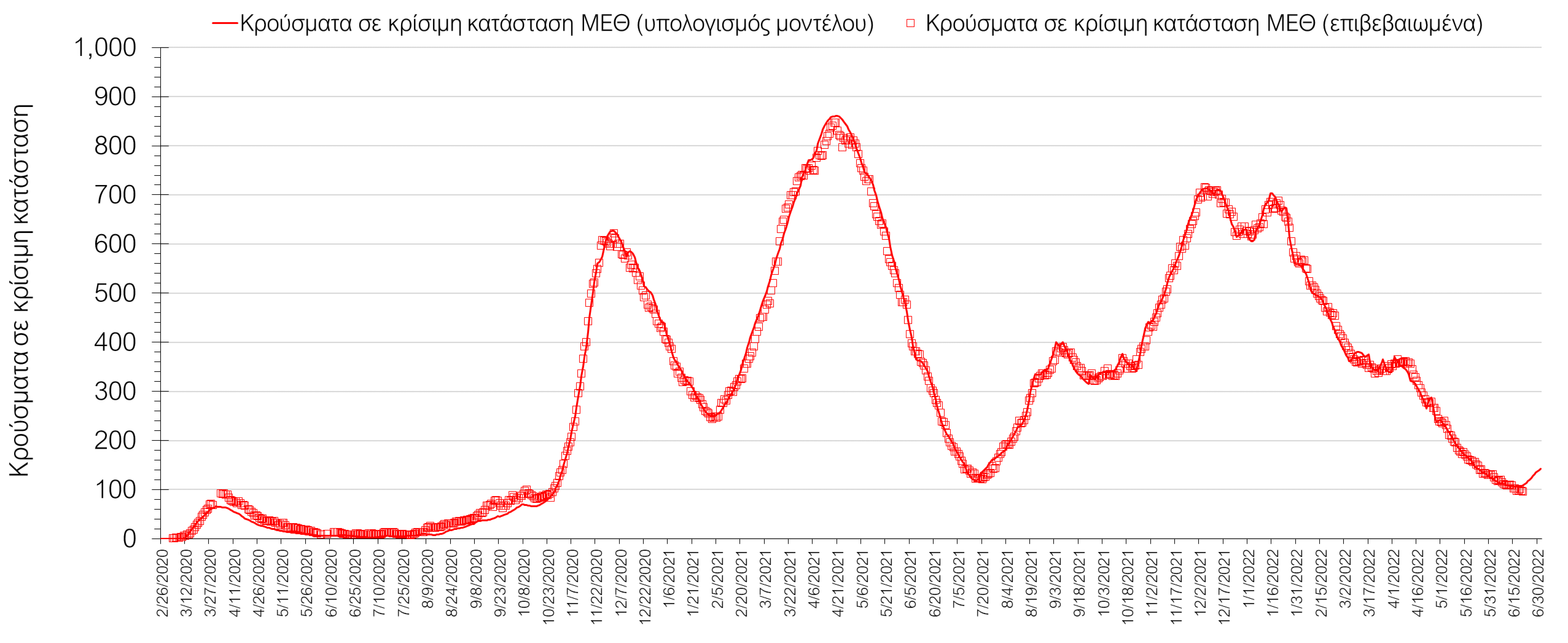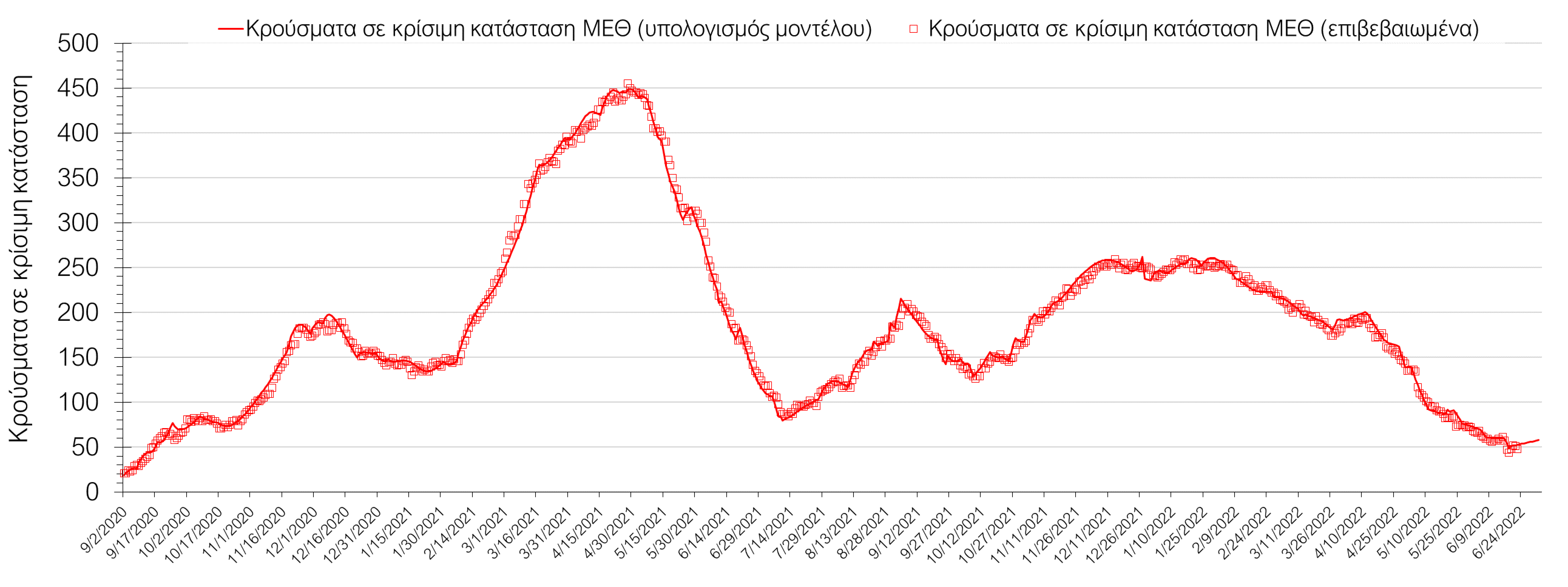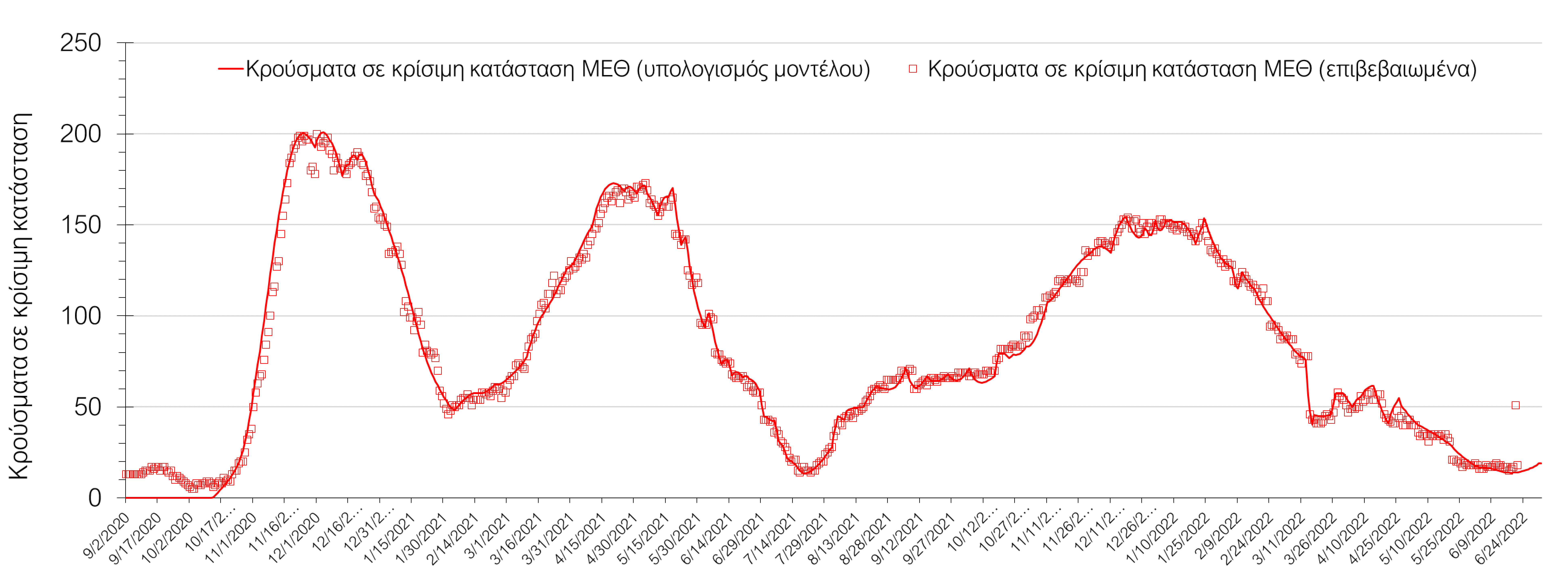 Όσον αφορά στους ασθενείς σε κρίσιμη κατάσταση (διασωληνωμένοι σε ΜΕΘ), ο αριθμός είναι πρακτικά ίδιος σε σχέση με την Δευτέρα (96 από 97). Η καμπύλη εξέλιξης του αριθμού των ασθενών που νοσηλεύονται σε κλίνες ΜΕΘ με βάση τις προσομοιώσεις της πλατφόρμας CORE, παρουσιάζεται στο Σχήμα 1, των ασθενών που νοσηλεύονται σε απλές κλίνες στο Σχήμα 2, όπου παρατηρείται σημαντική άνοδος τις τελευταίες ημέρες, ενώ η εκτίμησή μας για την πορεία των θανάτων ανά ημέρα παρουσιάζεται στο Σχήμα 3.