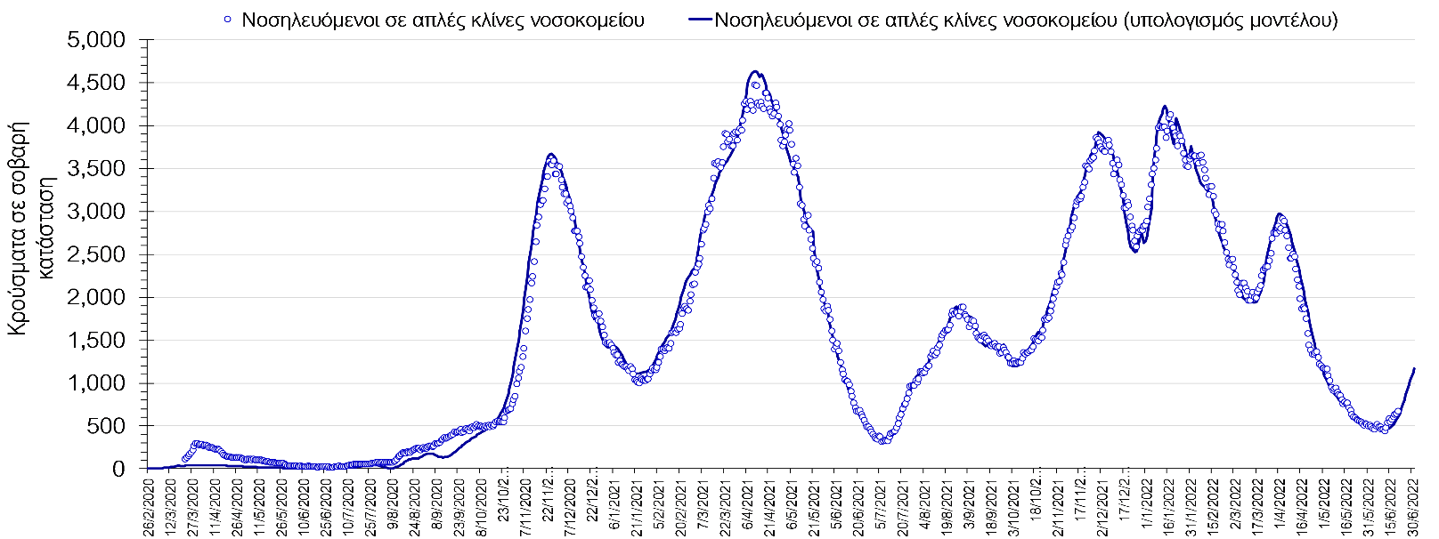 Σχήμα 2. Αριθμός κρουσμάτων σε σοβαρή κατάσταση (νοσηλευόμενοι σε απλές κλίνες) σύμφωνα με τα στοιχεία του ΕΟΔΥ και τις προβλέψεις της υπολογιστικής πλατφόρμας CORE.
