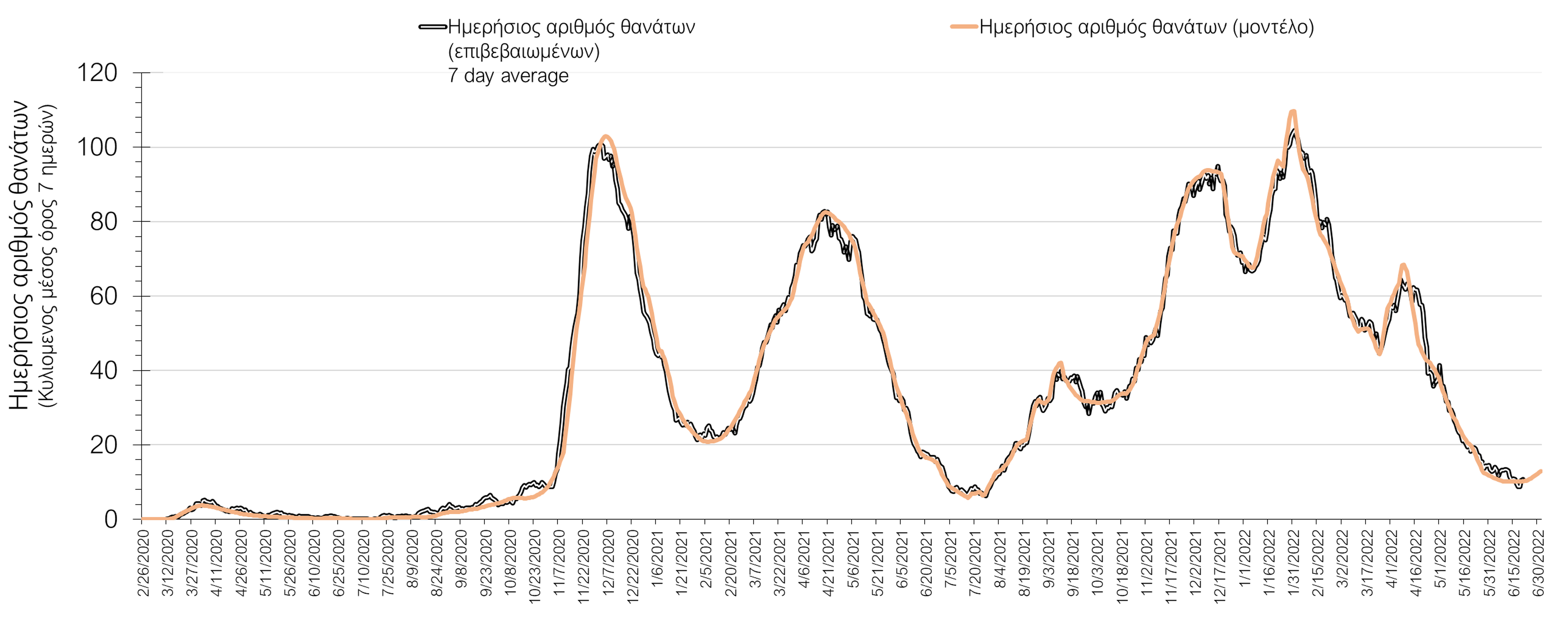 Σχήμα 3. Αριθμός θανάτων (κυλιόμενος μέσος όρος 7 ημερών) σύμφωνα με τα στοιχεία του ΕΟΔΥ και τις προβλέψεις της υπολογιστικής πλατφόρμας CORE.
