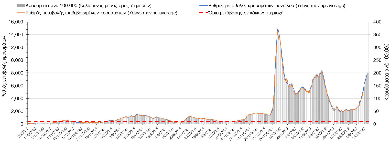 Στο σύνολο της χώρας η πορεία είναι ανοδική, και αντικατοπτρίζεται και στον ημερήσιο αριθμό των κρουσμάτων (κυλιόμενος μέσος όρος 7 ημερών), ο οποίος εμφανίζει άνοδο σε σχέση με την Δευτέρα, και πλέον οδεύει προς τις 9000 (8.840). Για να επανέλθει η συστηματική αποκλιμάκωση της πανδημίας, πέρα από την εφαρμογή των μέτρων (σε συνδυασμό με την σημαντική συνειδητοποίηση εκ μέρους του πληθυσμού ότι χρειάζεται προσοχή και σύνεση για την αντιμετώπιση της διασποράς της παραλλαγής Ο), θα πρέπει να στοχεύσουμε στη διατήρηση και την επέκταση της επίκτητης ανοσίας του πληθυσμού, αλλά και στον μεγάλο αριθμό των τεστ συνολικά (μοριακά, rapid και self-test) που πραγματοποιούνται καθημερινά.