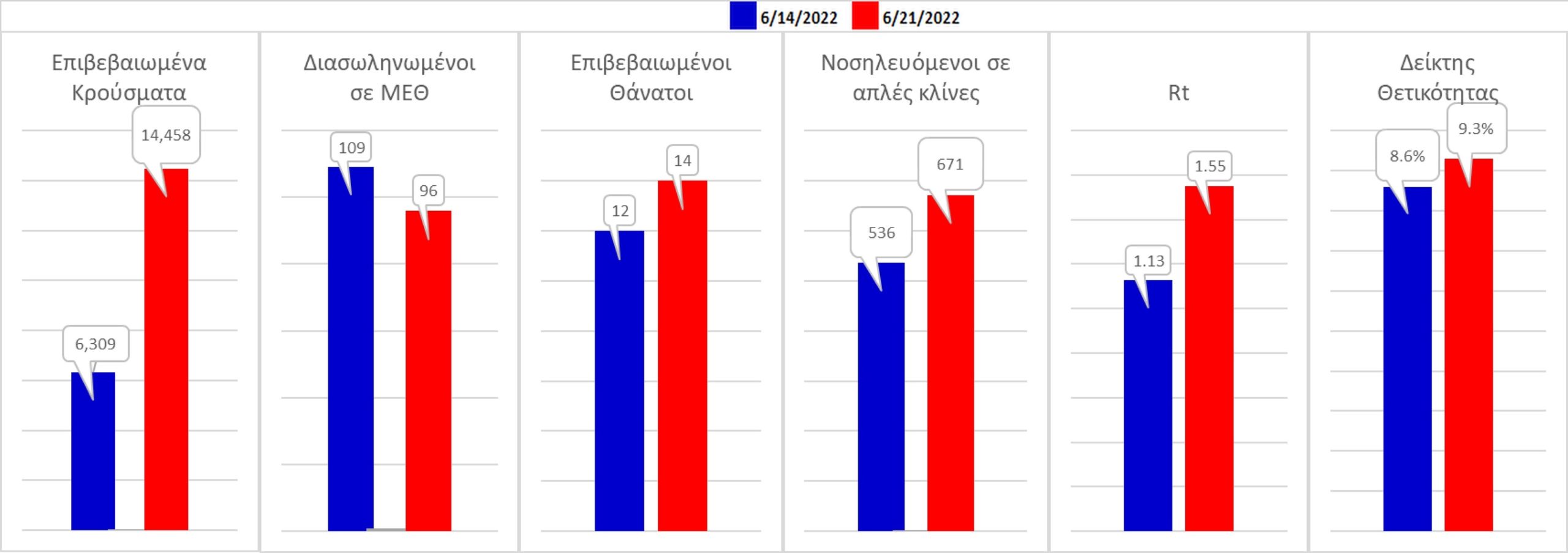 Σχήμα 59. Συγκριτικά αποτελέσματα της επιδημιολογικής εικόνας της σημερινής Τρίτης (21/06/2022) σε σχέση με την προηγούμενη (14/06/2022)