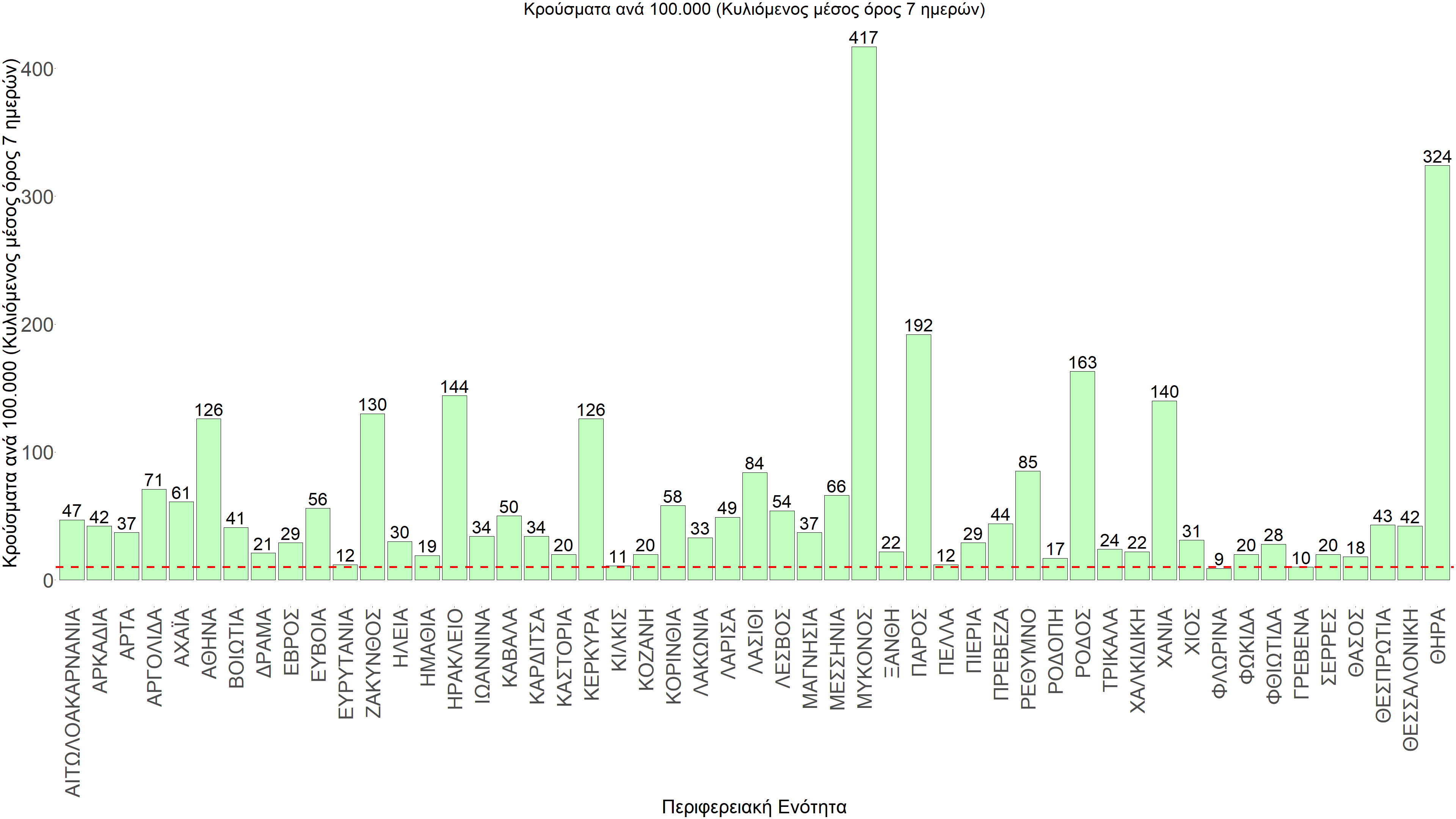 Η συγκεντρωτική εικόνα των νέων κρουσμάτων ανά 100.000 κατοίκους (κυλιόμενος μέσος όρος 7 ημερών) των επιμέρους περιοχών παρουσιάζεται στο Σχήμα 60. Όλες οι περιοχές παραμένουν πάνω από το όριο ανησυχίας, με εξαίρεση τη Φλώρινα.