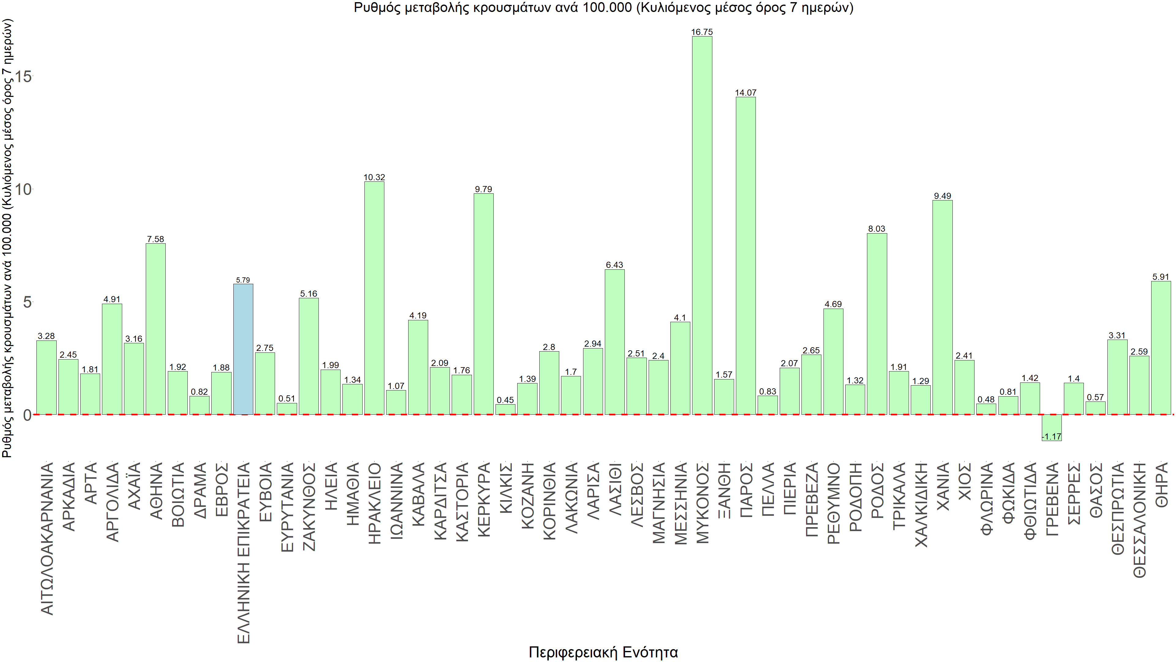 Η αποτύπωση των τάσεων στις επιμέρους περιοχές, παρουσιάζεται στο Σχήμα 61, όπου παρουσιάζεται ο ρυθμός μεταβολής των νέων κρουσμάτων ανά 100.000 κατοίκους (κυλιόμενος μέσος όρος 7 ημερών) των επιμέρους περιοχών. Θετικές τιμές του ρυθμού μεταβολής υποδηλώνουν άνοδο, ενώ αρνητικές τιμές υποδηλώνουν πτωτική πορεία.
