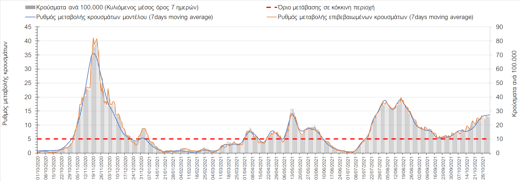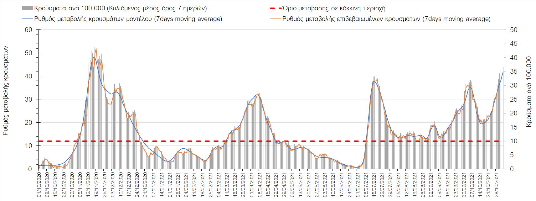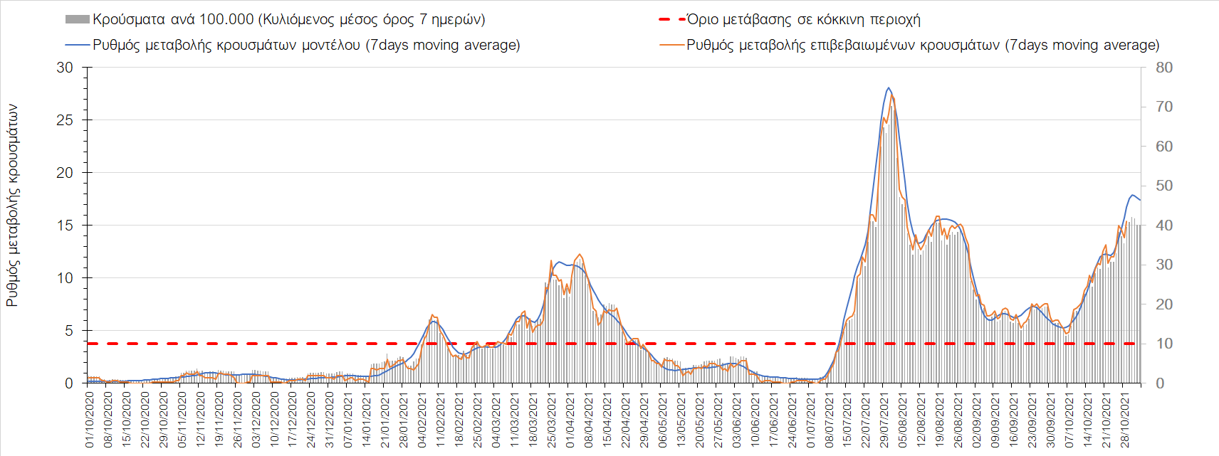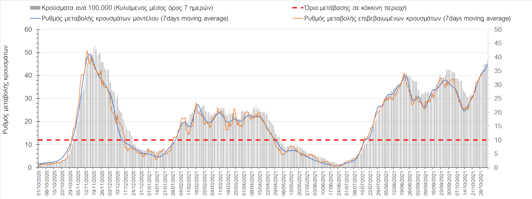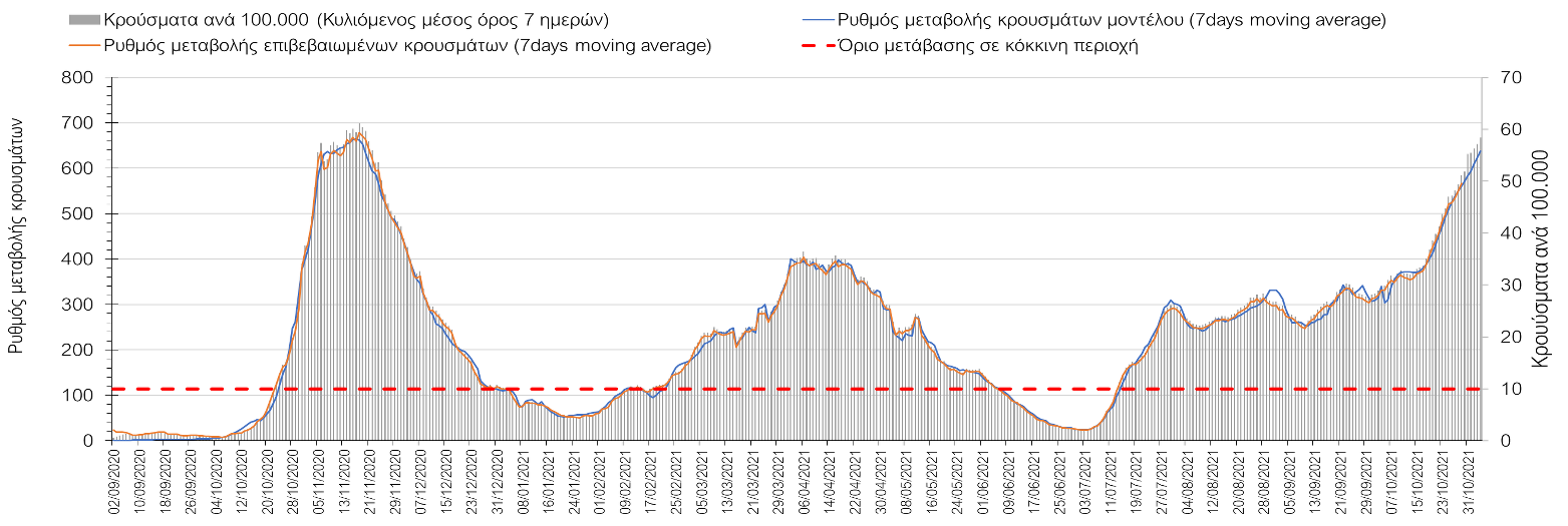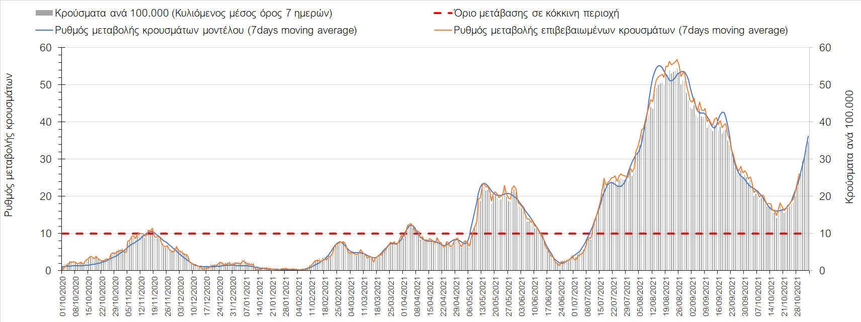 Για την ώρα παρατηρείται σχετικά συγκρατημένη (αλλά επιταχυνόμενη) αύξηση του αριθμού των κρουσμάτων, που υποβοηθείται από το συνολικά μεγάλο αριθμό τεστ που γίνονται καθημερινά, αλλά η προοδευτική μείωση της θερμοκρασίας και η επαγόμενη αύξηση της μεταδοτικότητας, οδηγούν στην ανοδική τάση της φθινοπωρινής και χειμερινής περιόδου.