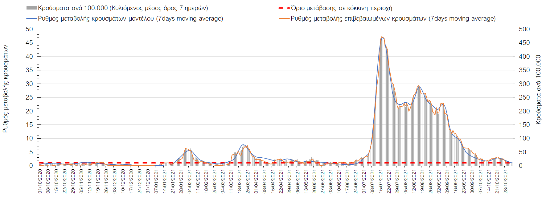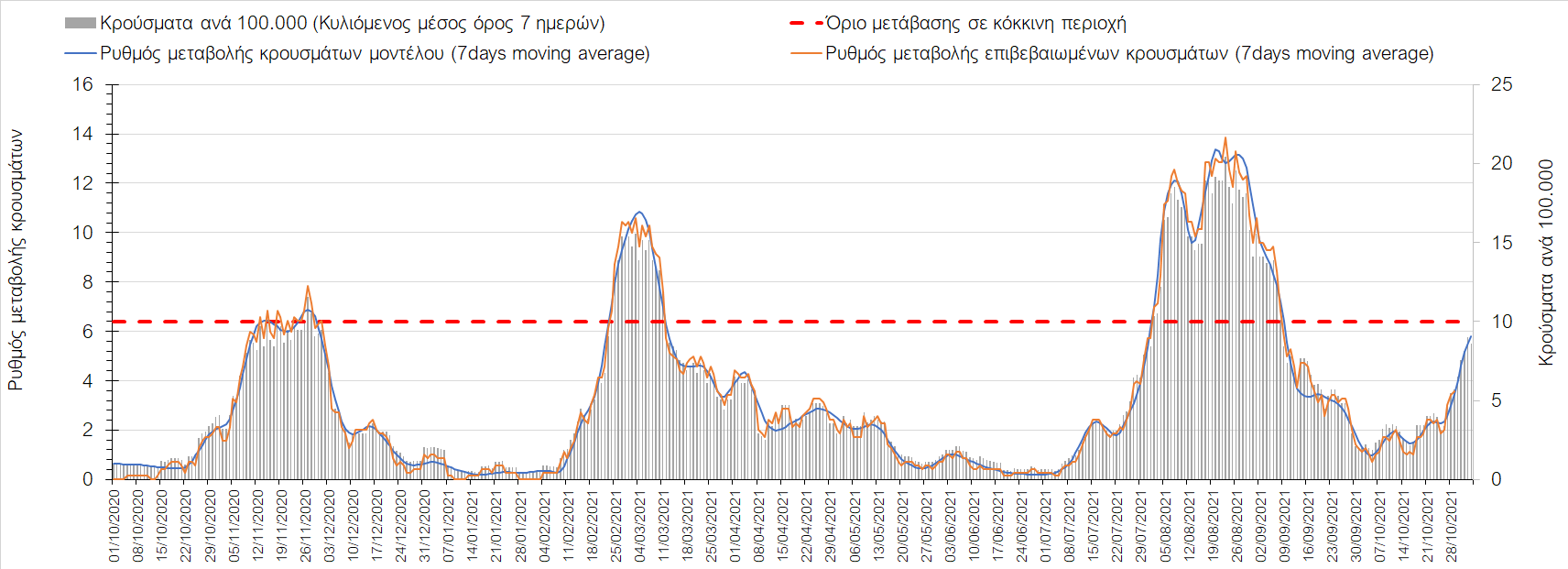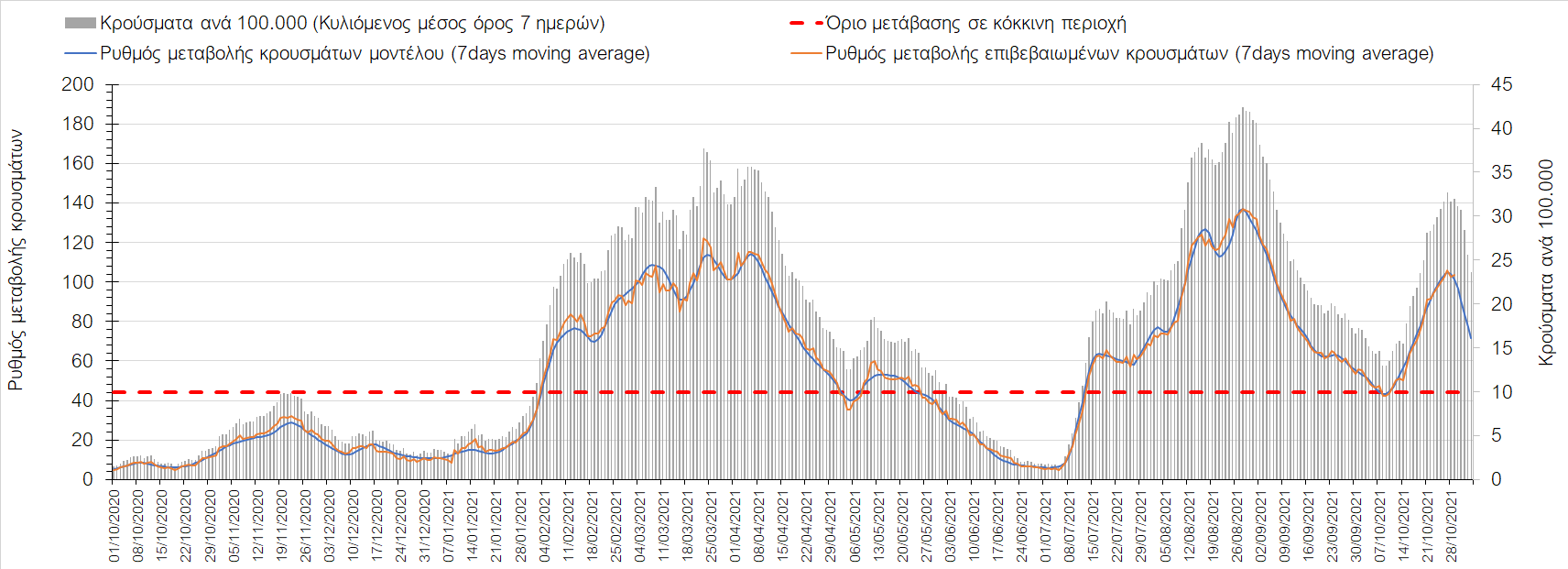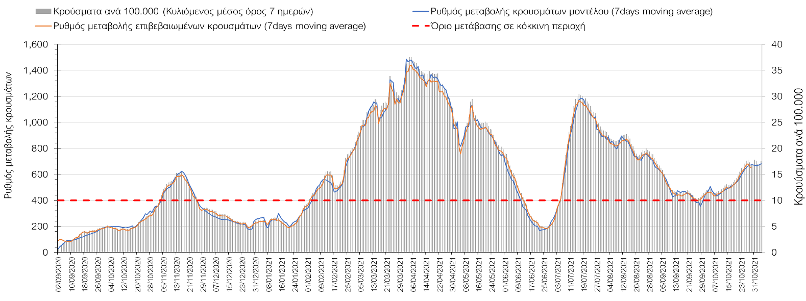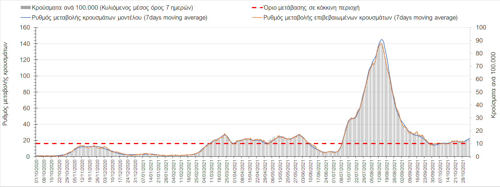 Για την ώρα παρατηρείται σχετικά συγκρατημένη (αλλά επιταχυνόμενη) αύξηση του αριθμού των κρουσμάτων, που υποβοηθείται από το συνολικά μεγάλο αριθμό τεστ που γίνονται καθημερινά, αλλά η προοδευτική μείωση της θερμοκρασίας και η επαγόμενη αύξηση της μεταδοτικότητας, οδηγούν στην ανοδική τάση της φθινοπωρινής και χειμερινής περιόδου.