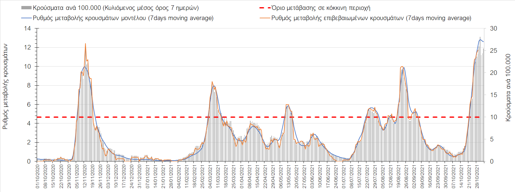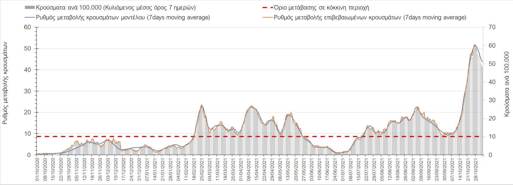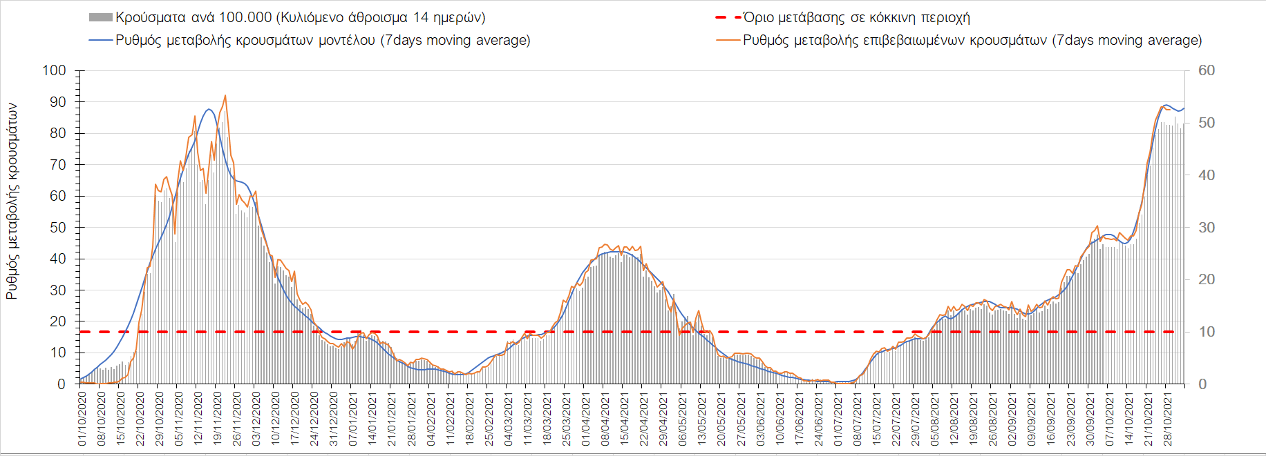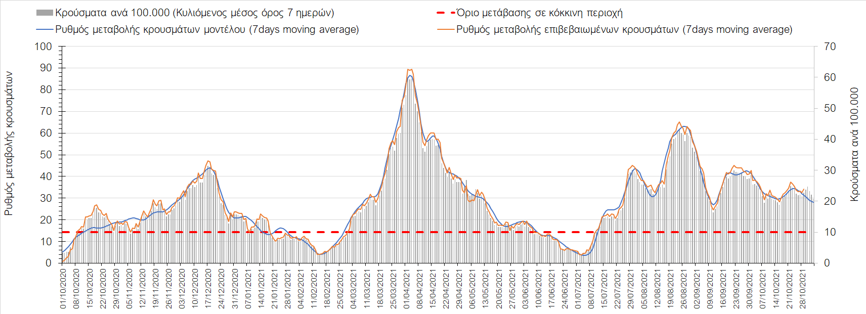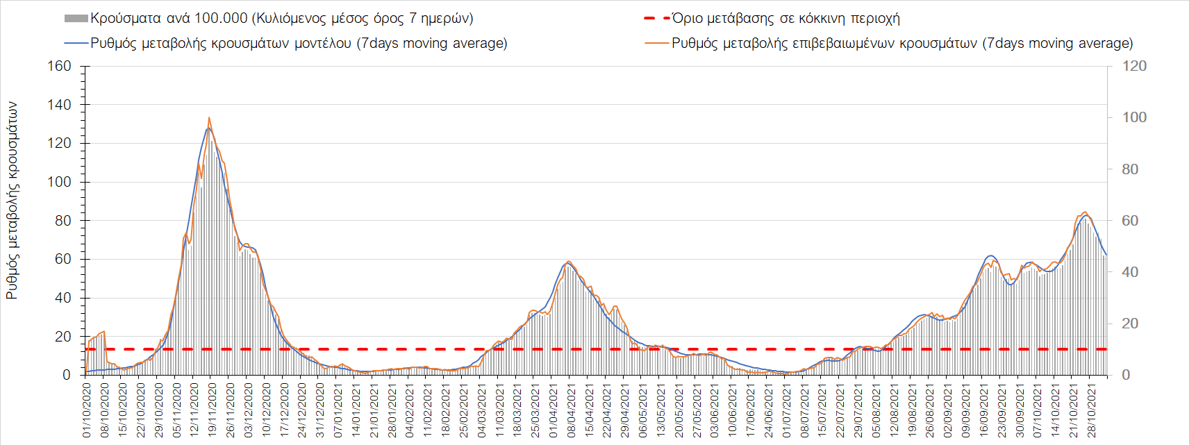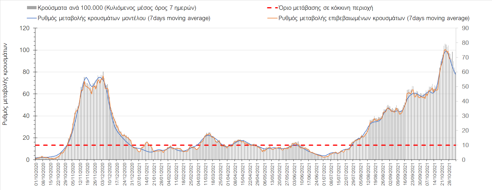 Για την ώρα παρατηρείται σχετικά συγκρατημένη (αλλά επιταχυνόμενη) αύξηση του αριθμού των κρουσμάτων, που υποβοηθείται από το συνολικά μεγάλο αριθμό τεστ που γίνονται καθημερινά, αλλά η προοδευτική μείωση της θερμοκρασίας και η επαγόμενη αύξηση της μεταδοτικότητας, οδηγούν στην ανοδική τάση της φθινοπωρινής και χειμερινής περιόδου.