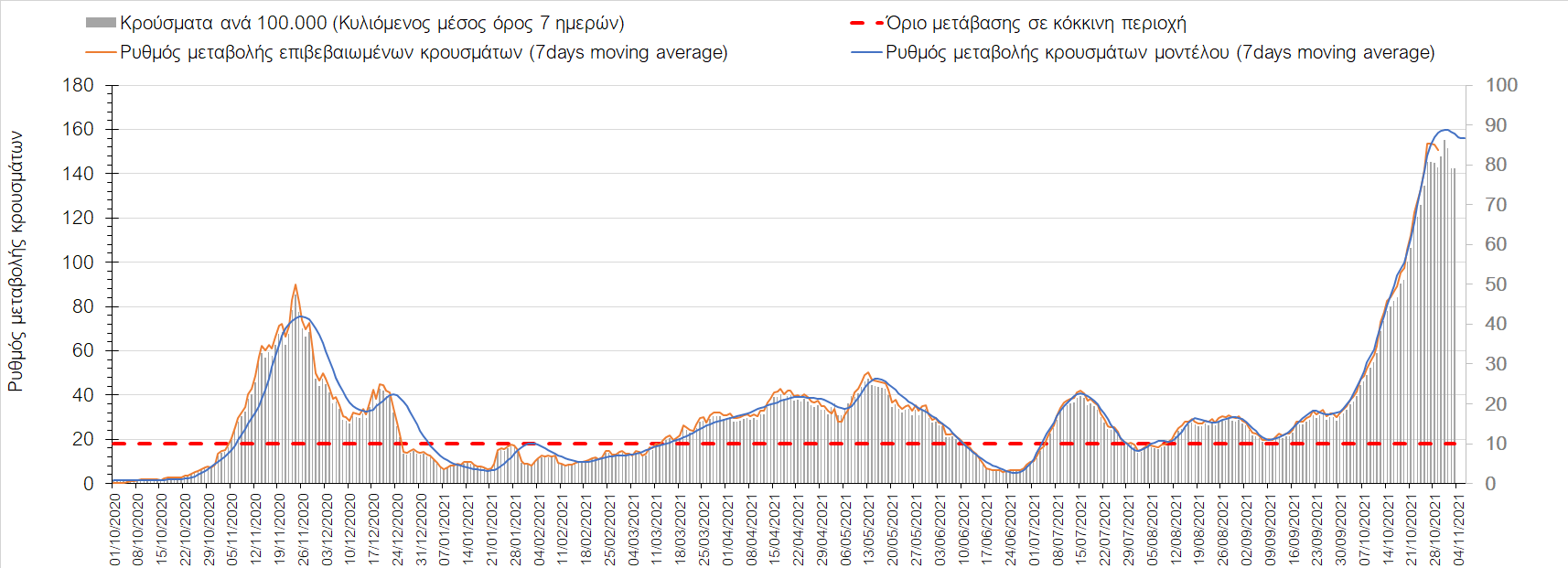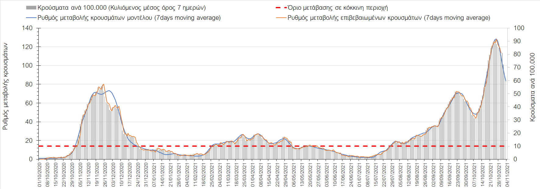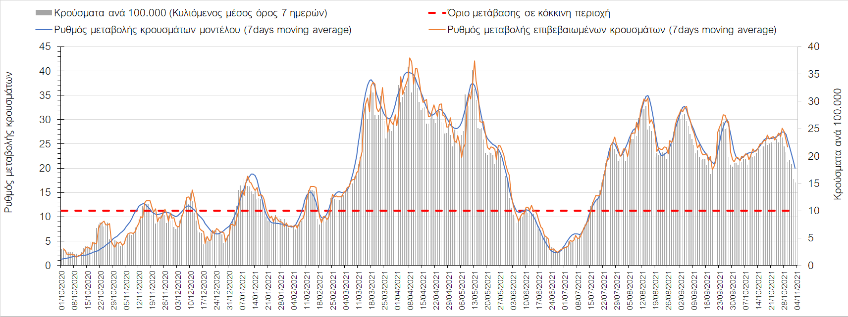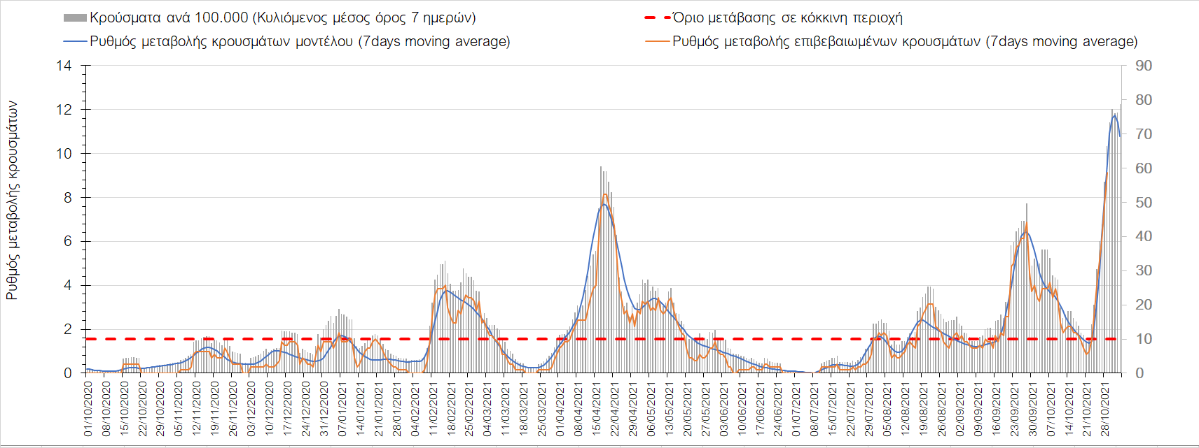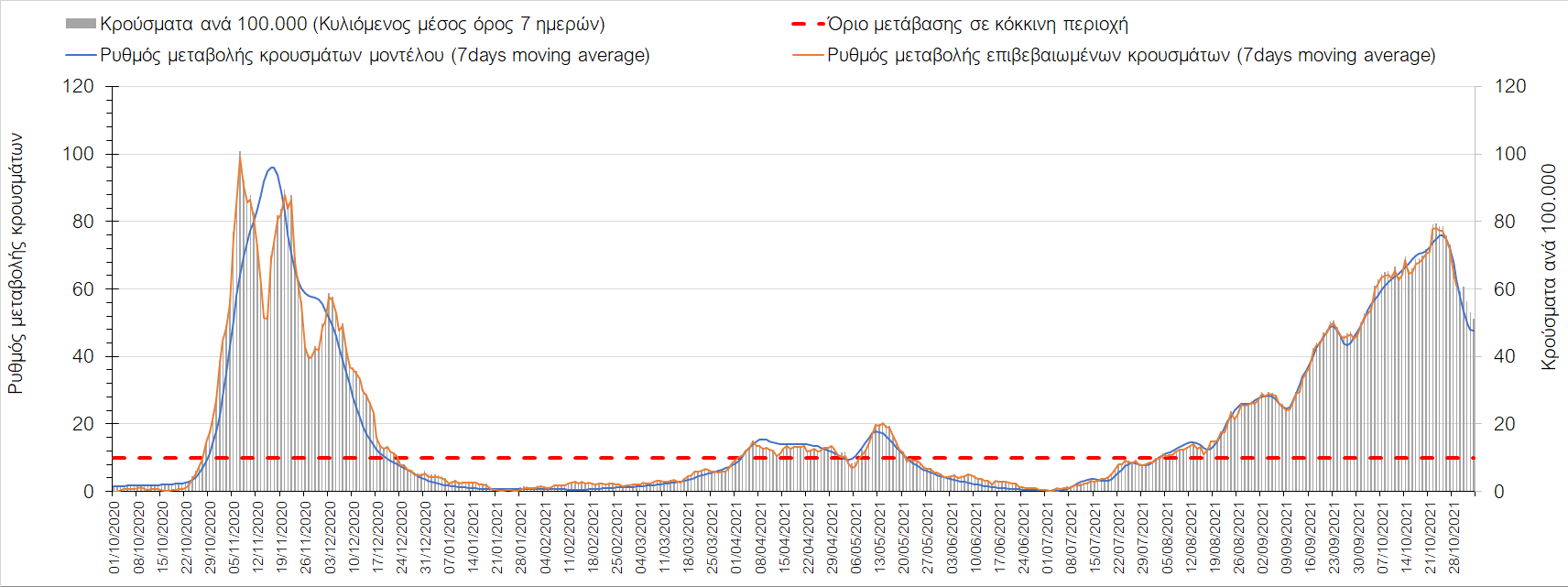 Για την ώρα παρατηρείται σχετικά συγκρατημένη (αλλά επιταχυνόμενη) αύξηση του αριθμού των κρουσμάτων, που υποβοηθείται από το συνολικά μεγάλο αριθμό τεστ που γίνονται καθημερινά, αλλά η προοδευτική μείωση της θερμοκρασίας και η επαγόμενη αύξηση της μεταδοτικότητας, οδηγούν στην ανοδική τάση της φθινοπωρινής και χειμερινής περιόδου.