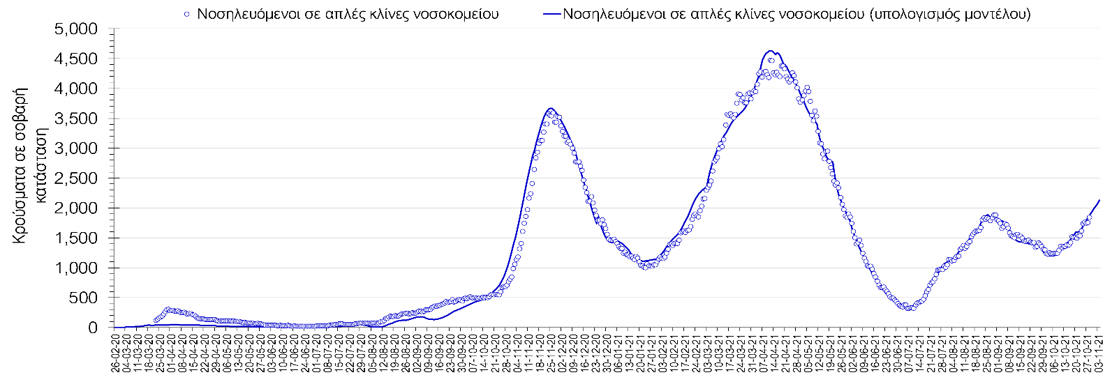 Σχήμα 2. Αριθμός κρουσμάτων σε σοβαρή κατάσταση (νοσηλευόμενοι σε απλές κλίνες) σύμφωνα με τα στοιχεία του ΕΟΔΥ και τις προβλέψεις της υπολογιστικής πλατφόρμας CORE.