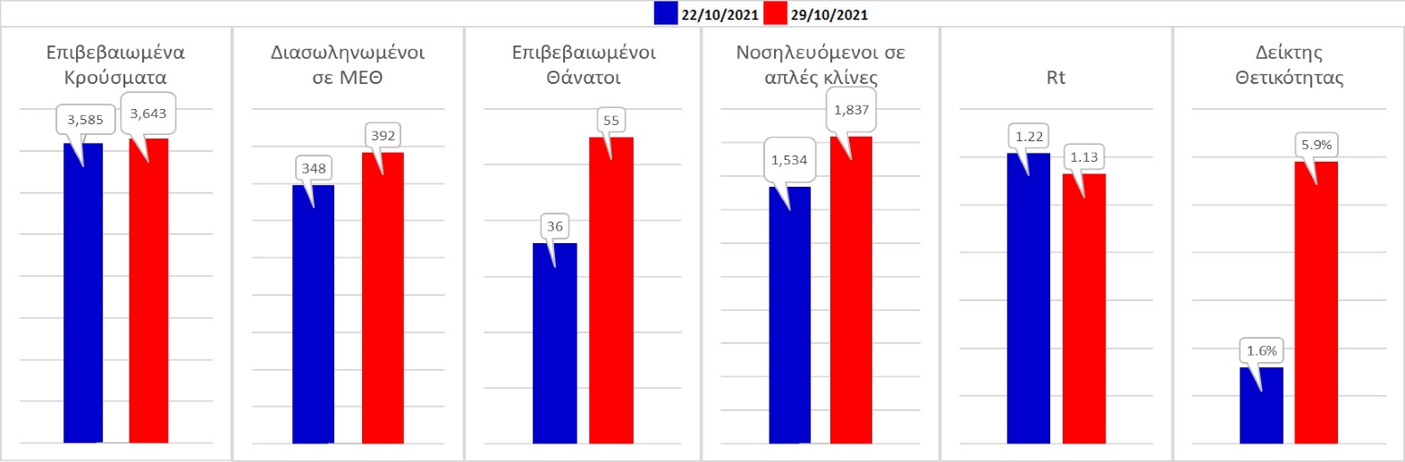 Σχήμα 59. Συγκριτικά αποτελέσματα της επιδημιολογικής εικόνας της σημερινής Παρασκευής (29/10/2021) σε σχέση με την προηγούμενη (22/10/2021)