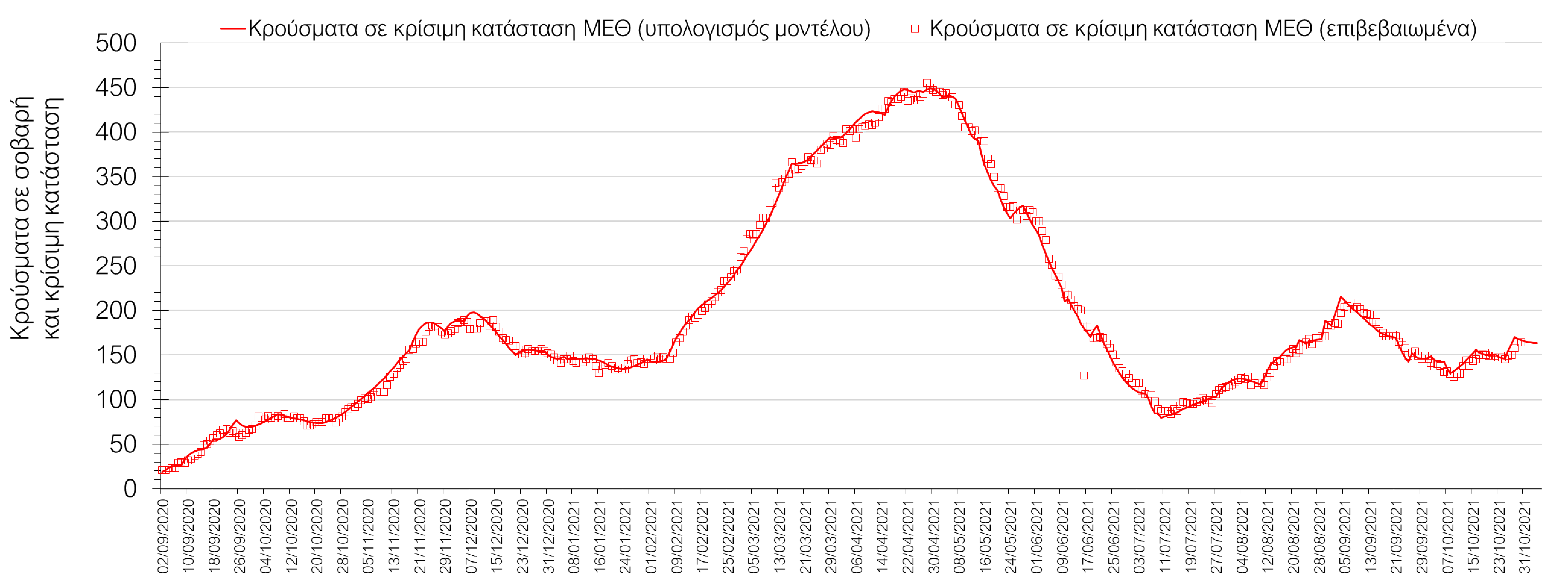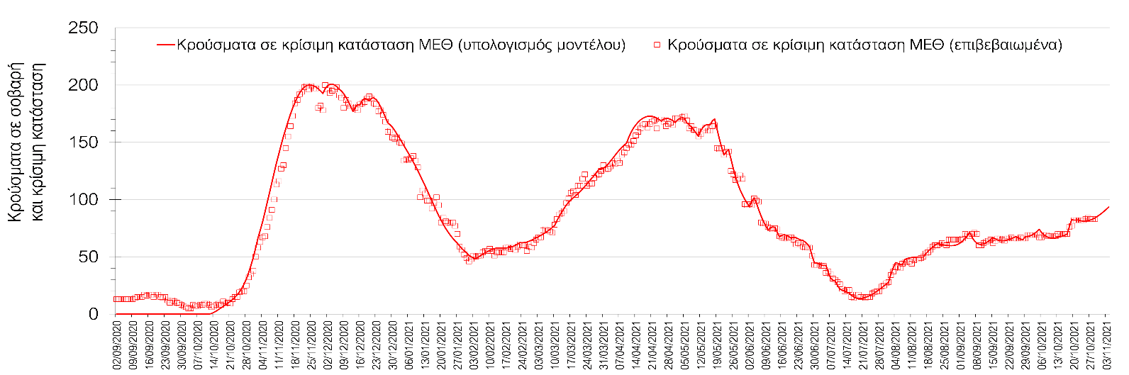 Η πορεία της μέσης εβδομαδιαίας τιμής των κρουσμάτων, καθώς και του κυλιόμενου μέσου όρου 7 ημερών του αριθμού των κρουσμάτων ανά 100.000 πληθυσμού, όπως έχουν καταγραφεί από τον ΕΟΔΥ και η αναμενόμενη πορεία τους όπως προδιαγράφεται από την υπολογιστική πλατφόρμα CORE για την Ελληνική επικράτεια μέχρι τις 31 Οκτωβρίου, αποτυπώνονται στο Σχήμα 4. Αυτή η προβλεπόμενη πορεία, που αφορά τα κρούσματα, τους νοσηλευόμενους σε απλές κλίνες, όσο και σε ΜΕΘ, καθώς επίσης και τους θανάτους, βασίζεται στις ακόλουθες παραδοχές:
