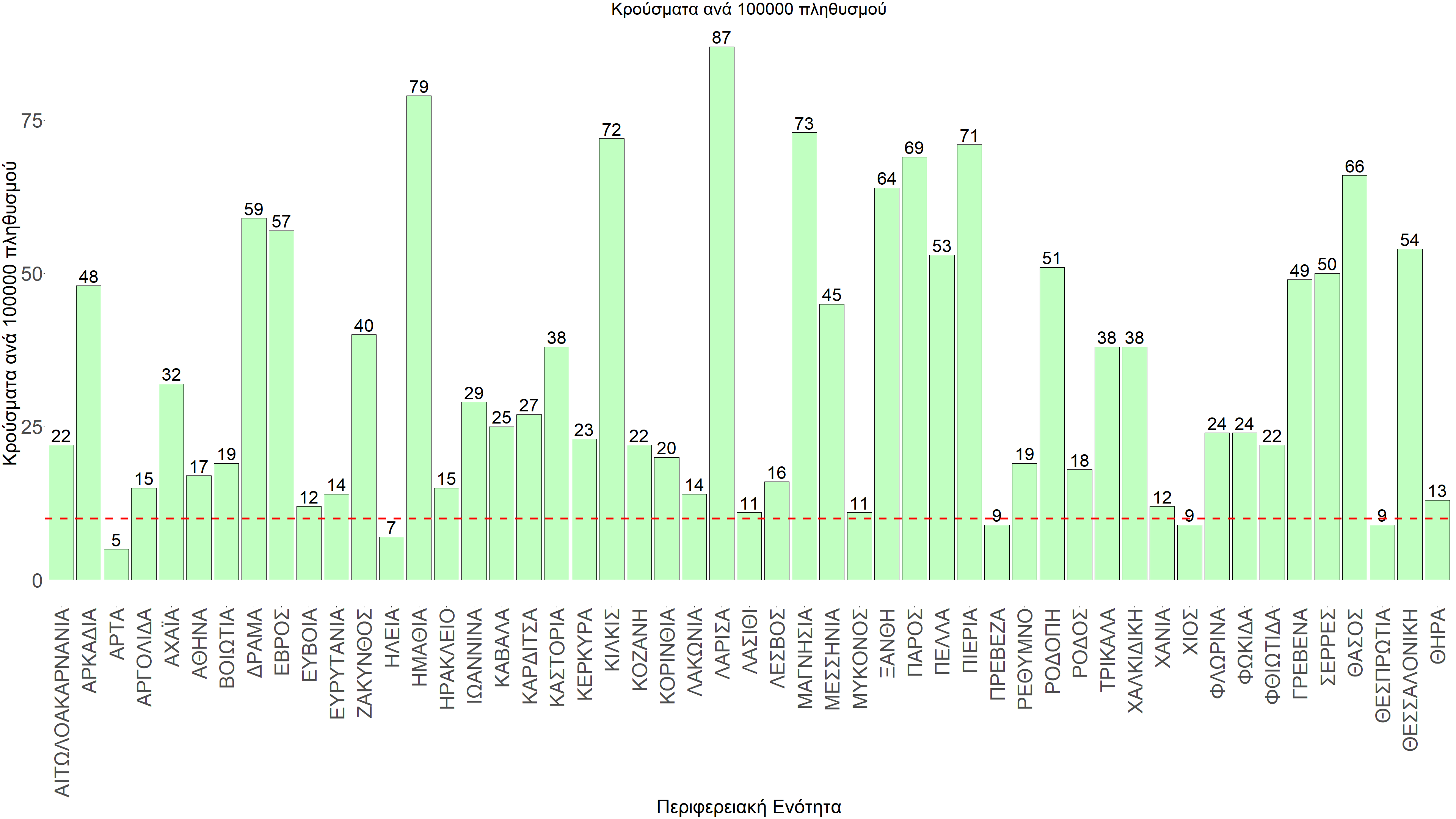 Η αποτύπωση των τάσεων στις επιμέρους περιοχές, παρουσιάζεται στο Σχήμα 61, όπου παρουσιάζεται ο ρυθμός μεταβολής των νέων κρουσμάτων ανά 100.000 κατοίκους (κυλιόμενος μέσος όρος 7 ημερών) των επιμέρους περιοχών. Θετικές τιμές του ρυθμού μεταβολής υποδηλώνουν άνοδο, ενώ αρνητικές τιμές υποδηλώνουν πτωτική πορεία. Το σχήμα αυτό είναι ιδιαίτερα κατατοπιστικό, γιατί οι τιμές που παρουσιάζονται είναι κανονικοποιημένες ως προς τον πληθυσμό, και η σύγκριση των τάσεων ανάμεσα στις επιμέρους περιοχές είναι άμεση. Με βάση και τα σημερινά δεδομένα, πολύ λίγες περιοχές της χώρα παρουσιάζουν αποκλιμάκωση της πανδημίας, πέρα από κάποιες που είναι είτε σε σταθεροποίηση (Λασίθι), είτε διανύουν διακυμάνσεις από μέρα σε μέρα (Θάσος, Λέσβος)