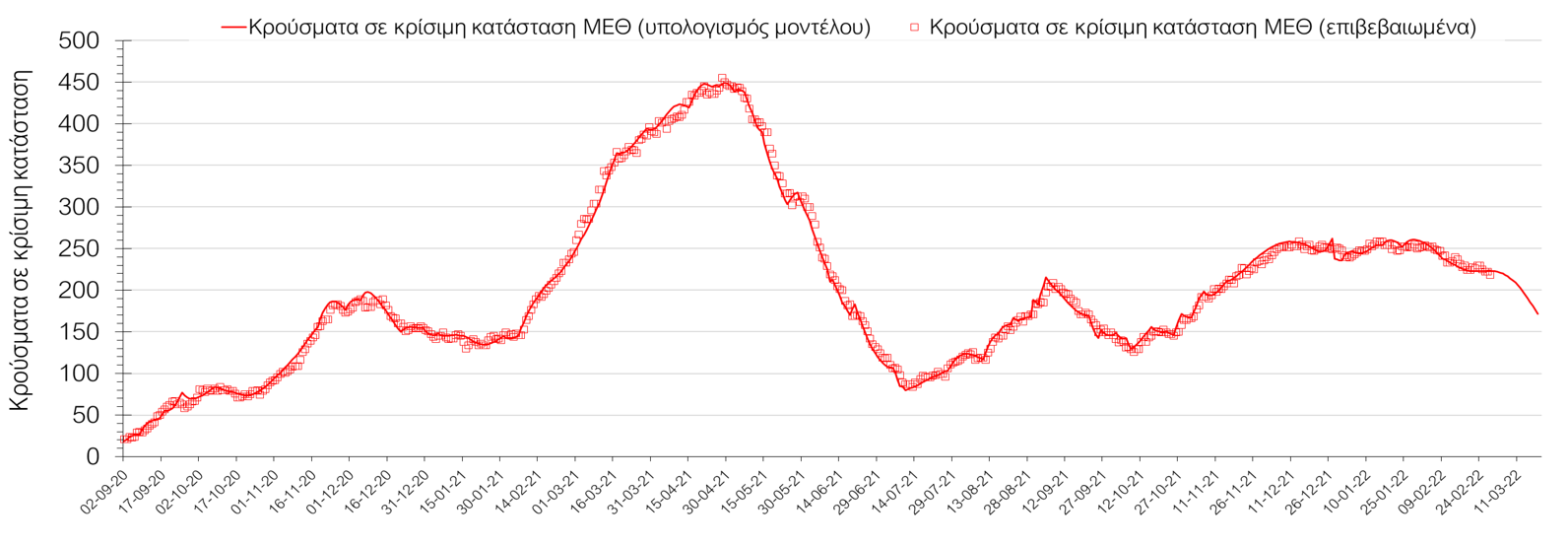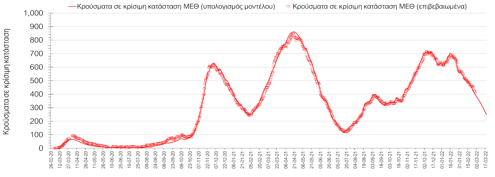 Η πορεία της μέσης εβδομαδιαίας τιμής των κρουσμάτων, καθώς και του κυλιόμενου μέσου όρου 7 ημερών του αριθμού των κρουσμάτων ανά 100.000 πληθυσμού, όπως έχουν καταγραφεί από τον ΕΟΔΥ και η αναμενόμενη πορεία τους, όπως προδιαγράφεται από την υπολογιστική πλατφόρμα CORE για την Ελληνική επικράτεια (όπως και στην Αττική και τη Θεσσαλονίκη) μέχρι τις 15 Μαρτίου, αποτυπώνονται στο Σχήμα 4. Αυτή η προβλεπόμενη πορεία, που αφορά τα κρούσματα, τους νοσηλευόμενους σε απλές κλίνες, όσο και σε ΜΕΘ, καθώς επίσης και τους θανάτους, βασίζεται στις ακόλουθες παραδοχές: