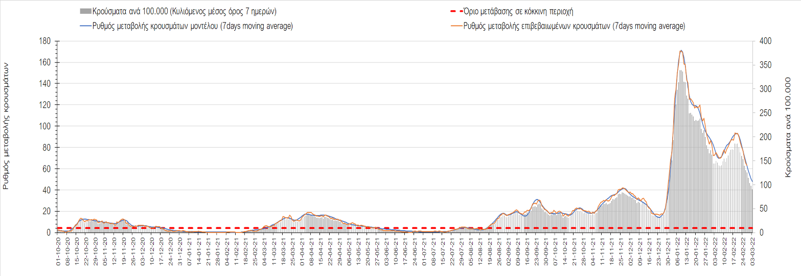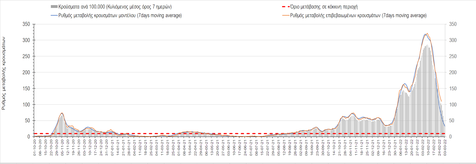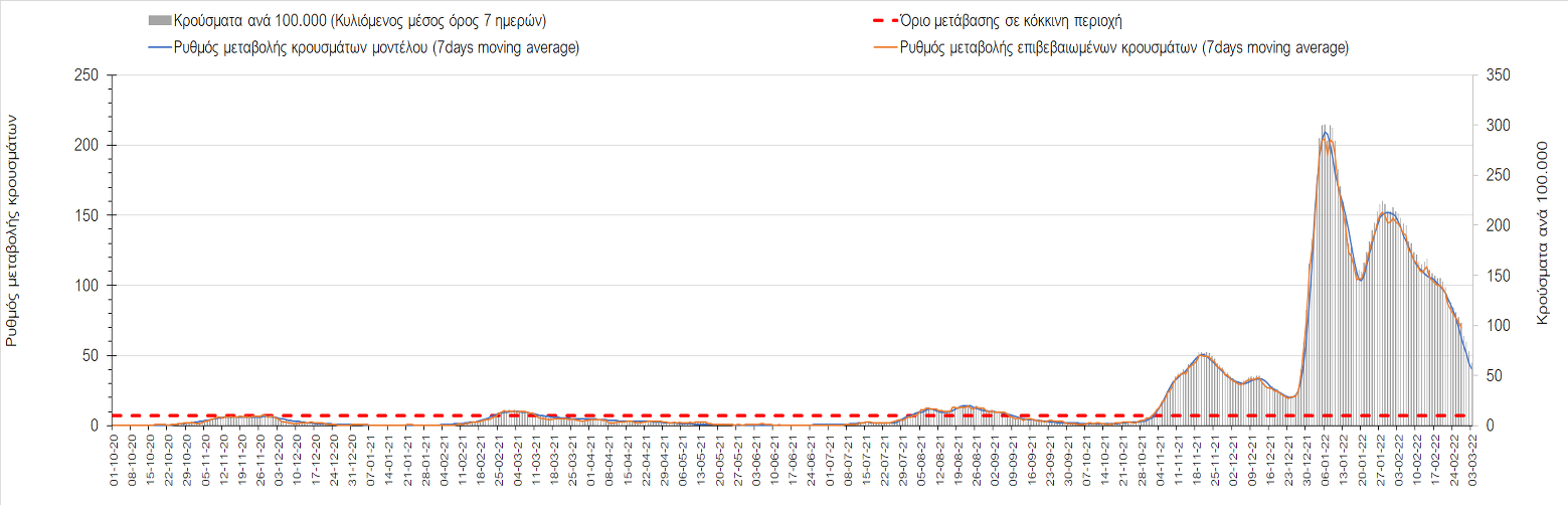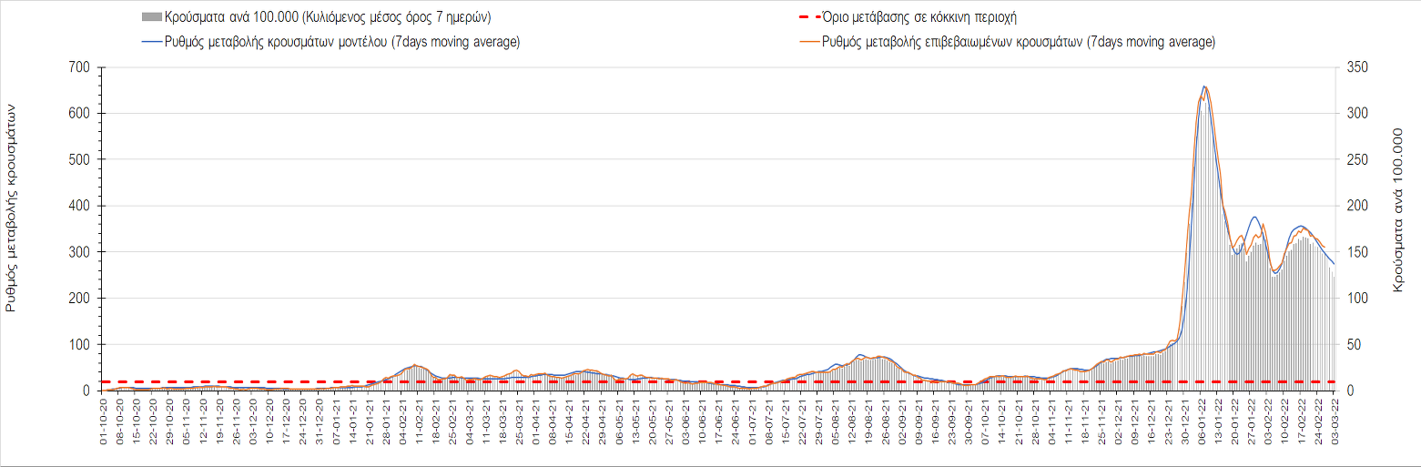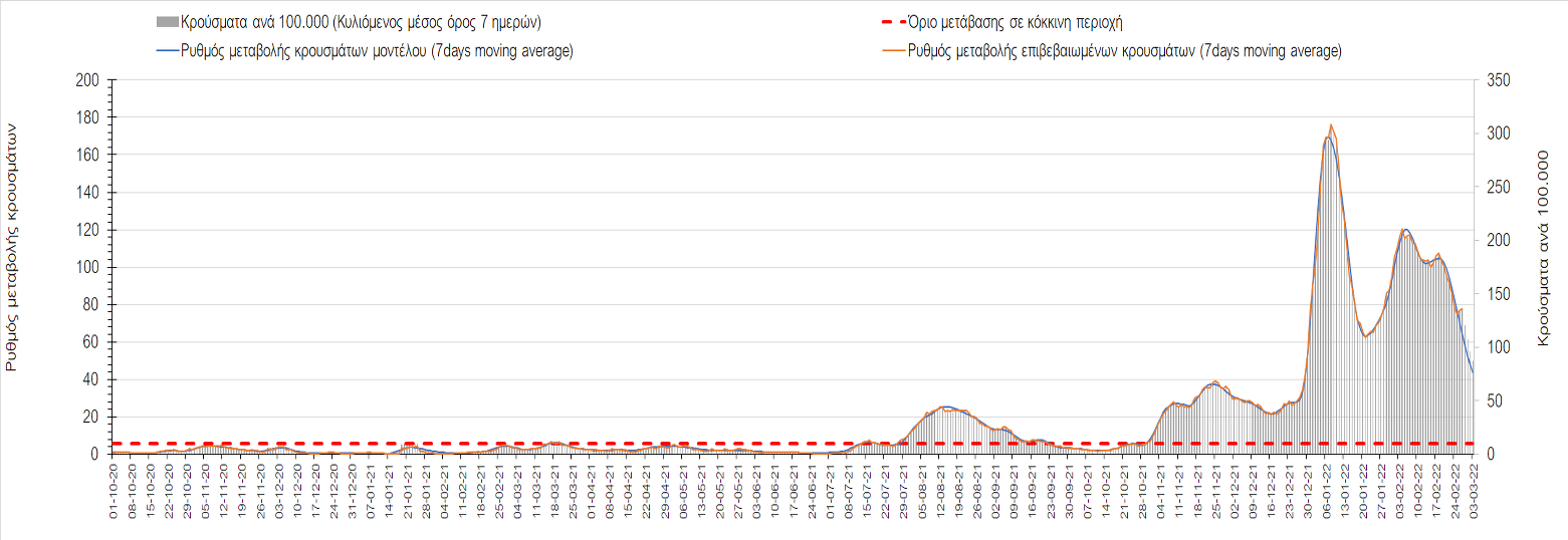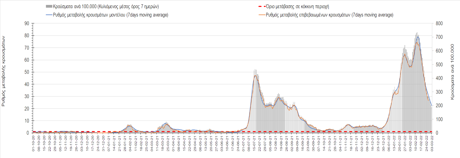 Πλέον όλες σχεδόν οι περιοχές, μετά από σχεδόν 4 εβδομάδες σε σταθεροποίηση είναι σε πτωτική πορεία που αντικατοπτρίζεται και στον ημερήσιο αριθμό των κρουσμάτων (κυλιόμενος μέσος όρος 7 ημερών), ο οποίος βρίσκεται μόλις πάνω από τις 15.000 (15.216). Για να επανέλθει η ταχεία αποκλιμάκωση της πανδημίας, πέρα από την εφαρμογή των μέτρων (σε συνδυασμό με την σημαντική συνειδητοποίηση εκ μέρους του πληθυσμού ότι χρειάζεται προσοχή και σύνεση για την αντιμετώπιση της διασποράς της παραλλαγής Ο), θα πρέπει να στοχεύσουμε στη διατήρηση και την επέκταση της επίκτητης ανοσίας του πληθυσμού, αλλά και στον πολύ μεγάλο αριθμό των τεστ συνολικά (μοριακά, rapid και self-test) που πραγματοποιούνται καθημερινά, των οποίων ο αριθμός έχει φθάσει σε ημερήσια βάση τις 700.000. Αυτά σε συνδυασμό με τη φυσική ανοσία του πληθυσμού μετά από νόσηση, θα συντελέσουν στην συστηματική αποκλιμάκωση της πανδημίας. Αντίθετα, με τον υπάρχοντα ρυθμό εμβολιασμού αναμνηστικών δόσεων, έχει ήδη καθυστερήσει να επέλθει η πορεία αποκλιμάκωσης, στην οποία διαφαίνεται να εισερχόμαστε πλέον, με την προϋπόθεση ότι θα υπάρξει σύνεση στην εφαρμογή των υπαρχόντων μέτρων.