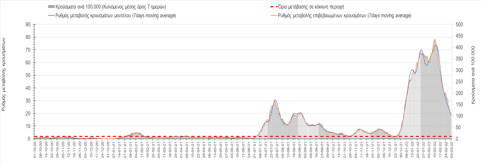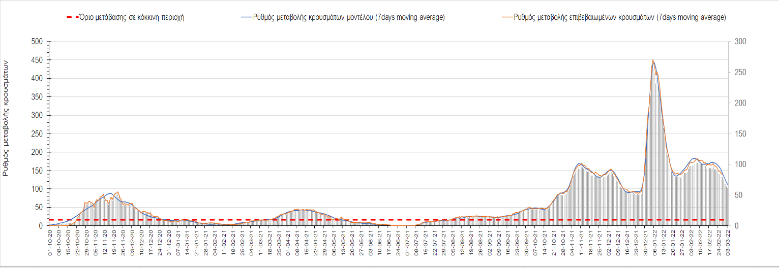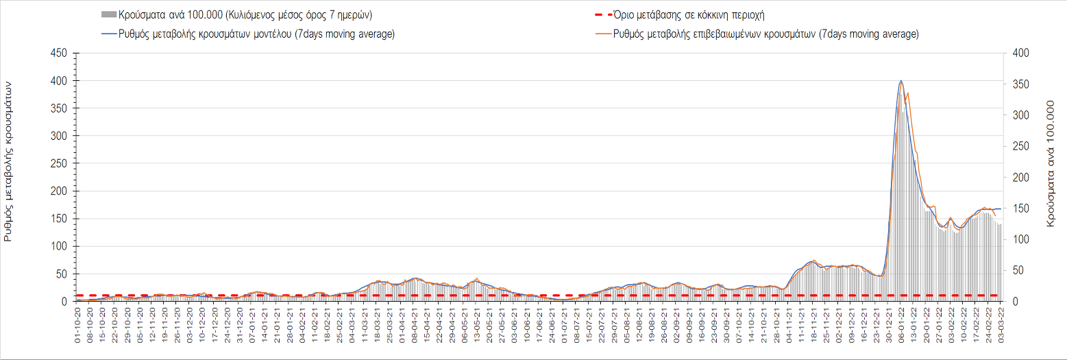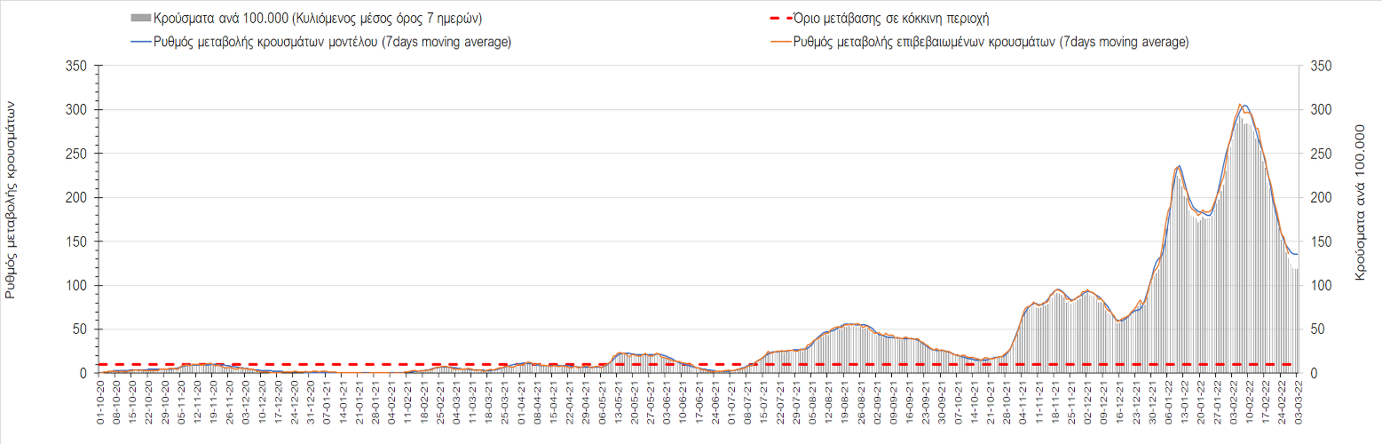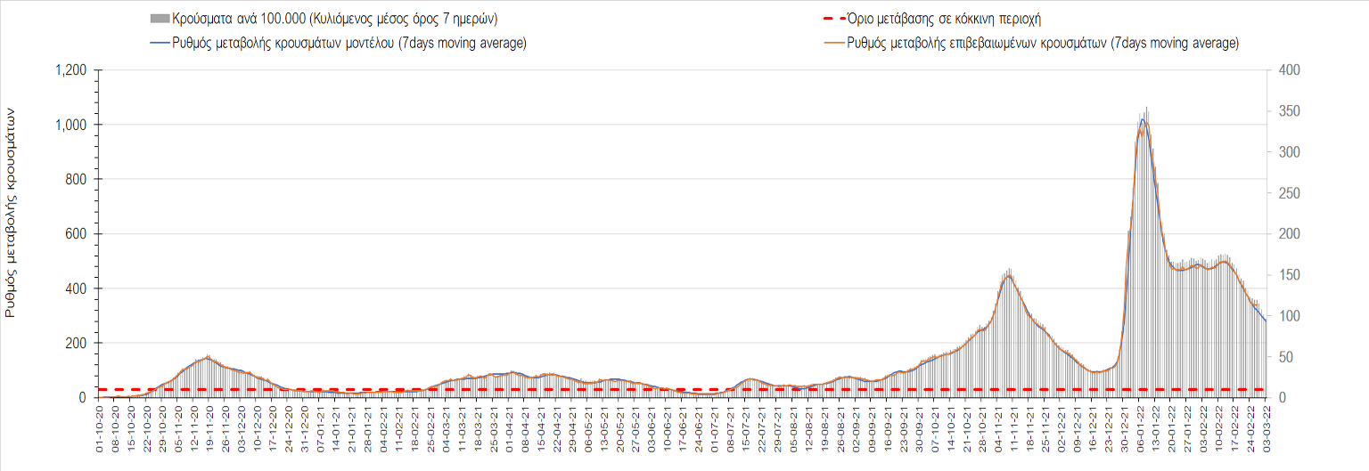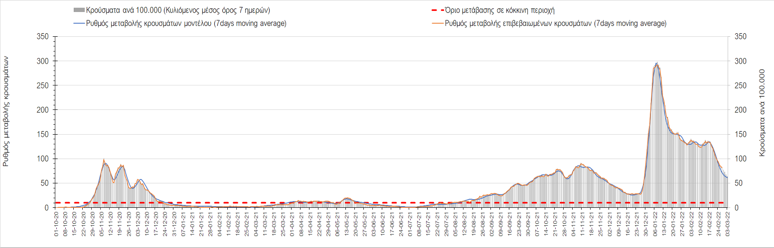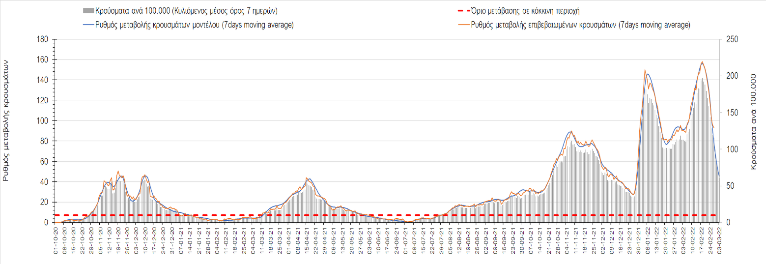 Πλέον όλες σχεδόν οι περιοχές, μετά από σχεδόν 4 εβδομάδες σε σταθεροποίηση είναι σε πτωτική πορεία που αντικατοπτρίζεται και στον ημερήσιο αριθμό των κρουσμάτων (κυλιόμενος μέσος όρος 7 ημερών), ο οποίος βρίσκεται μόλις πάνω από τις 15.000 (15.216). Για να επανέλθει η ταχεία αποκλιμάκωση της πανδημίας, πέρα από την εφαρμογή των μέτρων (σε συνδυασμό με την σημαντική συνειδητοποίηση εκ μέρους του πληθυσμού ότι χρειάζεται προσοχή και σύνεση για την αντιμετώπιση της διασποράς της παραλλαγής Ο), θα πρέπει να στοχεύσουμε στη διατήρηση και την επέκταση της επίκτητης ανοσίας του πληθυσμού, αλλά και στον πολύ μεγάλο αριθμό των τεστ συνολικά (μοριακά, rapid και self-test) που πραγματοποιούνται καθημερινά, των οποίων ο αριθμός έχει φθάσει σε ημερήσια βάση τις 700.000. Αυτά σε συνδυασμό με τη φυσική ανοσία του πληθυσμού μετά από νόσηση, θα συντελέσουν στην συστηματική αποκλιμάκωση της πανδημίας. Αντίθετα, με τον υπάρχοντα ρυθμό εμβολιασμού αναμνηστικών δόσεων, έχει ήδη καθυστερήσει να επέλθει η πορεία αποκλιμάκωσης, στην οποία διαφαίνεται να εισερχόμαστε πλέον, με την προϋπόθεση ότι θα υπάρξει σύνεση στην εφαρμογή των υπαρχόντων μέτρων.