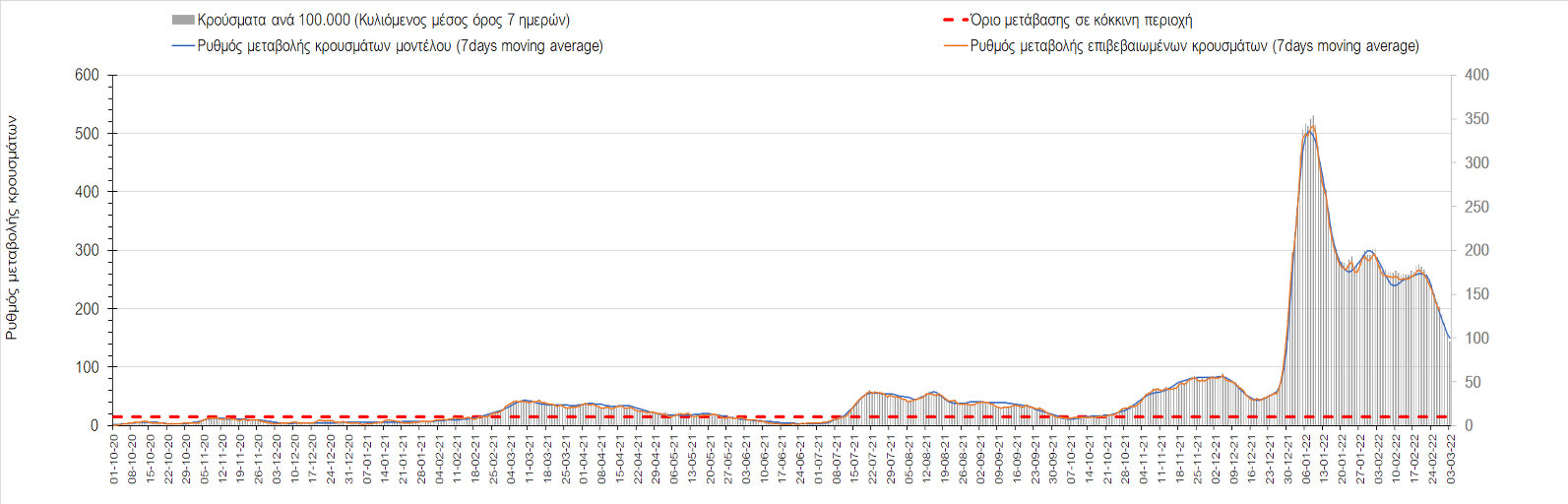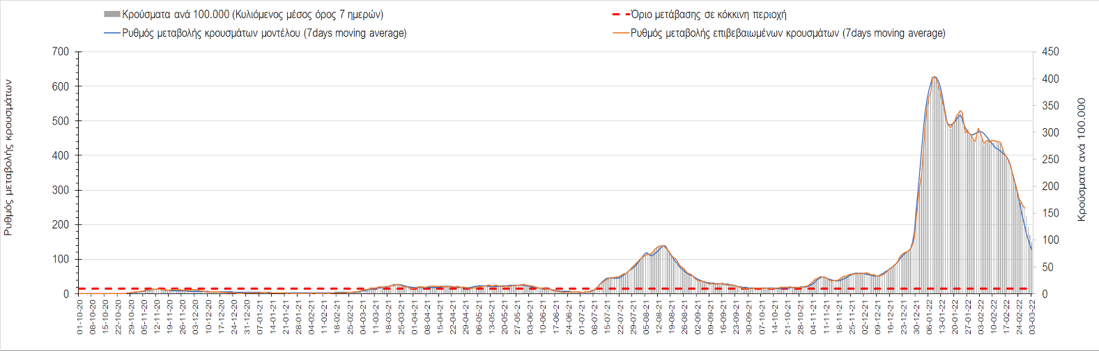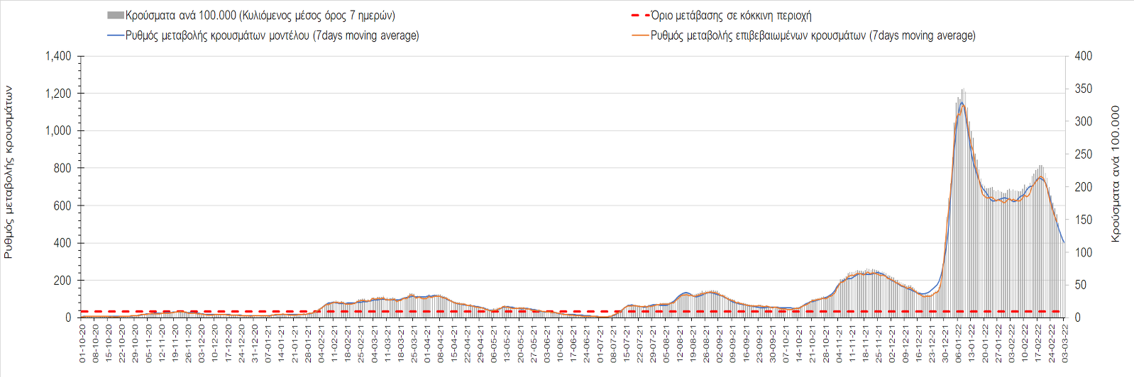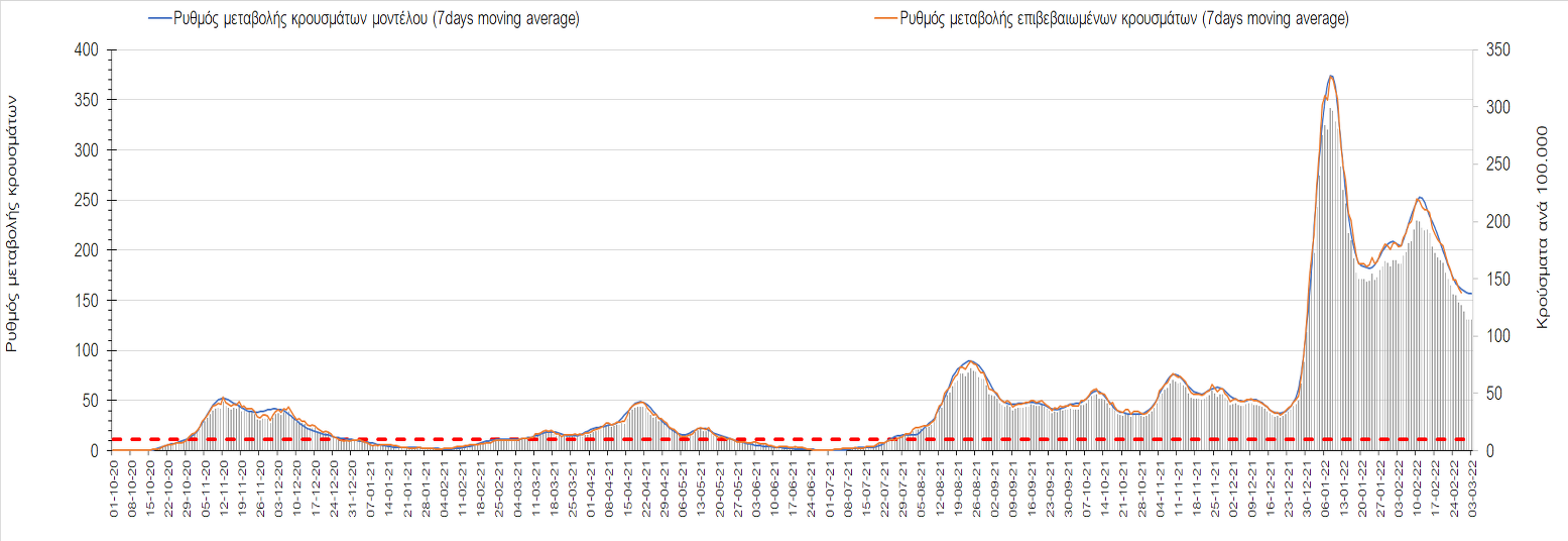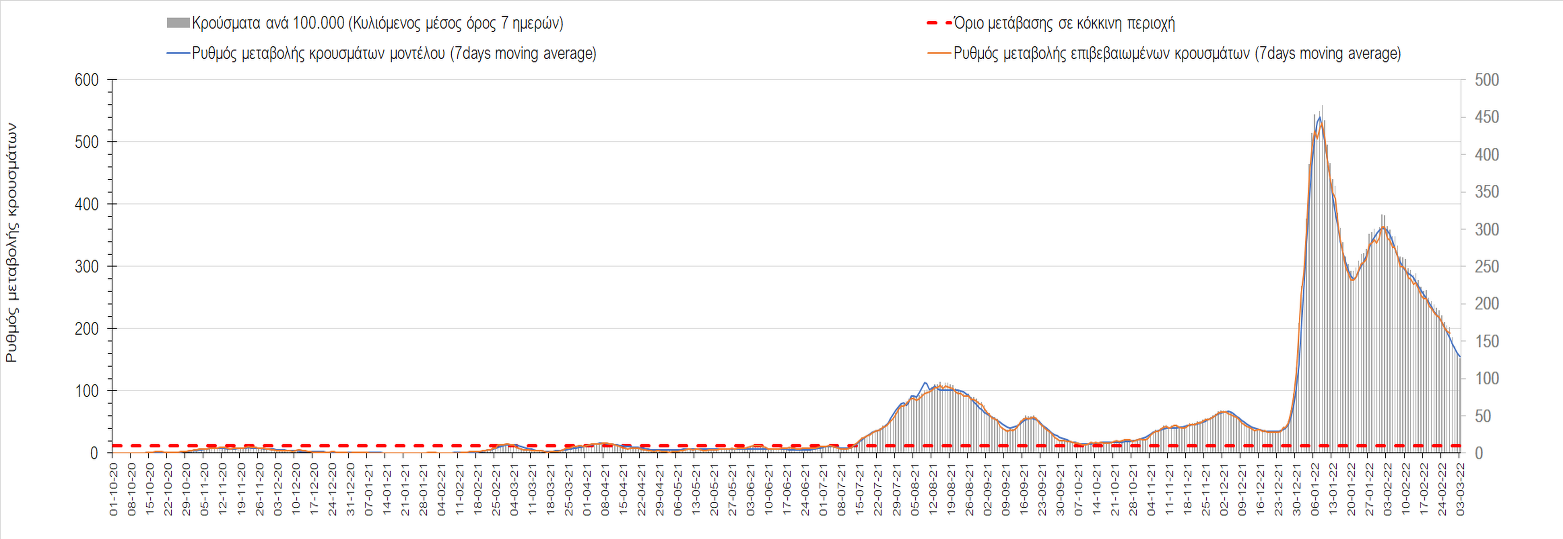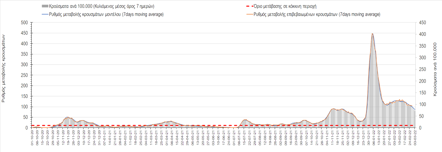 Πλέον όλες σχεδόν οι περιοχές, μετά από σχεδόν 4 εβδομάδες σε σταθεροποίηση είναι σε πτωτική πορεία που αντικατοπτρίζεται και στον ημερήσιο αριθμό των κρουσμάτων (κυλιόμενος μέσος όρος 7 ημερών), ο οποίος βρίσκεται μόλις πάνω από τις 15.000 (15.216). Για να επανέλθει η ταχεία αποκλιμάκωση της πανδημίας, πέρα από την εφαρμογή των μέτρων (σε συνδυασμό με την σημαντική συνειδητοποίηση εκ μέρους του πληθυσμού ότι χρειάζεται προσοχή και σύνεση για την αντιμετώπιση της διασποράς της παραλλαγής Ο), θα πρέπει να στοχεύσουμε στη διατήρηση και την επέκταση της επίκτητης ανοσίας του πληθυσμού, αλλά και στον πολύ μεγάλο αριθμό των τεστ συνολικά (μοριακά, rapid και self-test) που πραγματοποιούνται καθημερινά, των οποίων ο αριθμός έχει φθάσει σε ημερήσια βάση τις 700.000. Αυτά σε συνδυασμό με τη φυσική ανοσία του πληθυσμού μετά από νόσηση, θα συντελέσουν στην συστηματική αποκλιμάκωση της πανδημίας. Αντίθετα, με τον υπάρχοντα ρυθμό εμβολιασμού αναμνηστικών δόσεων, έχει ήδη καθυστερήσει να επέλθει η πορεία αποκλιμάκωσης, στην οποία διαφαίνεται να εισερχόμαστε πλέον, με την προϋπόθεση ότι θα υπάρξει σύνεση στην εφαρμογή των υπαρχόντων μέτρων.