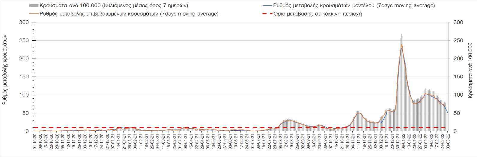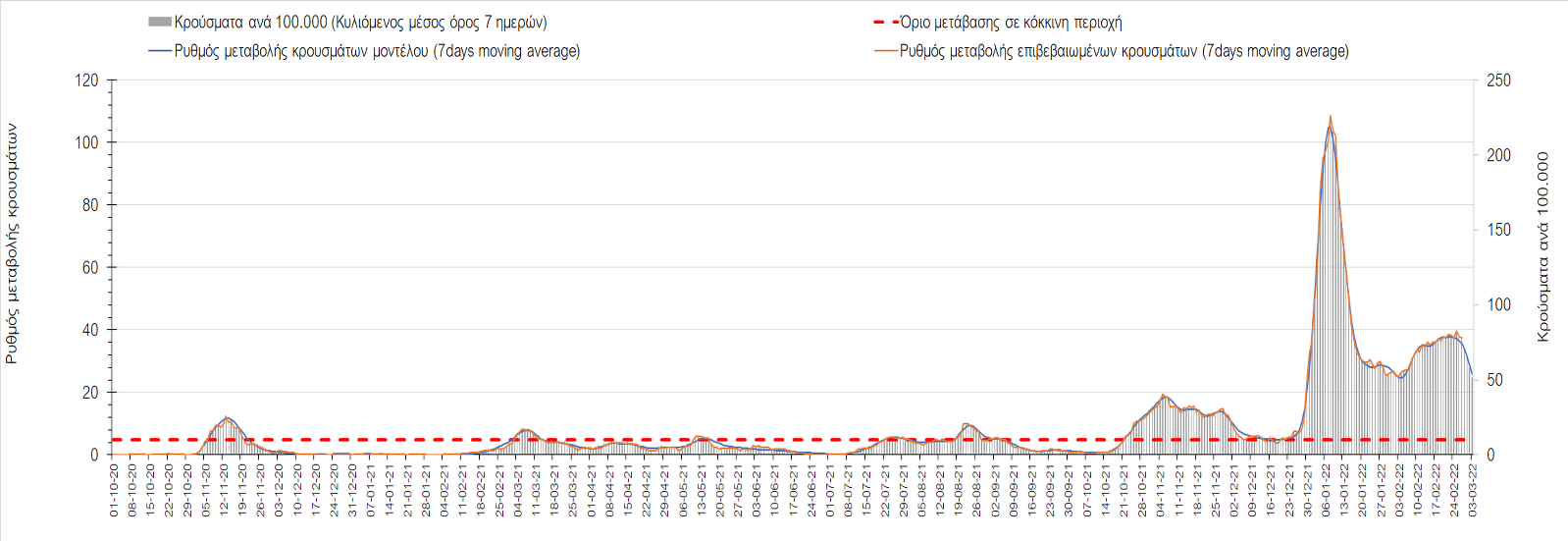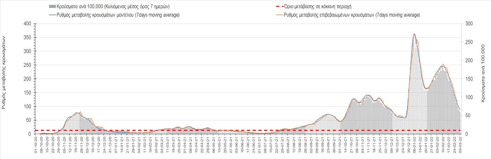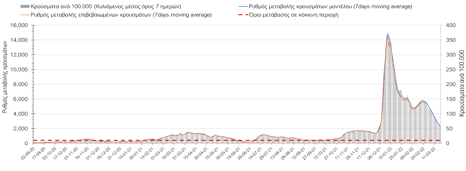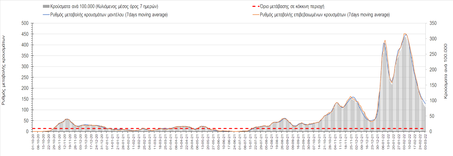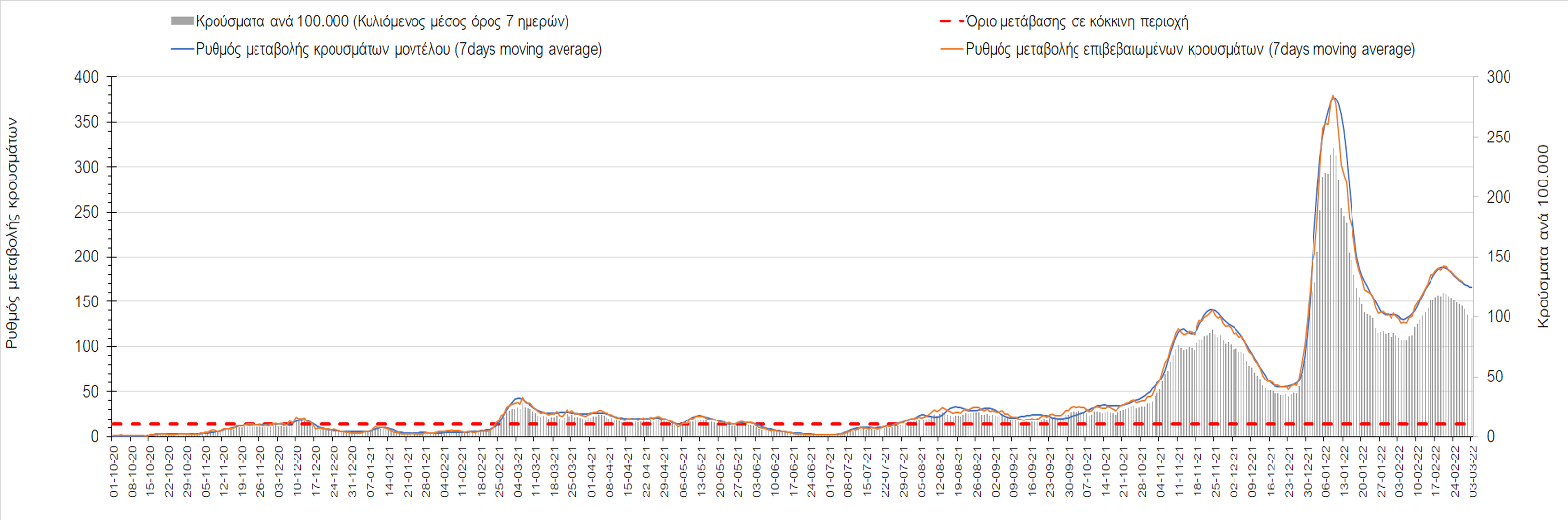 Πλέον όλες σχεδόν οι περιοχές, μετά από σχεδόν 4 εβδομάδες σε σταθεροποίηση είναι σε πτωτική πορεία που αντικατοπτρίζεται και στον ημερήσιο αριθμό των κρουσμάτων (κυλιόμενος μέσος όρος 7 ημερών), ο οποίος βρίσκεται μόλις πάνω από τις 15.000 (15.216). Για να επανέλθει η ταχεία αποκλιμάκωση της πανδημίας, πέρα από την εφαρμογή των μέτρων (σε συνδυασμό με την σημαντική συνειδητοποίηση εκ μέρους του πληθυσμού ότι χρειάζεται προσοχή και σύνεση για την αντιμετώπιση της διασποράς της παραλλαγής Ο), θα πρέπει να στοχεύσουμε στη διατήρηση και την επέκταση της επίκτητης ανοσίας του πληθυσμού, αλλά και στον πολύ μεγάλο αριθμό των τεστ συνολικά (μοριακά, rapid και self-test) που πραγματοποιούνται καθημερινά, των οποίων ο αριθμός έχει φθάσει σε ημερήσια βάση τις 700.000. Αυτά σε συνδυασμό με τη φυσική ανοσία του πληθυσμού μετά από νόσηση, θα συντελέσουν στην συστηματική αποκλιμάκωση της πανδημίας. Αντίθετα, με τον υπάρχοντα ρυθμό εμβολιασμού αναμνηστικών δόσεων, έχει ήδη καθυστερήσει να επέλθει η πορεία αποκλιμάκωσης, στην οποία διαφαίνεται να εισερχόμαστε πλέον, με την προϋπόθεση ότι θα υπάρξει σύνεση στην εφαρμογή των υπαρχόντων μέτρων.