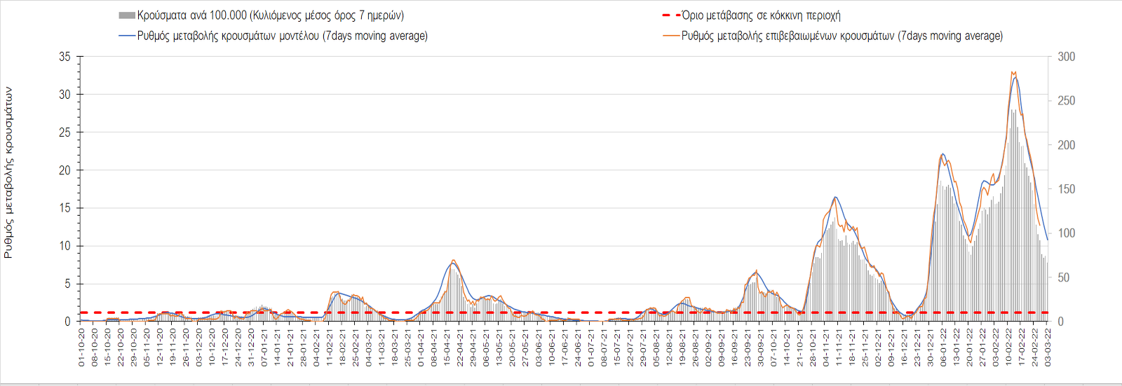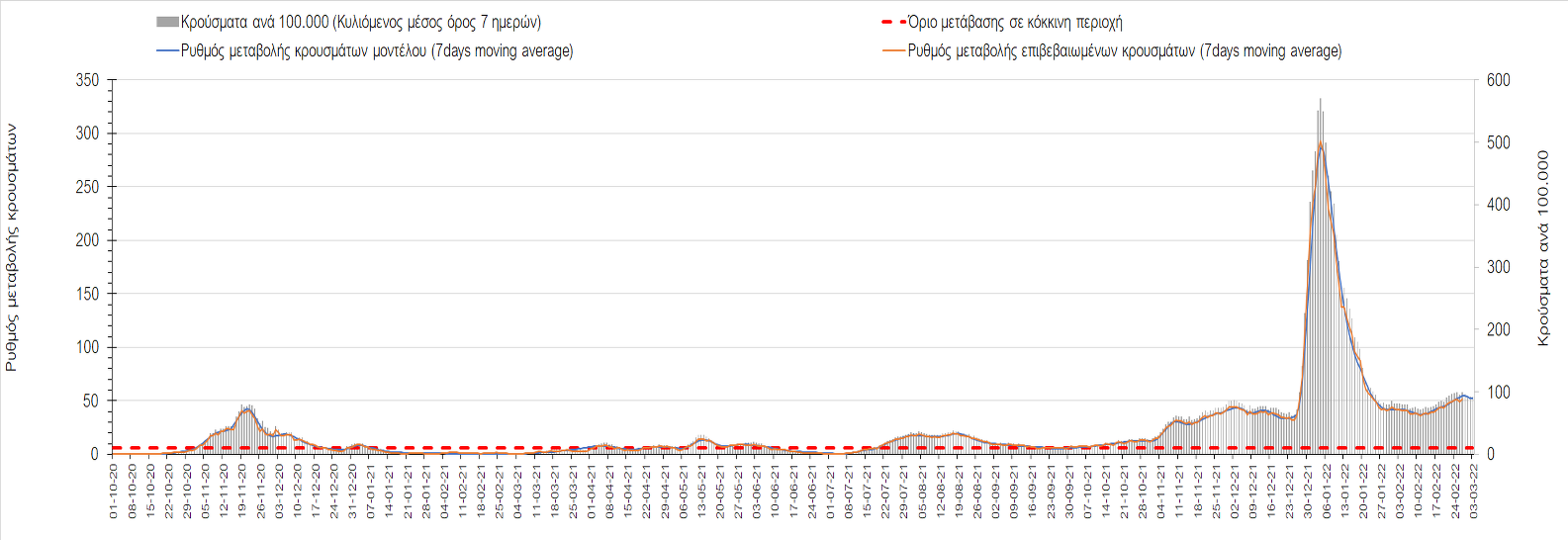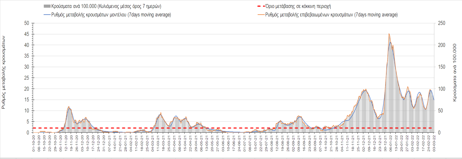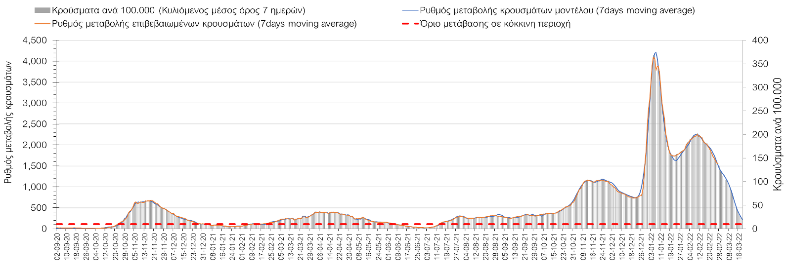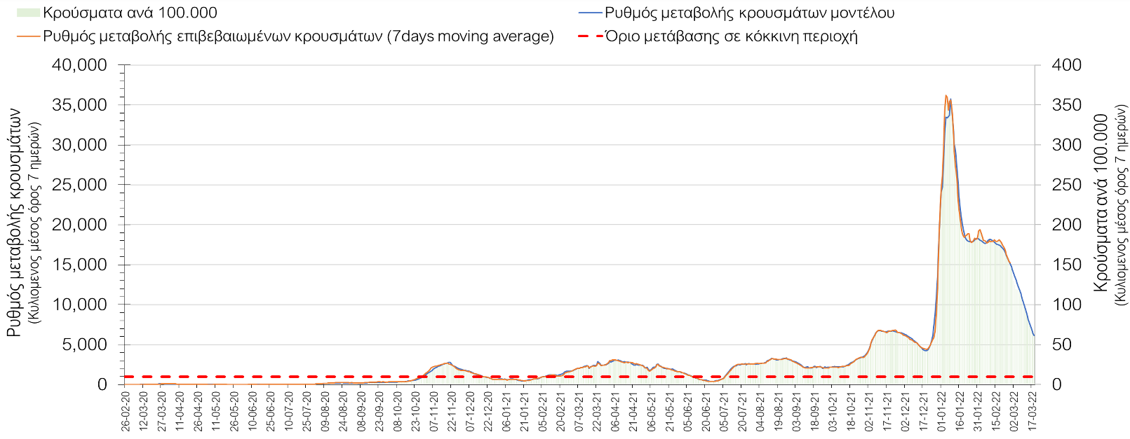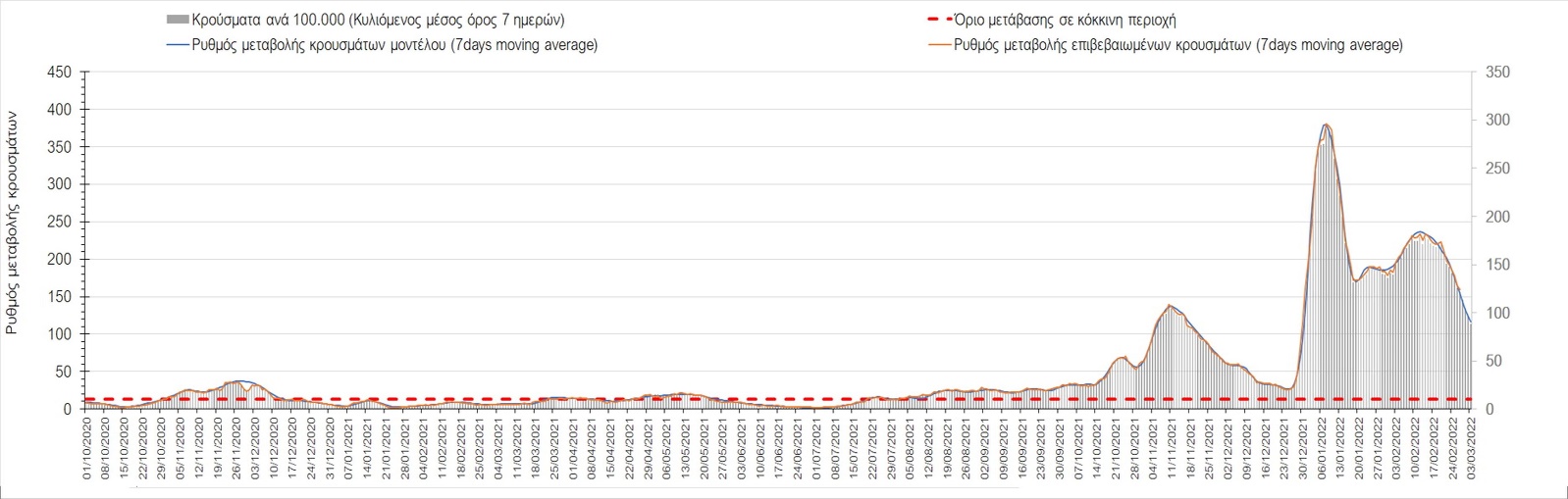 Πλέον όλες σχεδόν οι περιοχές, μετά από σχεδόν 4 εβδομάδες σε σταθεροποίηση είναι σε πτωτική πορεία που αντικατοπτρίζεται και στον ημερήσιο αριθμό των κρουσμάτων (κυλιόμενος μέσος όρος 7 ημερών), ο οποίος βρίσκεται μόλις πάνω από τις 15.000 (15.216). Για να επανέλθει η ταχεία αποκλιμάκωση της πανδημίας, πέρα από την εφαρμογή των μέτρων (σε συνδυασμό με την σημαντική συνειδητοποίηση εκ μέρους του πληθυσμού ότι χρειάζεται προσοχή και σύνεση για την αντιμετώπιση της διασποράς της παραλλαγής Ο), θα πρέπει να στοχεύσουμε στη διατήρηση και την επέκταση της επίκτητης ανοσίας του πληθυσμού, αλλά και στον πολύ μεγάλο αριθμό των τεστ συνολικά (μοριακά, rapid και self-test) που πραγματοποιούνται καθημερινά, των οποίων ο αριθμός έχει φθάσει σε ημερήσια βάση τις 700.000. Αυτά σε συνδυασμό με τη φυσική ανοσία του πληθυσμού μετά από νόσηση, θα συντελέσουν στην συστηματική αποκλιμάκωση της πανδημίας. Αντίθετα, με τον υπάρχοντα ρυθμό εμβολιασμού αναμνηστικών δόσεων, έχει ήδη καθυστερήσει να επέλθει η πορεία αποκλιμάκωσης, στην οποία διαφαίνεται να εισερχόμαστε πλέον, με την προϋπόθεση ότι θα υπάρξει σύνεση στην εφαρμογή των υπαρχόντων μέτρων.