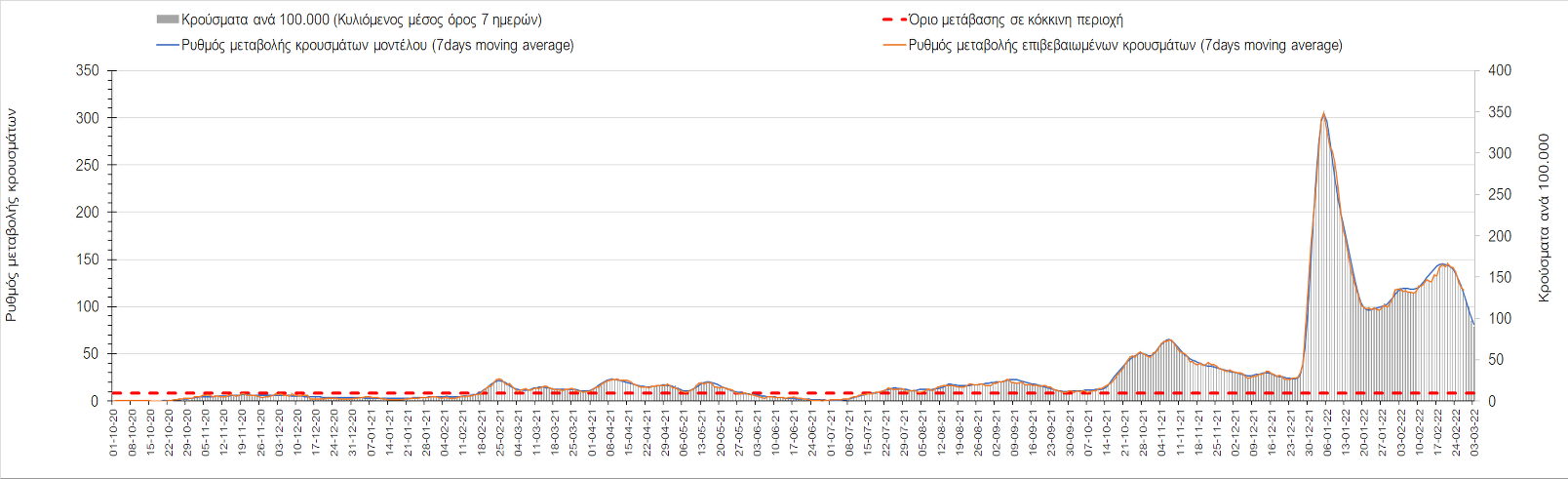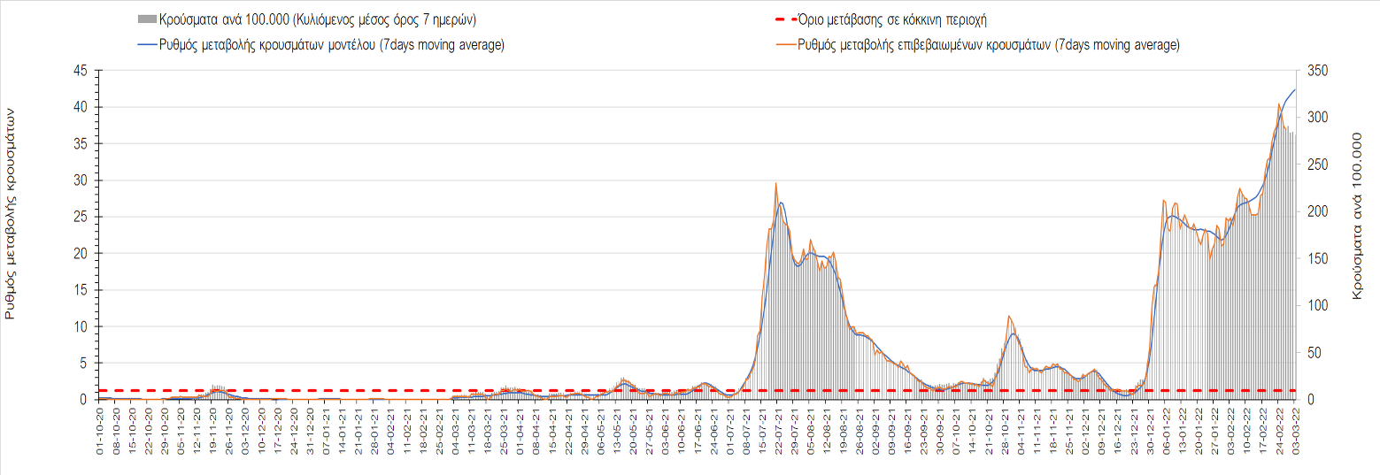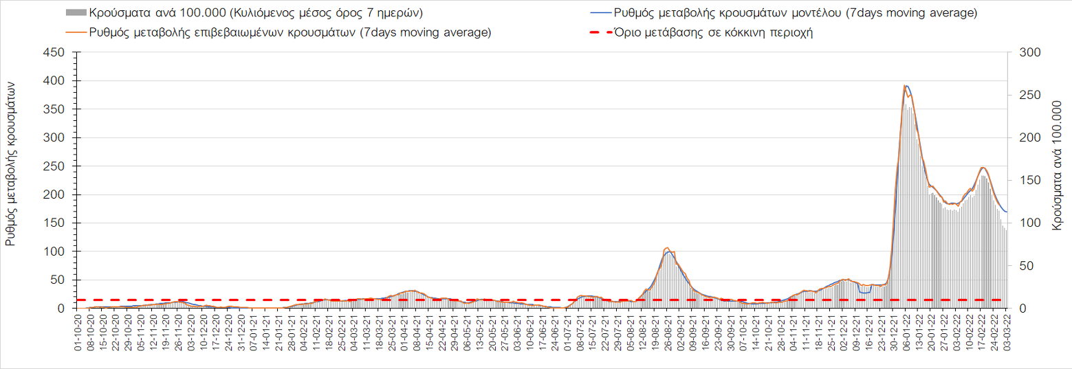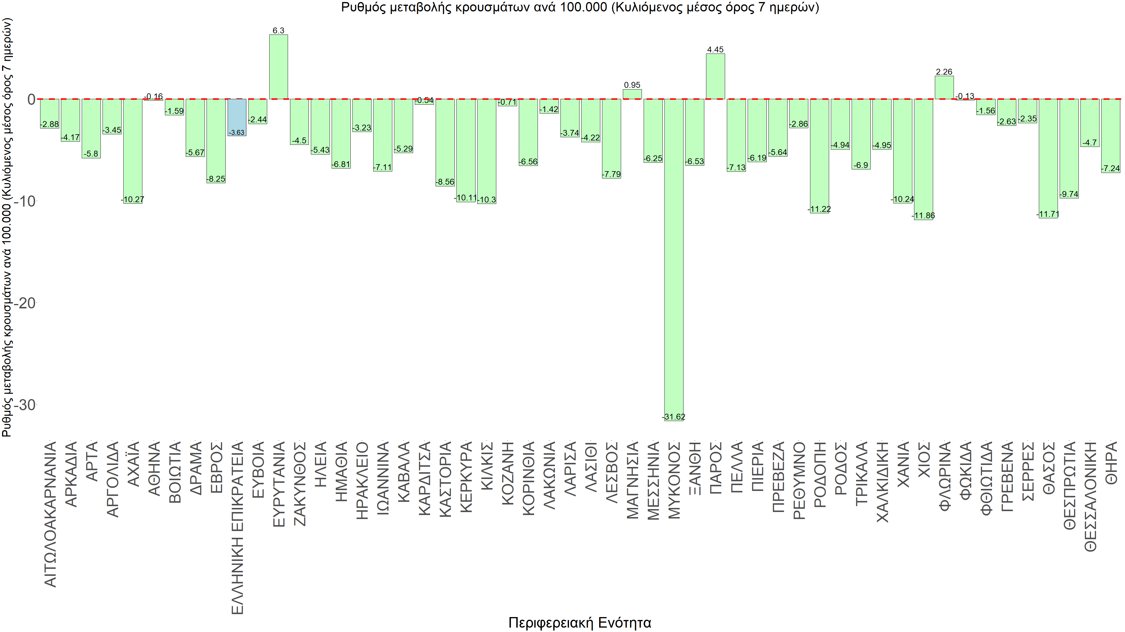 Η αποτύπωση των τάσεων στις επιμέρους περιοχές, παρουσιάζεται στο Σχήμα 61, όπου παρουσιάζεται ο ρυθμός μεταβολής των νέων κρουσμάτων ανά 100.000 κατοίκους (κυλιόμενος μέσος όρος 7 ημερών) των επιμέρους περιοχών. Θετικές τιμές του ρυθμού μεταβολής υποδηλώνουν άνοδο, ενώ αρνητικές τιμές υποδηλώνουν πτωτική πορεία.