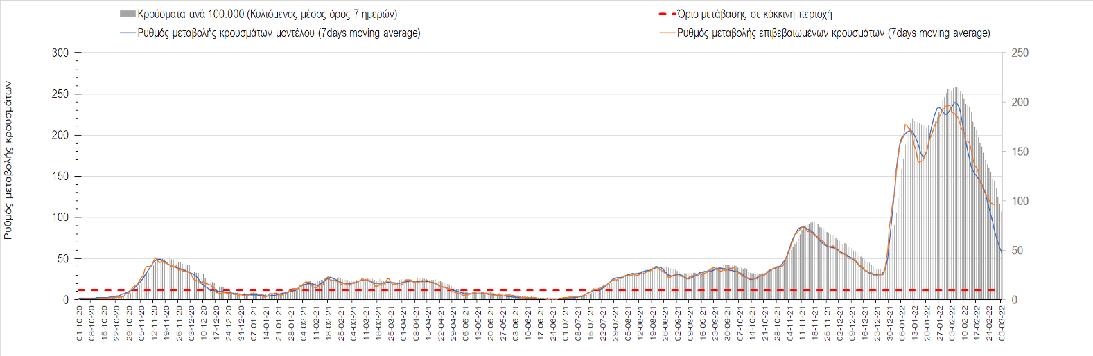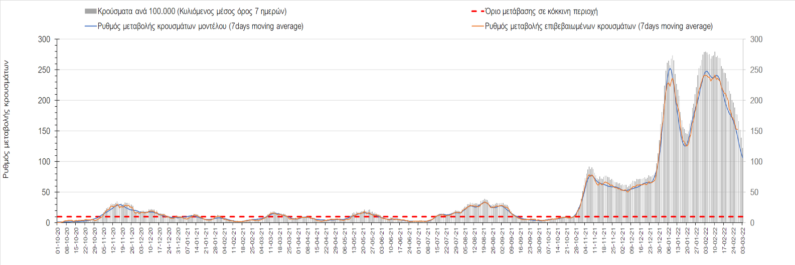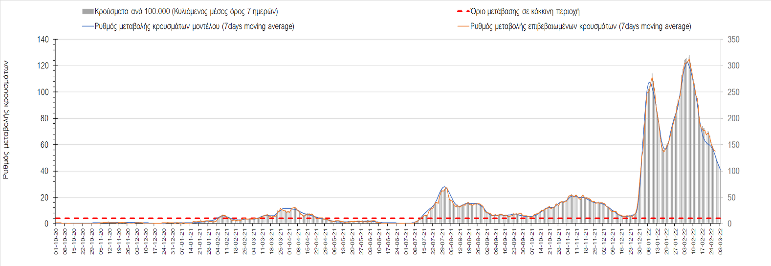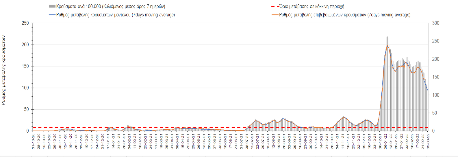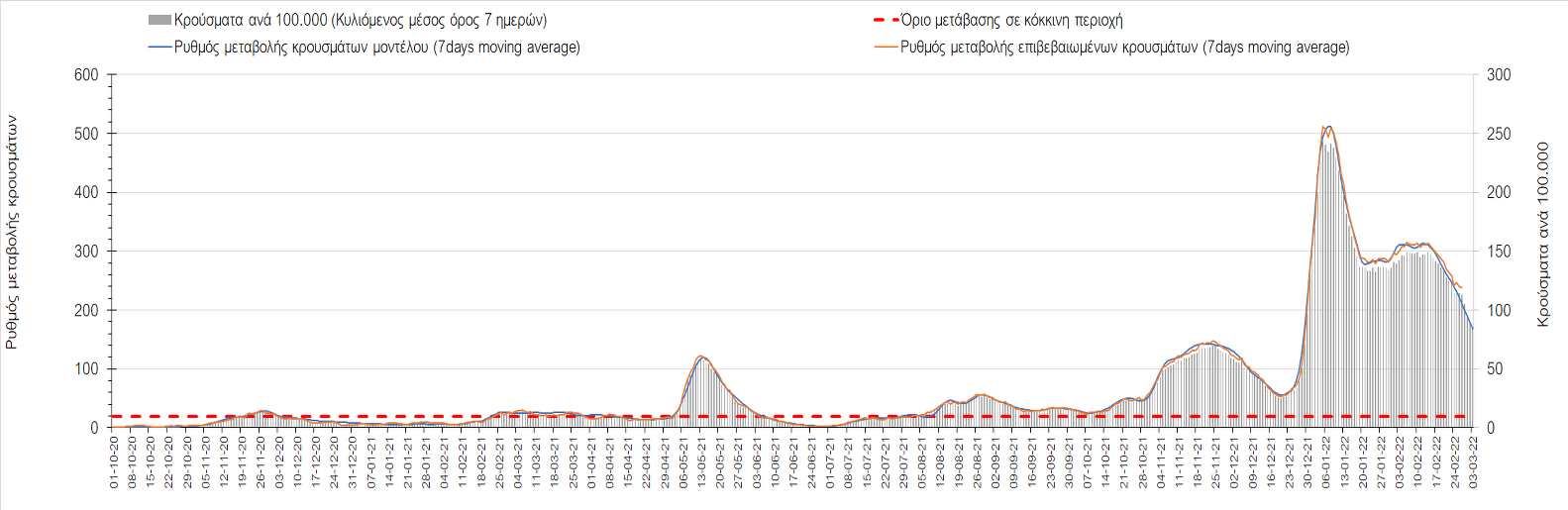 Η αποτύπωση των τάσεων στις επιμέρους περιοχές, παρουσιάζεται στο Σχήμα 61, όπου παρουσιάζεται ο ρυθμός μεταβολής των νέων κρουσμάτων ανά 100.000 κατοίκους (κυλιόμενος μέσος όρος 7 ημερών) των επιμέρους περιοχών. Θετικές τιμές του ρυθμού μεταβολής υποδηλώνουν άνοδο, ενώ αρνητικές τιμές υποδηλώνουν πτωτική πορεία.