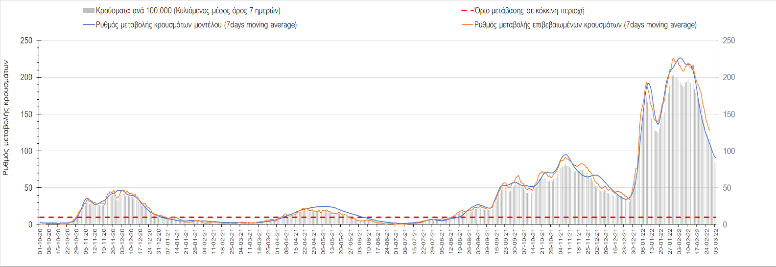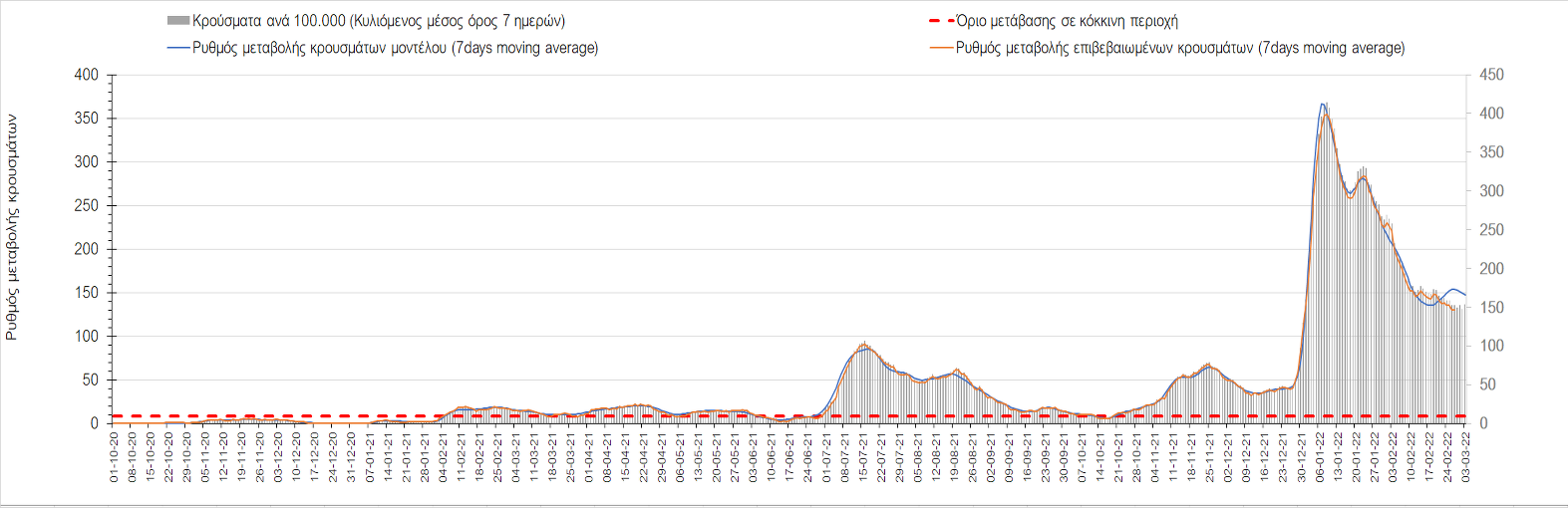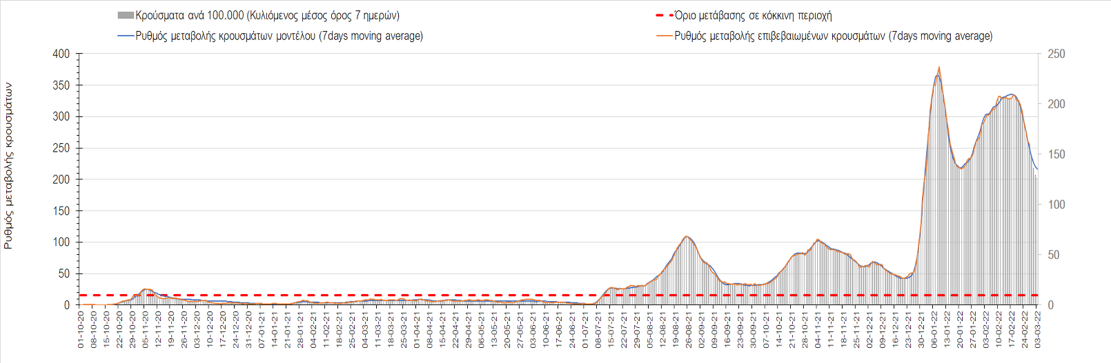Σχήμα 4. Πορεία του ημερησίου αριθμού των κρουσμάτων (κυλιόμενος μέσος όρος 7 ημερών) στην Ελληνική επικράτεια