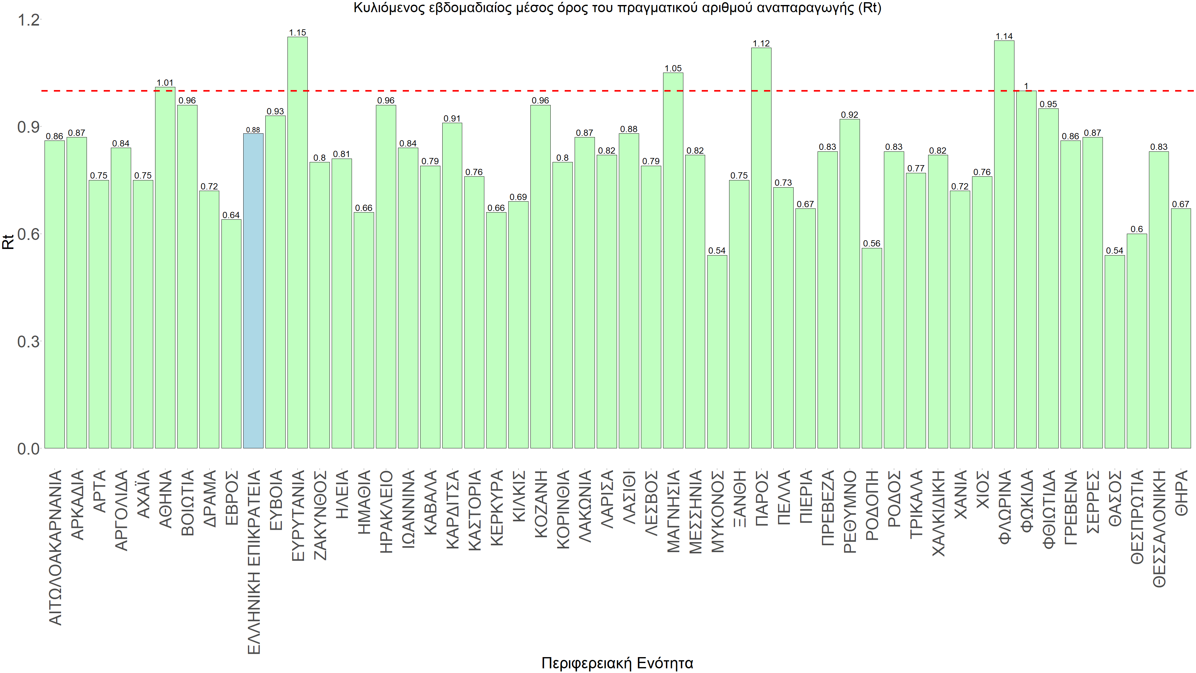 O πραγματικός αριθμός αναπαραγωγής Rt ανά περιφερειακή ενότητα της χώρας παρουσιάζεται στο Σχήμα 58.