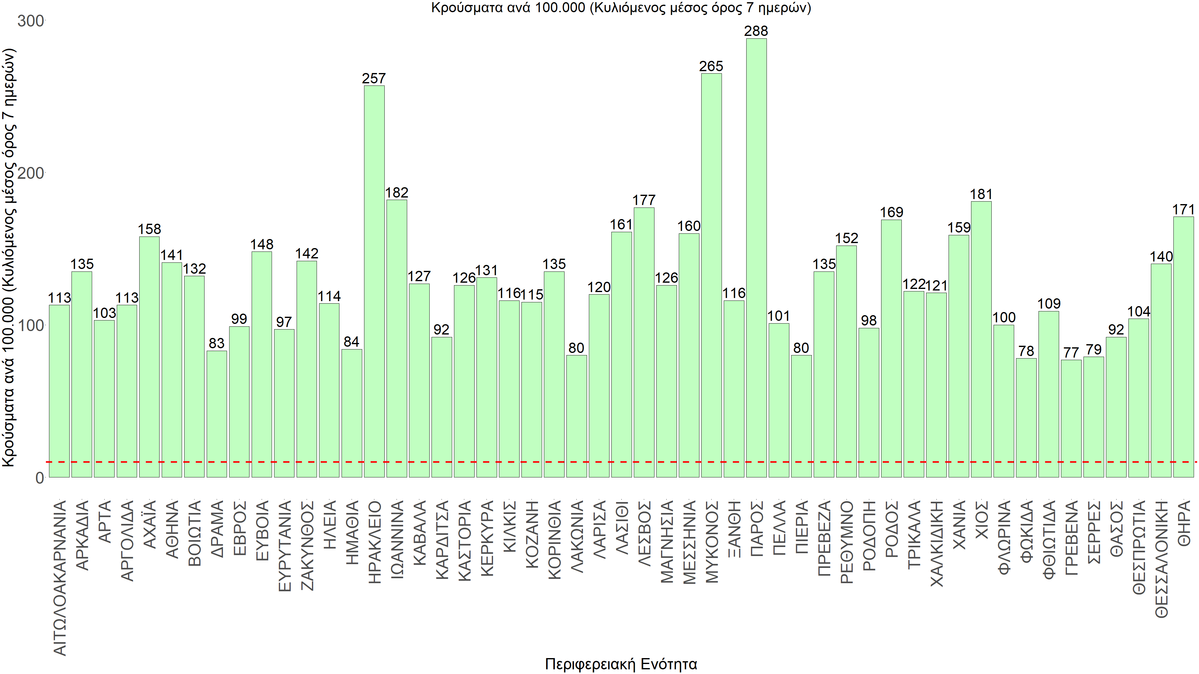 Σχήμα 60. Συγκεντρωτική εικόνα των νέων κρουσμάτων ανά 100.000 κατοίκους (κυλιόμενος μέσος όρος 7 ημερών) των επιμέρους περιοχών