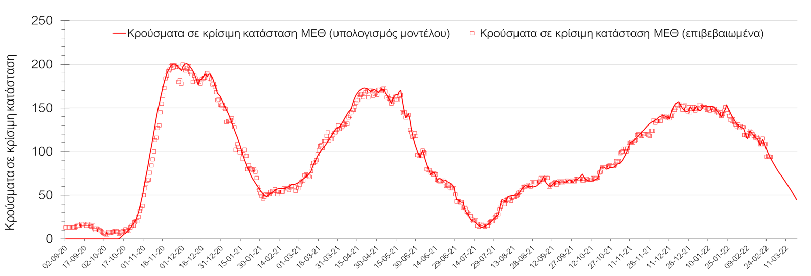 Σχήμα 1. Αριθμός κρουσμάτων σε κρίσιμη κατάσταση (ΜΕΘ) σύμφωνα με τα στοιχεία του ΕΟΔΥ και τις προβλέψεις της υπολογιστικής πλατφόρμας CORE.
